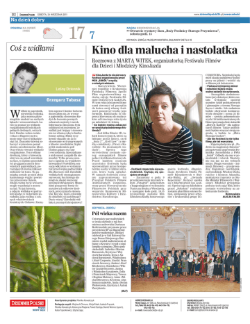 www.dziennikpolski24.pl/nowosadecki SOBOTA, 24 WRZEŚNIA 2011 B2 Na dzień dobry 17 7 POGODA NA DZIEŃ I NOC Coś z widłami NASZA REKOMENDACJA ►►Otwarcie wystawy ikon „Boży Posłańcy Starego Przymierza”, sobota godz. 15 KRYNICA–ZDRÓJ, MUZEUM NIKIFORA, BULWARY DIETLA 19 Kino dla malucha i nastolatka DP KinoJazda to nie pierwszy festiwal organizowany przez MCK „SOKÓŁ” z myślą o młodych widzach. – Rzeczywiście. Wcześniej wspólnie z Krakowską Fundacją Filmową Apollo Film organizowaliśmy sądecką edycję Festiwalu Filmów Dziecięcych GALICJA. W tym roku postanowiliśmy sami stworzyć od początku do końca swój własny festiwal i poszerzyć trochę jego formułę. KinoJazda to impreza kierowana do maluszków od trzeciego roku życia po młodzież 16–letnią. – Co będzie można zobaczyć w ramach pięciodniowego festiwalu? – Jest kilka filmów 3D, takich komercyjnych, które są lubiane przez dzieci, czyli „Auta 2”, „Król Lew” i z myślą o młodzieży „Piraci z Karaibów: Na nieznanych wodach”. Oprócz tego wyświetlony zostanie szereg europejskich filmów pełno i krótkometrażowych. Przed każdym seansem uczestnicy festiwalu będą wprowadzani przez kompetentne osoby w klimat obrazów, które będą oglądać. W ramach festiwalu zostanie zaprezentowany też Przegląd Polskich Filmów Animowanych zorganizowany przez Stowarzyszenie Filmowców Polskich przy wsparciu finansowym Ministerstwa Kultury i Dziedzictwa Narodowego. Leśny Dziennik Grzegorz Tabasz W idłak to paprotnik, niewielka roślinka, jaka można gdzie niegdzie znaleźć na suchych łąkach i wrzosowiskach. Łatwo ją poznać po widlasto rozgałęzionych łodyżkach pełnych drobnych, ostrych liści. Bardzo wolno rośnie i okaz o długości metra może mieć liczyć kilkadziesiąt lat. Znacznie łatwiej zobaczyć wyniesione ponad ziemię zarodnionośne kłosy. Oczywiście również widlasto rozgałęzione. Ten roślinny drobiazg, który z łatwością ukrywa się przed wzrokiem na łące, to nędzne pozostałości po gigantycznych drzewiastych paprotnikach, porastających ziemię kilkaset milionów lat temu. Na pamiątkę zostały po nich złoża kamiennego węgla i powietrze przesycone tlenem, dzięki czemu życie wreszcie mogło wypełznąć z morza na ląd. To już historia, a zdjęcie widlaka wypatrzyłem kiedyś w zielarskim poradniku, jako roślinę o cennych właściwościach leczniczych. Ciekawe. Zaczą- łem szperać i koniec końcem doczytałem się, że wywar z paprotnika stosowano kiedyś do leczenia pewnych schorzeń wątroby i nerek. Informacja okraszona była solidnym ostrzeżeniem, że widłak jest trujący i stosowanie na własną rękę to karkołomny zabieg. Mniej ryzykowne okazało się za to stosowanie wytrzepywanych z kłosów zarodników. Sypki pyłek znakomicie goił trudno gojące się rany i owrzodzenia. Sporządzano z nich nawet zasypki dla niemowląt. Tylko proszę uważać z ogniem: są wyjątkowo łatwopalne! Prawdziwą sensację odkryłem w wydanym tuż przed wojną podręczniku dla zbieraczy ziół. Zarodniki widłaka były strategicznym surowcem, bez którego nie mógł się obejść ówczesny przemysł zbrojeniowy. Miano nimi posypywać formy do metalowych odlewów drobnych, precyzyjnych elementów. Kto wie, może celowniki do dział lub coś podobnego? Dacie wiarę? Zarodniki widłaka i przemysł zbrojeniowy! FOT. (ALF) Rozmowa z MARTĄ WITEK, organizatorką Festiwalu Filmów dla Dzieci i Młodzieży KinoJazda – Festiwal rozpocznie się w poniedziałek. Szykują się specjalne atrakcje? – Zaczniemy o godz. 9 przedstawieniem interaktywnym „Fotograf”, połączonym z happeningiem w wykonaniu Teatru na Bruku z Wrocławia, a następnie koło godz. 10.15 wyświetlony zostanie film Zdzisława Kudły, honorowego gościa festiwalu, długoletniego dyrektora Studia Filmów Rysunkowych w Bielsku–Białej, pt. „Gwiazda Kopernika”. Reżyser spotka się z dziećmi przed i po seansie. Oprócz tego na dziedzińcu przed „Sokołem” rozłożony zostanie plan filmu science fiction, animowany przez artystów z krakowskiej grupy LO- COMOTORA. Najmłodsi będą mieli okazję podpatrzeć kulisy pracy na planie i wcielić się w filmowych bohaterów. – Podczas tej imprezy dzieci i młodzież będzie miała ważne zadanie do wykonania. – Szczególnie siedmioosobowe jury dziecięce, które zostało wyłonione spośród uczniów szkół podstawowych i gimnazjów z terenu Nowego Sącza i okolic. Ich zadaniem będzie obejrzenie konkursowych obrazów i ocena 24 filmów – sześciu pełnometrażowych i 18 krótkometrażowych. Dzieci przyznają dwie statuetki „Złotych Kadrów” dla najlepszych filmów. Także publiczność będzie wręczać swoją nagrodę, a będzie to „Złota Stonoga Gustaw”. – Ale ten festiwal to nie tylko filmy, ale też warsztaty. – Zajęcia plastyczne pt. „Podróże na magicznej chmurze” przygotowała i poprowadzi Dominika Jarmolińska z BWA „Sokół”. Odbędą się one w poniedziałek i wtorek. Niestety, nie ma już na nie wolnych miejsc. Drugie warsztaty – animacji filmowej – przeprowadzą: Eugeniusz Gordziejuk, szef produkcji, Wiesław Zięba, reżyser i Szymon Adamski, montażysta i operator ze Studia Miniatur Filmowych z Warszawy. Młodzież przygotuje podczas tych zajęć film, który zostanie wyświetlony na zakończenie festiwalu. Rozmawiała ALICJA FAŁEK KRYNICA–ZDRÓJ Czternaście par małżeńskich w środę odebrało z rąk burmistrza uzdrowiska Dariusza Reśki medale przyznane przez prezydenta RP za długoletnie pożycie małżeńskie. Jubilaci odebrali je w Sali Balowej Starego Domu Zdrojowego. Burmistrz rozdał małżeństwom albumy o Krynicy i wypił z nimi lampkę szampana. Złote gody obchodzili: Ludwika i Marian Baranowie, Krystyna i Wojciech Baranowie, Irena i Andrzej Boroniowie, Władysława i Józef Czopowie, Józefa i Franciszek Jaworscy, Janina i Józef Kłoskowscy, Stanisława i 