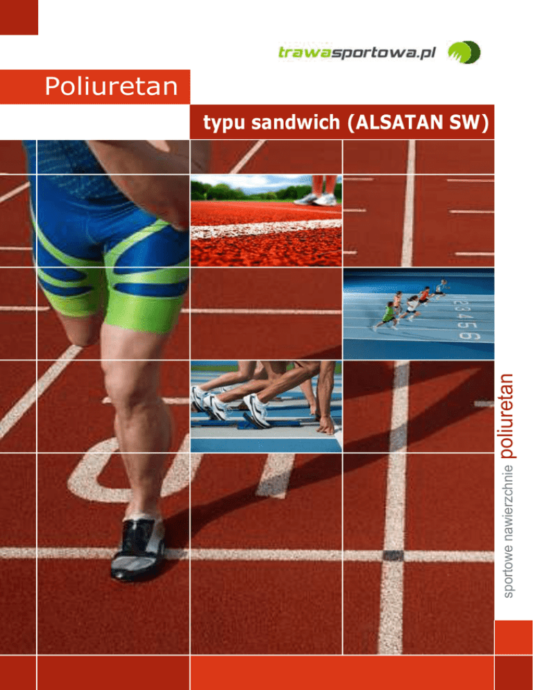 Poliuretan sportowe nawierzchnie poliuretan typu sandwich (ALSATAN SW) ALSATAN SW jest to nawierzchnia nieprzepuszczalna, znajdująca zastosowanie przede wszystkim na bieżniach. Nadaje się do uprawiania lekkoatletyki, jest niezwykle trwała i odporna na ścieranie oraz kolce. opis warstw Nawierzchnia składa się z dwóch warstw: warstwy spodniej o grubości 10mm, złożonej z polimerycznie związanego granulatu gumowego SBR 1-4 mm i warstwy wykończeniowej - wylanej warstwy farby poliuretanowej zasypanej granulatem EPDM na zaszpachlowanej poprzedniej warstwie. Kolor warstwy wykończeniowej może być dobrany w zależności od życzeń klienta. Dzięki optymalnie dobranym składnikom nawierzchni uzyskuje się produkt mający optymalne biomechaniczne i biochemiczne właściwości. Oczywiście, jest on odporny również na niekorzystne warunki atmosferyczne. Nawierzchnię typu ALSATAN SW układa się przede wszystkim na warstwie asfaltobetonu. Grubość warstwy ALSATAN SW: 13 mm. Warunki wykonywania nawierzchni: > > > > > temperatura minimalna: 10 0C temperatura maksymalna: 40 0C, brak opadów atmosferycznych, wilgotność podłoża: max 3 %, temperatura nie powinna spaść poniżej 5 0C nawet w nocy. Właściwości nawierzchni: > > > > > > nawierzchnia może być użytkowana w ciągu całego roku, zapewnia maksymalną ochronę stawów zawodników, ma wysoką odporność na ścieranie, kłucie i rozrywanie, znakomita przyczepność, najwyższa jakość i trwałość, niezwykła łatwość w utrzymaniu. www.trawasportowa.pl tel. 41 344 57 79 fax 41 260 73 60 [email protected] Materiały wchodzące w skład nawierzchni: 1) poliuretanowy preparat gruntujący Stobielast S100, 2) klej poliuretanowy jednoskładnikowy Stobielast S131 – do wiązania granulatu gumowego SBR w warstwie spodniej, 3) granulat gumowy SBR frakcji 1 – 4 mm, 4) farba poliuretanowa Stobielast S125 oraz mączka EPDM jako warstwa szpachli, 4) farba poliuretanowa jednoskładnikowa Stobielast S123 – do wiązania granulatu EPDM w warstwie wierzchniej, 5) granulat EPDM frakcji 1– 4 mm, Wykonanie nawierzchni. Ocena nawierzchni Po wykonaniu w/w prac nawierzchnia powinna: - mieć jednakową grubość, - powinna posiadać jednolity kolor, - nawierzchnia wylewana ze względów technologicznych posiada naturalną chropowatość i niejednorodność, - powstałe łączenia wynikające z technologii instalacji nawierzchni układarką powinny być liniami prostymi, bez uskoków utrudniających późniejsze użytkowanie, - estetyka wykonania nawierzchni nie wpływa w żaden sposób na parametry wytrzymałościowe nawierzchni i w dużej mierze jest uzależniona od warunków w jakich jest wykonywana, czyli tem otoczenia oraz wilgotność. Podbudowa I WARIANT W/w warstwy układa się na uprzednio przygotowanej warstwie dynamicznej podbudowy ET, która układa się na podbudowie mineralnej (kruszywo). Warstwa elastyczna ET to mieszanina żwiru+granulatu SBR+klej Stobielast S131. Grubość warstwy waha się od 20 do 35mm, w zależności od wymagań inwestora. II WARIANT Podbudowa asfaltowa nieprzepuszczalna pod nawierzchnie poliuretanowe Jest to masa bitumiczna o ciągłym uziarnieniu typu beton asfaltowy. Do wytwarzania mieszanek asfaltowych stosowany jest asfalt D35/50 i D50/70. poliuretan sportowa nawierzchnia syntetyczna Podłoże pod nawierzchnię powinno być suche (max. 3% wilgotności), oczyszczone, wolne od substancji ropopochodnych oraz zagęszczone do wskaźnika I=1. Temperatura powietrza powinna mieścić się w zakresie od 10 do 40 0C. Wymagany brak opadów deszczu. Po zagruntowaniu podłoża odpowiednim preparatem następuje ułożenie warstwy spodniej. Warstwa spodnia powstaje przez wymieszanie (w specjalnym mieszadle) odpowiednich proporcji granulatu SBR i kleju, a następnie mechaniczne rozłożenie i wyprofilowanie powstałej mieszanki za pomocą rozkładarki (SMG Planomatic). Grubość tej warstwy wynosi ok. 10mm. Po rozłożeniu warstwę należy pozostawić aż do jej wyschnięcia i stwardnienia. (Czas schnięcia uzależniony jest od temp oraz wilgotności powietrza, średni czas to ok. 18 h). Następnie warstwę z SBR-u szpachluje się za pomocą farby poliuretanowej i mączki EPDM i pozostawia się do wyschnięcia. Materiał na warstwę wierzchnią powstaje przez wylanie farby poliuretanowej i zasypanie jej granulatem EPDM. Grubość warstwy wynosi ok. 3 mm. Po naniesieniu ostatniej warstwy należy pozostawić aż do jej wyschnięcia i stwardnienia. (Czas schnięcia uzależniony jest od temp oraz wilgotności powietrza, średni czas to ok. 18 h). Łączna grubość nawierzchni to ok. 13 mm. Informacje ogólne Warstwy wykonane z tworzyw sztucznych używane w budownictwie sportowym w środowisku zewnętrznym spełniają wiele wymagań i znajdują zastosowanie we wszystkich strefach klimatycznych. W celu utrzymania odpowiednich właściwości należy regularnie przynajmniej raz w roku dokonać konserwacji nawierzchni. Rodzaj i zakres konserwacji nawierzchni uzależniony jest od lokalnego stopnia zanieczyszczenia powietrza, zanieczyszczenia liśćmi i innymi biologicznymi odpadami jak również od stanu wyznaczonych miejsc sportowych. Należy zwrócić uwagę, że wszelkie czynności związane z konserwacją są konieczne, w przypadku wystąpienia roszczeń gwarancyjnych. Konserwacja Regularna konserwacja nawierzchni sportowych jest ważna w celu zapewnienia długiej żywotności powierzchni, zagwarantowania czystości oraz bezpieczeństwa w użytkowaniu dla wszystkich sportowców oraz zapewnienia dobrego stanu optycznego nawierzchni. Liście oraz igły z drzew nie powinny znajdować się przez dłuższy czas na nawierzchni, gdyż proces gnilny stanowi doskonałe podłoże do rozwoju mikroorganizmów, mszaków i alg. W przypadku powierzchni przepuszczalnych dla wody przepuszczalność uzależniona jest od odpowiednich czynności pielęgnacyjnych. Podstawowe czynności pielęgnacyjne: 1. Zamiatanie i usuwanie liści or