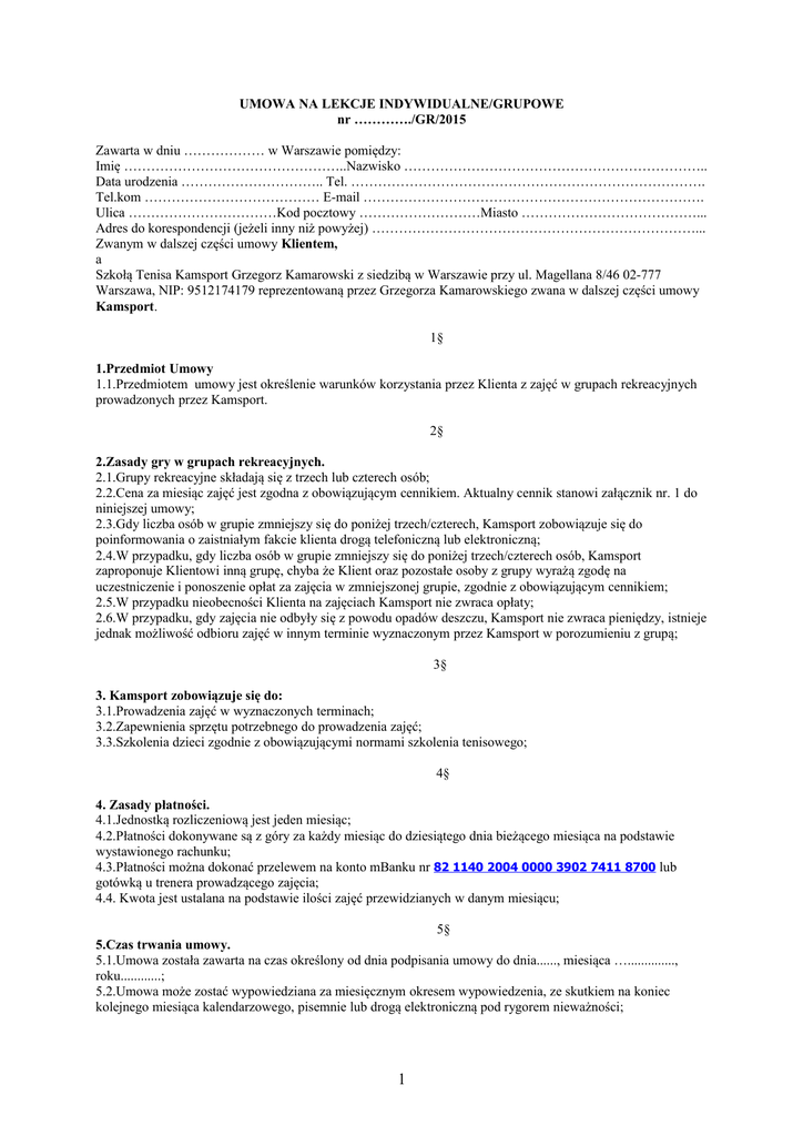 UMOWA NA LEKCJE INDYWIDUALNE/GRUPOWE nr …………./GR/2015 Zawarta w dniu ……………… w Warszawie pomiędzy: Imię …………………………………………..Nazwisko ………………………………………………………….. Data urodzenia ………………………….. Tel. ……………………………………………………………………. Tel.kom ………………………………… E-mail …………………………………………………………………. Ulica ……………………………Kod pocztowy ………………………Miasto …………………………………... Adres do korespondencji (jeżeli inny niż powyżej) ………………………………………………………………... Zwanym w dalszej części umowy Klientem, a Szkołą Tenisa Kamsport Grzegorz Kamarowski z siedzibą w Warszawie przy ul. Magellana 8/46 02-777 Warszawa, NIP: 9512174179 reprezentowaną przez Grzegorza Kamarowskiego zwana w dalszej części umowy Kamsport. 1§ 1.Przedmiot Umowy 1.1.Przedmiotem umowy jest określenie warunków korzystania przez Klienta z zajęć w grupach rekreacyjnych prowadzonych przez Kamsport. 2§ 2.Zasady gry w grupach rekreacyjnych. 2.1.Grupy rekreacyjne składają się z trzech lub czterech osób; 2.2.Cena za miesiąc zajęć jest zgodna z obowiązującym cennikiem. Aktualny cennik stanowi załącznik nr. 1 do niniejszej umowy; 2.3.Gdy liczba osób w grupie zmniejszy się do poniżej trzech/czterech, Kamsport zobowiązuje się do poinformowania o zaistniałym fakcie klienta drogą telefoniczną lub elektroniczną; 2.4.W przypadku, gdy liczba osób w grupie zmniejszy się do poniżej trzech/czterech osób, Kamsport zaproponuje Klientowi inną grupę, chyba że Klient oraz pozostałe osoby z grupy wyrażą zgodę na uczestniczenie i ponoszenie opłat za zajęcia w zmniejszonej grupie, zgodnie z obowiązującym cennikiem; 2.5.W przypadku nieobecności Klienta na zajęciach Kamsport nie zwraca opłaty; 2.6.W przypadku, gdy zajęcia nie odbyły się z powodu opadów deszczu, Kamsport nie zwraca pieniędzy, istnieje jednak możliwość odbioru zajęć w innym terminie wyznaczonym przez Kamsport w porozumieniu z grupą; 3§ 3. Kamsport zobowiązuje się do: 3.1.Prowadzenia zajęć w wyznaczonych terminach; 3.2.Zapewnienia sprzętu potrzebnego do prowadzenia zajęć; 3.3.Szkolenia dzieci zgodnie z obowiązującymi normami szkolenia tenisowego; 4§ 4. Zasady płatności. 4.1.Jednostką rozliczeniową jest jeden miesiąc; 4.2.Płatności dokonywane są z góry za każdy miesiąc do dziesiątego dnia bieżącego miesiąca na podstawie wystawionego rachunku; 4.3.Płatności można dokonać przelewem na konto mBanku nr 82 1140 2004 0000 3902 7411 8700 lub gotówką u trenera prowadzącego zajęcia; 4.4. Kwota jest ustalana na podstawie ilości zajęć przewidzianych w danym miesiącu; 5§ 5.Czas trwania umowy. 5.1.Umowa została zawarta na czas określony od dnia podpisania umowy do dnia......, miesiąca ….............., roku............; 5.2.Umowa może zostać wypowiedziana za miesięcznym okresem wypowiedzenia, ze skutkiem na koniec kolejnego miesiąca kalendarzowego, pisemnie lub drogą elektroniczną pod rygorem nieważności; 1 5.3.W przypadku, gdy czynność wymieniona w punkcie 5.2 nie została wykonana, Kamsport zastrzega sobie prawo do pobierania opłat za zajęcia do końca okresu, na jaki została podpisana umowa; 6§ 6. Postanowienia końcowe. 6.1.Wszelkie pytania i wątpliwości prosimy kierować pod nr tel: 608670361 lub e-mail: [email protected] 6.2.W sprawach nieuregulowanych niniejszą umową obowiązują przepisy Kodeksu Cywilnego; 6.3.Wszelkie zmiany umowy wymagają formy pisemnej pod rygorem nieważności; 6.4.Umowa została zawarta w dwóch jednobrzmiących egzemplarzach po jednym dla każdej ze stron. Wyrażam zgodę na umieszczenie moich danych osobowych w bazie danych Kamsport Grzegorz Kamarowski oraz na ich przetwarzanie zgodnie z ustawą z dnia 29.08.1997 r. o Ochronie Danych Osobowych (Dz.U.Nr 133 poz.833 z późn.zm) w celu realizacji umowy dotyczącej świadczenia usług oraz dla celów marketingowych Kamsport Grzegorz Kamarowski obecnie i w przyszłości. Oświadczam, iż zostałem poinformowany, iż przysługuje mi prawo dostępu do moich danych osobowych oraz ich poprawienia. Podanie powyższych danych jest dobrowolne. ……………………………………. (podpis uczestnika lub osoby reprezentującej) SZCZEGÓŁY REZERWACJI OBIEKT DZIEŃ TYGODNIA KORT GODZINA OBIEKT DZIEŃ TYGODNIA KORT GODZINA Załącznik nr 1 Cennik zajęć grupowych 2012: CENNIK ZAJĘĆ INDYWIDUALNYCH POJEDYŃCZA LEKCJA 75 zł/h CENNIK ZAJĘĆ INDYWIDUALNYCH – PAKIET 10 LEKCJI 649 zł CENNIK ZAJĘĆ GRUPOWYCH Grupa 4 os.- 1 raz w tygodniu 180 zł/os./mies. Grupa 3 os. - 1 raz w tygodniu 220 zł/os./mies. Grupa 4 os. - 2 razy w tygodniu 340 zł/os./mies. Grupa 3 os. – 2 razy w tygodniu 420 zł/os./mies. ……………………………………. (podpis pracownika Kamsport) ……………………………………. (podpis uczestnika lub osoby reprezentującej) 2