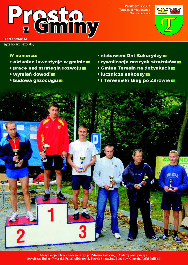 Październik 2007 Teresiński Miesięcznik Samorządowy ISSN 1509-9814 egzemplarz bezpłatny W numerze: ? aktualne inwestycje w gminie ? prace nad strategią rozwoju 3 ? wymień dowód! 3 ? budowa gazociągu 4 2 ? niebawem Dni Kukurydzy 7 ? rywalizacja naszych strażaków ? Gmina Teresin na dożynkach 6 ? łucznicze sukcesy 14 ? I Teresiński Bieg po Zdrowie 15 Klasyfikacja I Teresińskiego Biegu po Zdrowie (od lewej): Andrzej Andryszczyk, zwycięzca Hubert Wysocki, Paweł Albinowski, Patryk Skoczylas, Bogusław Cierech, Rafał Paliński 8 TERESIŃSKI MIESIĘCZNIK SAMORZĄDOWY W rozmowach towarzyskich dominuje obecnie tematyka przedwyborcza. Osobiście, coraz częściej dane mi słyszeć, że powinniśmy postawić się jak jeden i zbojkotować październikowe wybory jak nigdy i zamiast oddać głos pozostać cierpliwie w domach... Nic bardziej mylnego kochani – odpowiadam. Oddać głos to społeczny obowiązek, demokratyczna decyzja na wagę złota, trzeba iść i skreślić co nam, a raczej - kogo nam -rozsądek, nie serce podpowie! Zatem Drodzy Czytelnicy, spotkajmy się 21 października przy urnach, dokonajmy odpowiedniej decyzji, byśmy później wstydzić i złościć nie musieli się wspólnie! Marcin Odolczyk Redaktor prowadzący „Prosto z Gminy” Gminne inwestycje Mieszkańcy Ludwikowa mogą już pobierać wodę z nowo utworzonego wodociągu. Dobiegła bowiem końca oczekiwana przez nich budowa sieci wodociągowej wraz z przyłączami. Wykonano tu blisko dwukilometrowy rurociąg z rur ciśnieniowych PCV jak też wykonano przyłącza wodociągowe o łącznej długości blisko 400m. Wartość inwestycji to 88 786 zł. Wcześniej podobna inwestycja została ukończona w miejscowości Pawłowice. Rozbudowie uległa również sieć wodociągowa biegnąca wzdłuż nowo powstałych działek budowlanych od ulicy Spacerowej w Paprotni. *** Trwa rozbudowa i przebudowa budynku strażnicy Ochotniczej Straży Pożarnej w Szymanowie. Jest to pierwszy etap inwestycji, którego wykonawcą jest firma Macieja Liska z Pawłówka. Zakres prac obejmuje stan surowy zamknięty. To stadium inwestycji kosztować będzie gminę 168 360 zł. Zakładany termin realizacji zamówienia upływa w drugiej połowie grudnia tego roku. *** Po długich oczekiwaniach, kilku odwołanych przetargach rozpoczęła się wreszcie inwestycja termo-modernizacji budynku szkoły podstawowej w Szymanowie przy ulicy Szkolnej 35. Wykonania prac remontowych podjęła się sochaczewska firma INSTAL-TERM. Koszt zadania to 364 546 zł. Szczegółowy zakres prac obejmuje: dach – roboty rozbiórkowe i przygotowawcze, roboty pokryciowe w tym izolację poziomą cieplną z twardego styropianu, wykonanie instalacji odgromowej, elewacja – docieplenie ścian styropianem o grubości 12 cm. Wykonawca zobowiązał się do zakończenia realizacji zamówienia w terminie do końca listopada br. Mimo, że okres rozpoczęcia inwestycji nie koniecznie sprzyja pracy szkoły, to jednak warto wziąć pod uwagę, iż wreszcie jest firma, która podjęła się wykonania tego zadania. Dzięki temu najmłodsi uczniowie z Szymanowa z pewnością nie zmarzną podczas zimowej nauki. A to jest chyba w tym wszystkim najważniejsze... *** Koniec stycznia przyszłego roku to termin z pewnością bardzo oczekiwany przez społeczność szkolną w Budkach Piaseckich. Na ten okres bowiem gmina planuje zakończenie budowy hali sportowej przy szkole podstawowej. Firma INSTALATOR z Kampinosu, która jest wykonawcą trwającego obecnie drugiego etapu inwestycji zobowiązała się do realizacji robót wykończeniowych wraz z instalacjami wewnętrznymi oraz wyposażenia hali w sprzęt sportowy. Przypomnijmy, że niezbędny dla rozwoju fizycznego dzieci i młodzieży obiekt w Budkach Piaseckich będzie halą o wymiarach 14,75 x 24,30 wyposażoną między innymi w wysuwane trybuny teleskopowe oraz przystosowaną dla osób niepełnosprawnych. Zatem początek nowego roku kalendarzowego dla uczniów i nauczycieli z Budek Piaseckich zapowiada się nadzwyczaj miło, być może hala będzie spóźnionym, ale za to bardzo trafionym prezentem gwiazdkowym... /red/ (mo) Zapraszamy na stronę inter netową www.teresin.pl Wydawca: Urząd Gminy w Teresinie; Redakcja: Teresin, ul. Zielona 20, tel. (046) 86-138-15 do 17; Redaktor prowadzący: Marcin Odolczyk, tel. 0-691-277-424, e-mail: [email protected]; Opracowanie graficzne i druk: INTER...TEST 96-500 Sochaczew, ul. Mieszka I-go /6, tel.: 046 862 96 57, [email protected], www.it3.pl Redakcja nie zwraca tekstów nie zamówionych i zastrzega sobie prawo ich skracania. Za treść reklam redakcja nie ponosi odpowiedzialności. 2 Październik 2007 TERESIŃSKI MIESIĘCZNIK SAMORZĄDOWY Ku nowej strategii rozwoju Od siedemnastu lat mieszkańcy każdej polskiej gminy mają możliwość decydowania o swojej przyszłości. To przede wszystkim od ich wyboru i przyjętego stanowiska zależy, czy miejscowości na terenie gminy staną się na tyle atrakcyjne, że mieszkańcy w nich zostaną, a turyści chętnie odwiedzą. Jednym z ważnych etapów budowy strategii rozwoju gminy jest uspołecznienie procesu budowy strategii. Stąd spotkanie jakie odbyło się 17 września w świetlicy Szkoły Podstawowej w Teresinie. Gościem specjalnym spotkania był dr Marek Ziółkowski, przedstawiciel zespołu ze Szkoły Głównej Handlowej w Warszwie, który podjął się opracowania dokumentu dla Gminy Teresin. W dyskusji udział brali m.in. przedstawiciele władzy gminnej i powiatowej, pracownicy Urzędu Gminy, mieszkańcy, sołtysi, przedsiębiorcy z terenu gminy Teresin. „STRATEGIA ZRÓWNOWAŻONEGO ROZWOJU GMINY TERESIN DO 2020 ROKU” będzie określała cele rozwoju i niezbędne zadania realizacyjne, których skuteczna realizacja przyczyniać się będzie do poprawy warunków życia mieszkańców i funkcjonowania podmiotów gospodarczych. Zapisy tego dokumentu będą dostosowane do celów i priorytetów zawartych w polityce regionalnej Unii Europe