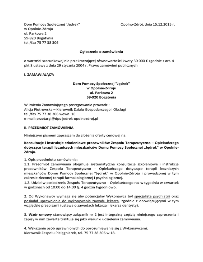 Dom Pomocy Społecznej "Jędrek" w Opolnie-Zdroju ul. Parkowa 2 59-920 Bogatynia tel./fax 75 77 38 306 Opolno-Zdrój, dnia 15.12.2015 r. Ogłoszenie o zamówieniu o wartości szacunkowej nie przekraczającej równowartości kwoty 30 000 € zgodnie z art. 4 pkt 8 ustawy z dnia 29 stycznia 2004 r. Prawo zamówień publicznych I. ZAMAWIAJĄCY: Dom Pomocy Społecznej "Jędrek" w Opolnie-Zdroju ul. Parkowa 2 59-920 Bogatynia W imieniu Zamawiającego postępowanie prowadzi: Alicja Piotrowska – Kierownik Działu Gospodarczego i Obsługi tel./fax 75 77 38 306 wewn. 16 e-mail: [email protected] II. PRZEDMIOT ZAMÓWIENIA Niniejszym pismem zapraszam do złożenia oferty cenowej na: Konsultacje i instrukcje szkoleniowe pracowników Zespołu Terapeutyczno – Opiekuńczego dotyczące terapii leczniczych mieszkańców Domu Pomocy Społecznej „Jędrek” w OpolnieZdroju. 1. Opis przedmiotu zamówienia: 1.1. Przedmiot zamówienia obejmuje systematyczne konsultacje szkoleniowe i instrukcje pracowników Zespołu Terapeutyczno - Opiekuńczego dotyczące terapii leczniczych mieszkańców Domu Pomocy Społecznej “Jędrek” w Opolnie-Zdroju i prowadzonej w tym zakresie zleconej terapii farmakologicznej i psychologicznej. 1.2. Udział w posiedzeniu Zespołu Terapeutyczno – Opiekuńczego raz w tygodniu w czwartek w godzinach od 10:00 do 14:00 tj. 4 godzin tygodniowo. 2. Od Wykonawcy wymaga się aby potencjalny Wykonawca był specjalistą psychiatrii oraz posiadał uprawnienia do wykonywania zawodu lekarza, zgodnie z obowiązującymi w tym względzie przepisami (ustawa o zawodach lekarza i lekarza dentysty). 3. Wzór umowy stanowiący załącznik nr 2 jest integralną częścią niniejszego zaproszenia i zapisy w nim zawarte traktuje się jako warunki udzielenia zamówienia. 4. Wskazanie osób uprawnionych do porozumiewania się z Wykonawcami: Kierownik Zespołu Pielęgniarek, tel. 75 77 38 306 w.18. III. DANE DOTYCZĄCE ZŁOŻENIA OFERTY 1. Oferta winna zawierać całość przedmiotu zamówienia. 2. Ofertę należy sporządzić na Formularzu oferty stanowiącym załącznik nr 1 do Zapytania ofertowego. 3. Każdy z Wykonawców może złożyć tylko jedną ofertę. Oferta musi byś sporządzona w formie pisemnej, czytelnie w sposób trwały. 4. Oferta musi być podpisana przez osobę/y upoważnioną/e do reprezentowania Wykonawcy. 5. Zaleca się dołączyć do oferty aktualny odpis z właściwego rejestru lub centralnej ewidencji i informacji o działalności gospodarczej, jeżeli odrębne przepisy wymagają wpisu do rejestru lub ewidencji. W sytuacji gdy Wykonawca nie przedłoży ww. dokumentu, Zamawiający przed podpisaniem umowy zwrócił się o jego przedłożenie. 6. Ofertę należy złożyć w formie pisemnej, osobiście w siedzibie Zamawiającego tj. w Domu Pomocy Społecznej "Jędrek" w Opolnie-Zdroju, ul. Świerczewskiego 2, budynek biur, sekretariat, w terminie: nie później niż do dnia 22.12.2015 r. do godz. 13:00. IV. Termin realizacji zamówienia: od 01.01.2016 r. do 31.12.2016 r. V. WYBOR OFERTY: 1. Przy wyborze najkorzystniejszej oferty, Zamawiający będzie się kierował następującym kryterium: cena ofertowa. Cena ofertowa winna obejmować wszystkie koszty związane z realizacją zamówienia. Za cenę oferty uważać się będzie cenę brutto ( łącznie z należnym podatkiem VAT). 2. Wykonawca zostanie poinformowany o dokonanym wyborze. VI. Tryb postępowania: ROZPOZNANIE CENOWE. VII. INFORMACJE DOTYCZĄCE UMOWY 1. Istotne postanowienia umowy zawiera załączony wzór Umowy – zał. Nr 2. 2. Wykonawca, który złoży ofertę najkorzystniejszą będzie zobowiązany do podpisania umowy w terminie uzgodnionym przez Zamawiającego. Załączniki: 1. Formularz oferty – załącznik nr 1 2. Wzór umowy załącznik nr 2 Zatwierdził: Z up. Dyrektora Domu Pomocy Społecznej „Jędrek" w Opolnie-Zdroju Ewelina Nietrzeba