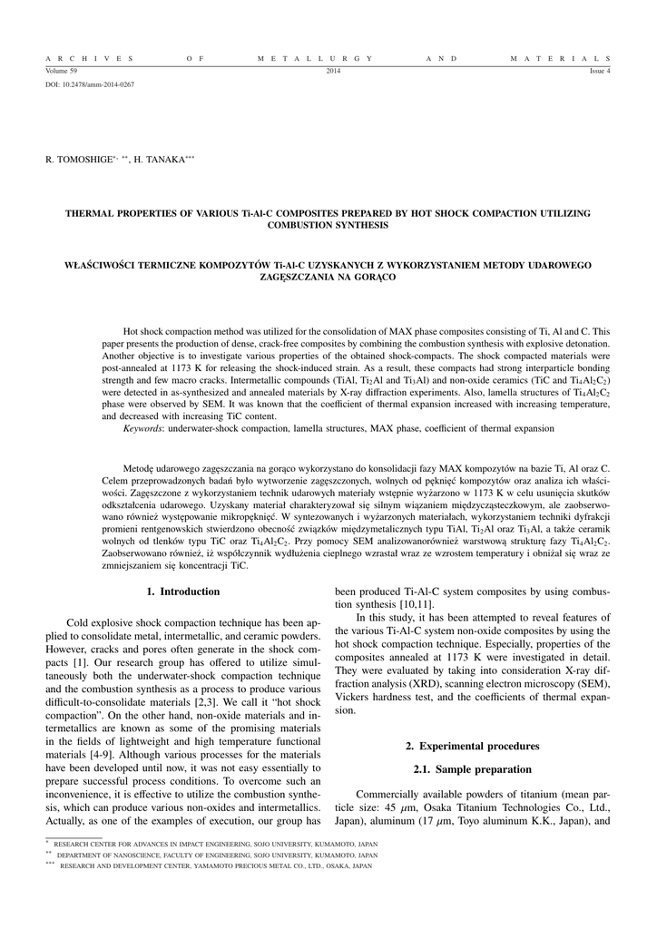 A R C H I V E S O F M E T A L L Volume 59 U R G Y A N D M A T 2014 E R I A L S Issue 4 DOI: 10.2478/amm-2014-0267 R. TOMOSHIGE∗, ∗∗ , H. TANAKA∗∗∗ THERMAL PROPERTIES OF VARIOUS Ti-Al-C COMPOSITES PREPARED BY HOT SHOCK COMPACTION UTILIZING COMBUSTION SYNTHESIS WŁAŚCIWOŚCI TERMICZNE KOMPOZYTÓW Ti-Al-C UZYSKANYCH Z WYKORZYSTANIEM METODY UDAROWEGO ZAGĘSZCZANIA NA GORĄCO Hot shock compaction method was utilized for the consolidation of MAX phase composites consisting of Ti, Al and C. This paper presents the production of dense, crack-free composites by combining the combustion synthesis with explosive detonation. Another objective is to investigate various properties of the obtained shock-compacts. The shock compacted materials were post-annealed at 1173 K for releasing the shock-induced strain. As a result, these compacts had strong interparticle bonding strength and few macro cracks. Intermetallic compounds (TiAl, Ti2 Al and Ti3 Al) and non-oxide ceramics (TiC and Ti4 Al2 C2 ) were detected in as-synthesized and annealed materials by X-ray diffraction experiments. Also, lamella structures of Ti4 Al2 C2 phase were observed by SEM. It was known that the coefficient of thermal expansion increased with increasing temperature, and decreased with increasing TiC content. Keywords: underwater-shock compaction, lamella structures, MAX phase, coefficient of thermal expansion Metodę udarowego zagęszczania na gorąco wykorzystano do konsolidacji fazy MAX kompozytów na bazie Ti, Al oraz C. Celem przeprowadzonych badań było wytworzenie zagęszczonych, wolnych od pęknięć kompozytów oraz analiza ich właściwości. Zagęszczone z wykorzystaniem technik udarowych materiały wstępnie wyżarzono w 1173 K w celu usunięcia skutków odkształcenia udarowego. Uzyskany materiał charakteryzował się silnym wiązaniem międzycząsteczkowym, ale zaobserwowano również występowanie mikropęknięć. W syntezowanych i wyżarzonych materiałach, wykorzystaniem techniki dyfrakcji promieni rentgenowskich stwierdzono obecność związków międzymetalicznych typu TiAl, Ti2 Al oraz Ti3 Al, a także ceramik wolnych od tlenków typu TiC oraz Ti4 Al2 C2 . Przy pomocy SEM analizowanorównież warstwową strukturę fazy Ti4 Al2 C2 . Zaobserwowano również, iż współczynnik wydłużenia cieplnego wzrastał wraz ze wzrostem temperatury i obniżał się wraz ze zmniejszaniem się koncentracji TiC. 1. Introduction Cold explosive shock compaction technique has been applied to consolidate metal, intermetallic, and ceramic powders. However, cracks and pores often generate in the shock compacts [1]. Our research group has offered to utilize simultaneously both the underwater-shock compaction technique and the combustion synthesis as a process to produce various difficult-to-consolidate materials [2,3]. We call it “hot shock compaction”. On the other hand, non-oxide materials and intermetallics are known as some of the promising materials in the fields of lightweight and high temperature functional materials [4-9]. Although various processes for the materials have been developed until now, it was not easy essentially to prepare successful process conditions. To overcome such an inconvenience, it is effective to utilize the combustion synthesis, which can produce various non-oxides and intermetallics. Actually, as one of the examples of execution, our group has ∗ been produced Ti-Al-C system composites by using combustion synthesis [10,11]. In this study, it has been attempted to reveal features of the various Ti-Al-C system non-oxide composites by using the hot shock compaction technique. Especially, properties of the composites annealed at 1173 K were investigated in detail. They were evaluated by taking into consideration X-ray diffraction analysis (XRD), scanning electron microscopy (SEM), Vickers hardness test, and the coefficients of thermal expansion. 2. Experimental procedures 2.1. Sample preparation Commercially available powders of titanium (mean particle size: 45 µm, Osaka Titanium Technologies Co., Ltd., Japan), aluminum (17 µm, Toyo aluminum K.K., Japan), and RESEARCH CENTER FOR ADVANCES IN IMPACT ENGINEERING, SOJO UNIVERSITY, KUMAMOTO, JAPAN ∗∗ ∗∗∗ DEPARTMENT OF NANOSCIENCE, FACULTY OF ENGINEERING, SOJO UNIVERSITY, KUMAMOTO, JAPAN RESEARCH AND DEVELOPMENT CENTER, YAMAMOTO PRECIOUS METAL CO., LTD., OSAKA, JAPAN 1576 graphite (1-2 µm, Sigma-Aldrich Co., USA) were used as raw materials. Ti-Al-C composites were synthesized according to the following reaction, T i + xAl + (1 − x)C → xT iAl + (1 − x)T iC, (1) where, x has a range from 0 to 1.0. Each powder mixture according to the Equation (1) was wet-mixed in ethanol for 1 h, fully dried and then was tapped into the powder container with a cylindrical hole having 20 mm in diameter and 40 mm in height, as shown in Fig. 1. The combustion synthesis was initiated by passing electric current with electric power of 0.6 kVA for 5 s through a tungsten heating coil under atmospheric pressure at room temperature. before the explosion. The shock compaction was carried out after 10 to 25 seconds from the initiation of combustion synthesis, depending on their compositions. The obtained shock compacts were subject to post-annealing treatments at 1173 K for 2 hours under vacuum of 10−5 torr (1.33×10−3 Pa). 2.4. Characterization and observations The compacted samples were evaluated using the XRD analysis (XRD, RAD-1B, Rigaku Co., Japan), Vickers hardness (load of 4.9 N for 15 sec, NT-M0001, Shimadzu Corp., Japan), and SEM observations (JSM-6301F, JEOL, Japan). The specimens for hardness tests were embedded in the resin and next polished. The properties of thermal expansion were investigated in the temperature region from 473K to 1173K under vacuum of about 10−2 torr with the equipment (formastor-F, Fuji Electronic Industrial Co., Ltd, Japan). Prior to the investigation, columnar specimens (3 mm in diameter, 10 mm in length) for t