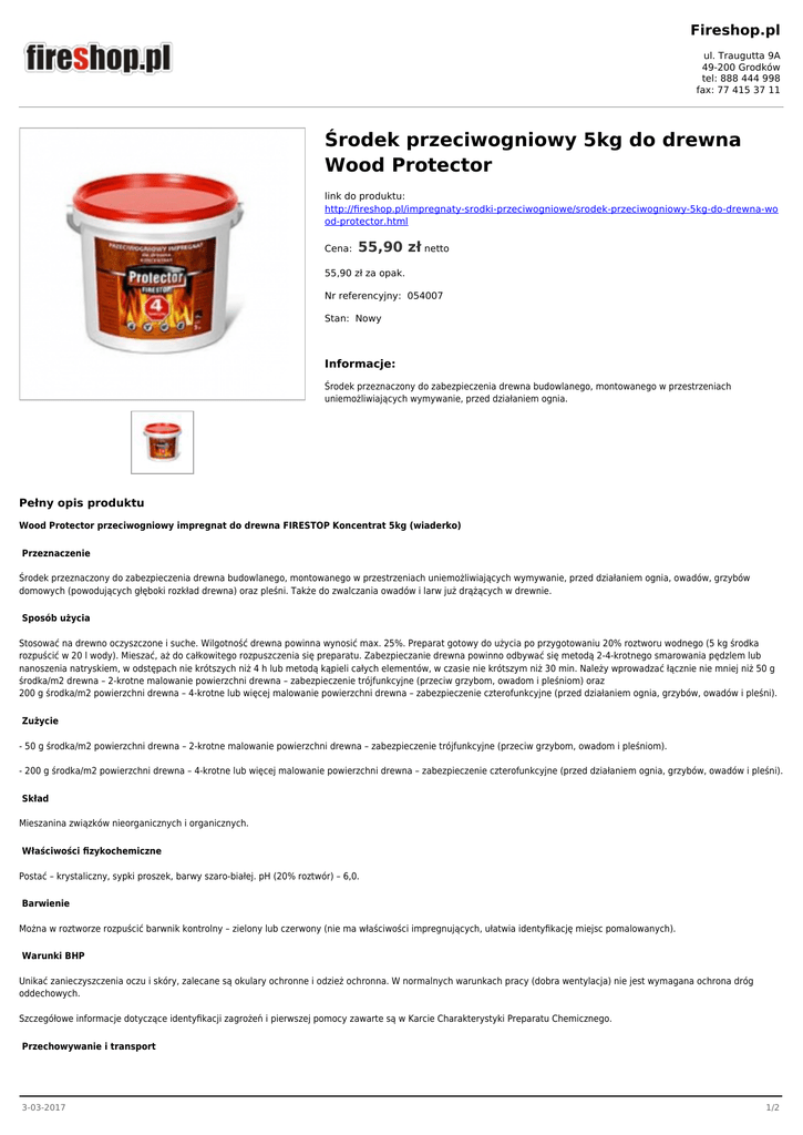 Fireshop.pl ul. Traugutta 9A 49-200 Grodków tel: 888 444 998 fax: 77 415 37 11 Środek przeciwogniowy 5kg do drewna Wood Protector link do produktu: http://fireshop.pl/impregnaty-srodki-przeciwogniowe/srodek-przeciwogniowy-5kg-do-drewna-wo od-protector.html Cena: 55,90 zł netto 55,90 zł za opak. Nr referencyjny: 054007 Stan: Nowy Informacje: Środek przeznaczony do zabezpieczenia drewna budowlanego, montowanego w przestrzeniach uniemożliwiających wymywanie, przed działaniem ognia. Pełny opis produktu Wood Protector przeciwogniowy impregnat do drewna FIRESTOP Koncentrat 5kg (wiaderko) Przeznaczenie Środek przeznaczony do zabezpieczenia drewna budowlanego, montowanego w przestrzeniach uniemożliwiających wymywanie, przed działaniem ognia, owadów, grzybów domowych (powodujących głęboki rozkład drewna) oraz pleśni. Także do zwalczania owadów i larw już drążących w drewnie. Sposób użycia Stosować na drewno oczyszczone i suche. Wilgotność drewna powinna wynosić max. 25%. Preparat gotowy do użycia po przygotowaniu 20% roztworu wodnego (5 kg środka rozpuścić w 20 l wody). Mieszać, aż do całkowitego rozpuszczenia się preparatu. Zabezpieczanie drewna powinno odbywać się metodą 2-4-krotnego smarowania pędzlem lub nanoszenia natryskiem, w odstępach nie krótszych niż 4 h lub metodą kąpieli całych elementów, w czasie nie krótszym niż 30 min. Należy wprowadzać łącznie nie mniej niż 50 g środka/m2 drewna – 2-krotne malowanie powierzchni drewna – zabezpieczenie trójfunkcyjne (przeciw grzybom, owadom i pleśniom) oraz 200 g środka/m2 powierzchni drewna – 4-krotne lub więcej malowanie powierzchni drewna – zabezpieczenie czterofunkcyjne (przed działaniem ognia, grzybów, owadów i pleśni). Zużycie - 50 g środka/m2 powierzchni drewna – 2-krotne malowanie powierzchni drewna – zabezpieczenie trójfunkcyjne (przeciw grzybom, owadom i pleśniom). - 200 g środka/m2 powierzchni drewna – 4-krotne lub więcej malowanie powierzchni drewna – zabezpieczenie czterofunkcyjne (przed działaniem ognia, grzybów, owadów i pleśni). Skład Mieszanina związków nieorganicznych i organicznych. Właściwości fizykochemiczne Postać – krystaliczny, sypki proszek, barwy szaro-białej. pH (20% roztwór) – 6,0. Barwienie Można w roztworze rozpuścić barwnik kontrolny – zielony lub czerwony (nie ma właściwości impregnujących, ułatwia identyfikację miejsc pomalowanych). Warunki BHP Unikać zanieczyszczenia oczu i skóry, zalecane są okulary ochronne i odzież ochronna. W normalnych warunkach pracy (dobra wentylacja) nie jest wymagana ochrona dróg oddechowych. Szczegółowe informacje dotyczące identyfikacji zagrożeń i pierwszej pomocy zawarte są w Karcie Charakterystyki Preparatu Chemicznego. Przechowywanie i transport 3-03-2017 1/2 Przechowywać w suchych, wentylowanych pomieszczeniach, z dala od środków spożywczych i pasz, w miejscach niedostępnych dla dzieci. W transporcie zabezpieczyć przed przesuwaniem się, uszkodzeniem lub zniszczeniem. Nie dopuścić do skażenia gruntów i cieków wodnych. Termin ważności 3 lata od daty produkcji. Atesty Pozwolenie nr 3052/07 na obrót produktem biobójczym. Krajowa Deklaracja Zgodności nr D1/2011 z dnia 02.05.2011r.; Certyfikat Zgodności nr ITB 0407/W; Aprobata Techniczna ITB nr AT-15-3172/2011 ważna do dnia 31.03.2016r.; Klasyfikacja ogniowa: - B-s1,d0- dla impregnacji ciśnieniowej, - C-s1,d0 - dla impregnacji powierzchniowej. Zadzwoń, zapytaj doradcę tel. 888444998 3-03-2017 2/2