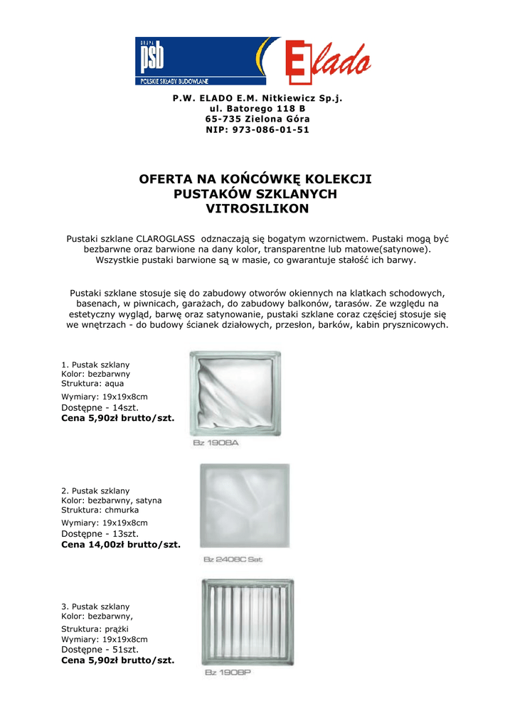 P .W . ELA D O E. M. Nitk iew ic z Sp . j. ul. B at o re go 11 8 B 6 5-7 3 5 Ziel ona G ó ra NIP : 97 3 -08 6 -01 -5 1 OFERTA NA KOŃCÓWKĘ KOLEKCJI PUSTAKÓW SZKLANYCH VITROSILIKON Pustaki szklane CLAROGLASS odznaczają się bogatym wzornictwem. Pustaki mogą być bezbarwne oraz barwione na dany kolor, transparentne lub matowe(satynowe). Wszystkie pustaki barwione są w masie, co gwarantuje stałość ich barwy. Pustaki szklane stosuje się do zabudowy otworów okiennych na klatkach schodowych, basenach, w piwnicach, garażach, do zabudowy balkonów, tarasów. Ze względu na estetyczny wygląd, barwę oraz satynowanie, pustaki szklane coraz częściej stosuje się we wnętrzach - do budowy ścianek działowych, przesłon, barków, kabin prysznicowych. 1. Pustak szklany Kolor: bezbarwny Struktura: aqua Wymiary: 19x19x8cm Dostępne - 14szt. Cena 5,90zł brutto/szt. 2. Pustak szklany Kolor: bezbarwny, satyna Struktura: chmurka Wymiary: 19x19x8cm Dostępne - 13szt. Cena 14,00zł brutto/szt. 3. Pustak szklany Kolor: bezbarwny, Struktura: prążki Wymiary: 19x19x8cm Dostępne - 51szt. Cena 5,90zł brutto/szt. 4. Pustak szklany Kolor: bezbarwny, Struktura: chmurka Wymiary: 19x9x8cm Dostępne - 20szt. Cena 8,00zł brutto/szt. 5. Pustak szklany Kolor: turkusowy, satyna Struktura: gładki Wymiary: 19x19x8cm Dostępne - 15szt. Cena 17,60zł brutto/szt. 6. Pustak szklany Kolor: turkusowy, satyna Struktura: chmurka Wymiary: 19x19x8cm Dostępne - 40szt. Cena 17,60zł brutto/szt. 7. Pustak szklany Kolor: lazurowy, Struktura: gładki Wymiary: 19x19x8cm Dostępne - 50szt. Cena 12,0zł brutto/szt. 8. Pustak szklany Kolor: lazurowy, Struktura: chmurka Wymiary: 19x19x8cm Dostępne - 55szt. Cena 12,00zł brutto/szt. 9. Pustak szklany Kolor: miodowy, Struktura: gładki Wymiary: 19x19x8cm Dostępne - 15szt. Cena 12,00zł brutto/szt. 10. Pustak szklany Kolor: seledynowy, Struktura: chmurka Wymiary: 19x19x8cm Dostępne - 10szt. Cena 12,00zł brutto/szt. 11. Pustak szklany Kolor: łososiowy, Struktura: krople deszczu Wymiary: 19x19x8cm Dostępne - 11szt. Cena 12,00zł brutto/szt. * oferta ważna w dniu 16.09.2016 do wyczerpania zapasów W swojej ofercie posiadamy także pojedyncze sztuki innych kolorów i faktur - szczegóły w dziale sprzedaży. Dane kontaktowe: tel: 68/324 54 24, 320 34 95 tel. 604 914 144, 606 889 308 [email protected] [email protected] [email protected] Uprzejmie informujemy, że posiadamy pełen asortyment materiałów budowlanych od piwnicy aż po dach. Nasze ceny są bardzo atrakcyjne, a ponadto istnieje dodatkowa możliwość negocjacji cen. Zapraszamy do programu “BUDUJ Z PSB” – zdobywaj bardzo atrakcyjne nagrody! Zapraszamy na naszą stronę internetową www.elado.com.pl