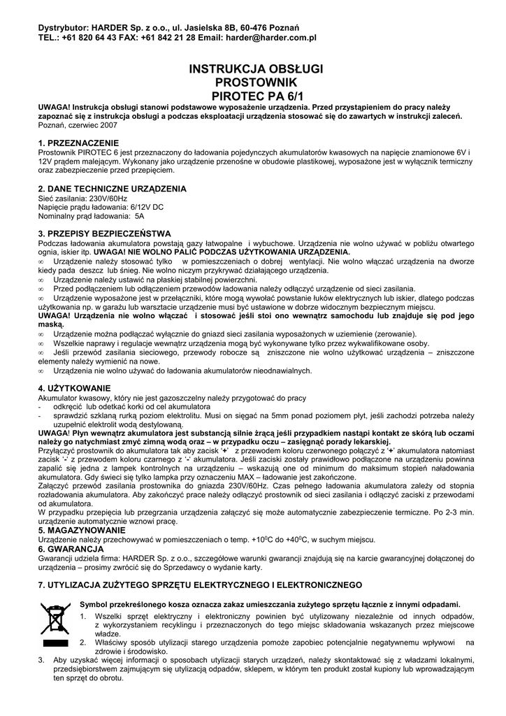 Dystrybutor: HARDER Sp. z o.o., ul. Jasielska 8B, 60-476 Poznań TEL.: +61 820 64 43 FAX: +61 842 21 28 Email: [email protected] INSTRUKCJA OBSŁUGI PROSTOWNIK PIROTEC PA 6/1 UWAGA! Instrukcja obsługi stanowi podstawowe wyposaŜenie urządzenia. Przed przystąpieniem do pracy naleŜy zapoznać się z instrukcja obsługi a podczas eksploatacji urządzenia stosować się do zawartych w instrukcji zaleceń. Poznań, czerwiec 2007 1. PRZEZNACZENIE Prostownik PIROTEC 6 jest przeznaczony do ładowania pojedynczych akumulatorów kwasowych na napięcie znamionowe 6V i 12V prądem malejącym. Wykonany jako urządzenie przenośne w obudowie plastikowej, wyposaŜone jest w wyłącznik termiczny oraz zabezpieczenie przed przepięciem. 2. DANE TECHNICZNE URZĄDZENIA Sieć zasilania: 230V/60Hz Napięcie prądu ładowania: 6/12V DC Nominalny prąd ładowania: 5A 3. PRZEPISY BEZPIECZEŃSTWA Podczas ładowania akumulatora powstają gazy łatwopalne i wybuchowe. Urządzenia nie wolno uŜywać w pobliŜu otwartego ognia, iskier itp. UWAGA! NIE WOLNO PALIĆ PODCZAS UśYTKOWANIA URZĄDZENIA. • Urządzenie naleŜy stosować tylko w pomieszczeniach o dobrej wentylacji. Nie wolno włączać urządzenia na dworze kiedy pada deszcz lub śnieg. Nie wolno niczym przykrywać działającego urządzenia. • Urządzenie naleŜy ustawić na płaskiej stabilnej powierzchni. • Przed podłączeniem lub odłączeniem przewodów ładowania naleŜy odłączyć urządzenie od sieci zasilania. • Urządzenie wyposaŜone jest w przełączniki, które mogą wywołać powstanie łuków elektrycznych lub iskier, dlatego podczas uŜytkowania np. w garaŜu lub warsztacie urządzenie musi być ustawione w dobrze widocznym bezpiecznym miejscu. UWAGA! Urządzenia nie wolno włączać i stosować jeśli stoi ono wewnątrz samochodu lub znajduje się pod jego maską. • Urządzenie moŜna podłączać wyłącznie do gniazd sieci zasilania wyposaŜonych w uziemienie (zerowanie). • Wszelkie naprawy i regulacje wewnątrz urządzenia mogą być wykonywane tylko przez wykwalifikowane osoby. • Jeśli przewód zasilania sieciowego, przewody robocze są zniszczone nie wolno uŜytkować urządzenia – zniszczone elementy naleŜy wymienić na nowe. • Urządzenia nie wolno uŜywać do ładowania akumulatorów nieodnawialnych. 4. UśYTKOWANIE Akumulator kwasowy, który nie jest gazoszczelny naleŜy przygotować do pracy odkręcić lub odetkać korki od cel akumulatora sprawdzić szklaną rurką poziom elektrolitu. Musi on sięgać na 5mm ponad poziomem płyt, jeśli zachodzi potrzeba naleŜy uzupełnić elektrolit wodą destylowaną. UWAGA! Płyn wewnątrz akumulatora jest substancją silnie Ŝrącą jeśli przypadkiem nastąpi kontakt ze skórą lub oczami naleŜy go natychmiast zmyć zimną wodą oraz – w przypadku oczu – zasięgnąć porady lekarskiej. Przyłączyć prostownik do akumulatora tak aby zacisk ‘+’ z przewodem koloru czerwonego połączyć z ‘+’ akumulatora natomiast zacisk ‘-‘ z przewodem koloru czarnego z ‘-‘ akumulatora. Jeśli zaciski zostały prawidłowo podłączone na urządzeniu powinna zapalić się jedna z lampek kontrolnych na urządzeniu – wskazują one od minimum do maksimum stopień naładowania akumulatora. Gdy świeci się tylko lampka przy oznaczeniu MAX – ładowanie jest zakończone. Załączyć przewód zasilania prostownika do gniazda 230V/60Hz. Czas pełnego ładowania akumulatora zaleŜy od stopnia rozładowania akumulatora. Aby zakończyć prace naleŜy odłączyć prostownik od sieci zasilania i odłączyć zaciski z przewodami od akumulatora. W przypadku przepięcia lub przegrzania urządzenia załączyć się moŜe automatycznie zabezpieczenie termiczne. Po 2-3 min. urządzenie automatycznie wznowi pracę. 5. MAGAZYNOWANIE Urządzenie naleŜy przechowywać w pomieszczeniach o temp. +100C do +400C, w suchym miejscu. 6. GWARANCJA Gwarancji udziela firma: HARDER Sp. z o.o., szczegółowe warunki gwarancji znajdują się na karcie gwarancyjnej dołączonej do urządzenia – prosimy zwrócić się do Sprzedawcy o wydanie karty. 7. UTYLIZACJA ZUśYTEGO SPRZĘTU ELEKTRYCZNEGO I ELEKTRONICZNEGO Symbol przekreślonego kosza oznacza zakaz umieszczania zuŜytego sprzętu łącznie z innymi odpadami. 1. 3. Wszelki sprzęt elektryczny i elektroniczny powinien być utylizowany niezaleŜnie od innych odpadów, z wykorzystaniem recyklingu i przeznaczonych do tego miejsc składowania wskazanych przez miejscowe władze. 2. Właściwy sposób utylizacji starego urządzenia pomoŜe zapobiec potencjalnie negatywnemu wpływowi na zdrowie i środowisko. Aby uzyskać więcej informacji o sposobach utylizacji starych urządzeń, naleŜy skontaktować się z władzami lokalnymi, przedsiębiorstwem zajmującym się utylizacją odpadów, sklepem, w którym ten produkt został kupiony lub wprowadzającym ten sprzęt do obrotu.