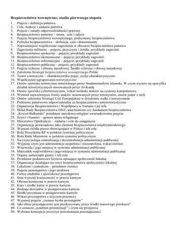 Bezpieczeństwo wewnętrzne, studia pierwszego stopnia 1. 2. 3. 4. 5. 6. 7. 8. 9. 10. 11. 12. 13. 14. 15. 16. 17. 18. 19. 20. 21. 22. 23. 24. 25. 26. 27. 28. 29. 30. 31. 32. 33. 34. 35. 36. 37. 38. 39. 40. 41. 42. 43. 44. 45. 46. 47. 48. 49. 50. Pojęcie i definicja państwa Cele, funkcje i zadania państwa Pojęcie i zasady odpowiedzialności prawnej Bezpieczeństwo państwa – istota, cele i zakres Pojęcie bezpieczeństwa wewnętrznego, podsystemy bezpieczeństwa Polityka bezpieczeństwa – definicja, cele i determinanty Najważniejsze współczesne zagrożenia w obszarze bezpieczeństwa państwa Zagrożenia militarne – pojęcie, przyczyny i źródła, przykłady zagrożeń Bezpieczeństwo społeczne – pojęcie, przykłady zagrożeń Bezpieczeństwo ekonomiczne – pojęcie, przykłady zagrożeń Bezpieczeństwo informacyjne – pojęcie, przykłady zagrożeń Bezpieczeństwo publiczne – pojęcie, przykłady zagrożeń Pojęcie ochrony i obrony narodowej. Środki ochrony i obrony narodowej Założenia Strategii bezpieczeństwa wewnętrznego Polski Terror a terroryzm – charakterystyka pojęć, cechy charakterystyczne Współczesne ugrupowania terrorystyczne Omów zjawisko terroryzmu stosowanego przez fundamentalizm islamski. W czym wyraża się specyfika działań terrorystycznych stosowanych przez Al-Kaidę Omów zjawisko cyberterroryzmu, wskaż techniki ataków na systemy komputerowe Wymień najważniejsze formy ataków stosowanych przez terrorystów, omów jeden z nich Omów założenia Strategii Unii Europejskiej w dziedzinie walki z terroryzmem Podmioty państwowe odpowiedzialne za bezpieczeństwo antyterrorystyczne Organizacja Bezpieczeństwa i Współpracy w Europie i jej rola Skład Rady Bezpieczeństwa ONZ, anachronizm czy fundament bezpieczeństwa „Kocioł Bałkański” przedstaw narodowo-religijne uwarunkowania pojęcia Szyici i Sunnici – geneza sporu religijnego Mocarstwo Opiekuńcze – zadania i cele do osiągnięcia Organizacje pozarządowe jako element bezpieczeństwa międzynarodowego Wymień źródła prawa obowiązujące w Polsce i ich rolę. Rola Prezydenta RP w polskim systemie politycznym Rola Rady Ministrów w polskim systemie politycznym Na czym polega centralizacja i decentralizacja administracji publicznej Wyjaśnij czym jest administracja zespolona i niezespolona, wskaż różnice Wojewoda i jego miejsce w systemie administracji publicznej Marszałek województwa i jego miejsce w systemie administracji publicznej Organy samorządu gminy i ich rola Przedstaw podstawowe kryteria opisujące społeczność lokalną Organizacje działające na rzecz bezpieczeństwa społeczności lokalnej Lokalizm i centralizm – przedstaw różnice Pojęcie przestępstwa i jego struktura Formy stadialne i zjawiskowe przestępstwa Stan wyższej konieczności w prawie karnym Obrona konieczna w prawie karnym Kary i środki karne w prawie karnym Rodzaje dowodów w postępowaniu karnym Środki przymusu w postępowaniu karnym Wskaż przestępstwa z użyciem przemocy Wyjaśnij pojęcie „ciemna liczba przestępstw” Jaki obraz przestępczości jest przekazywany przez środki masowego przekazu? Co oznacza „syndrom prizonizacji” i czym się przejawia Wybrane koncepcje przyczyn powstawania przestępczości
