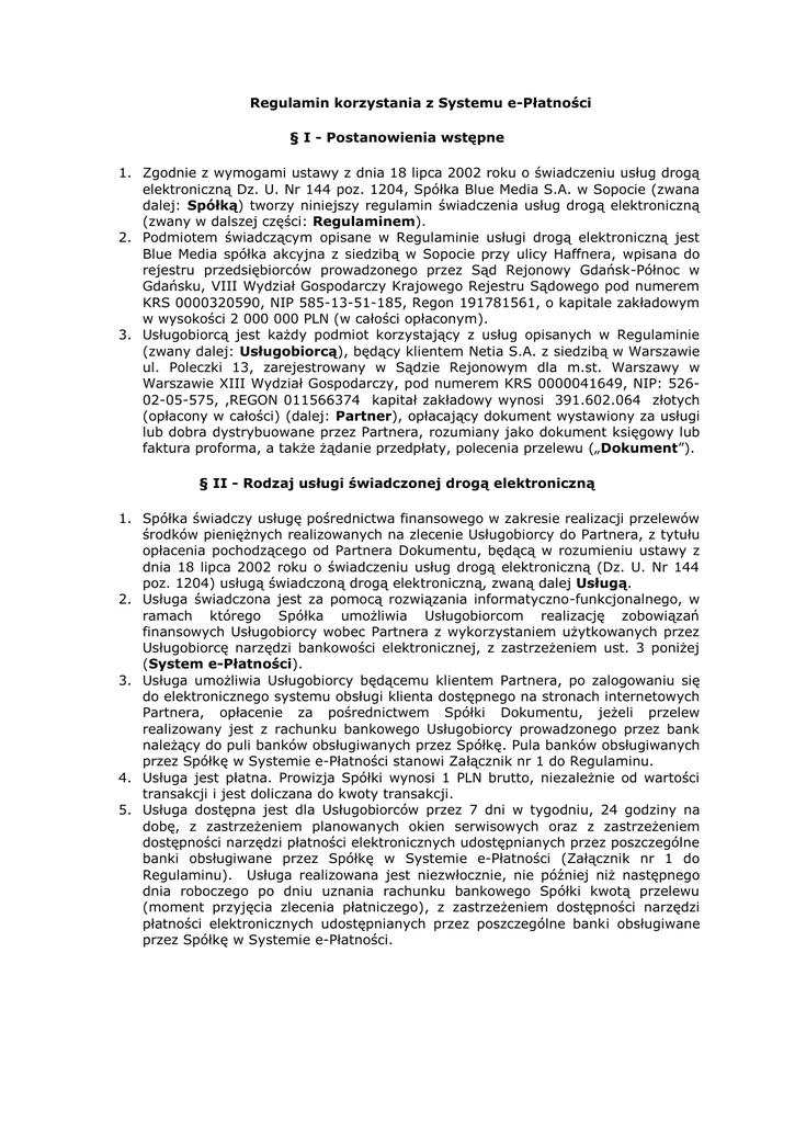 Regulamin korzystania z Systemu e-Płatności § I - Postanowienia wstępne 1. Zgodnie z wymogami ustawy z dnia 18 lipca 2002 roku o świadczeniu usług drogą elektroniczną Dz. U. Nr 144 poz. 1204, Spółka Blue Media S.A. w Sopocie (zwana dalej: Spółką) tworzy niniejszy regulamin świadczenia usług drogą elektroniczną (zwany w dalszej części: Regulaminem). 2. Podmiotem świadczącym opisane w Regulaminie usługi drogą elektroniczną jest Blue Media spółka akcyjna z siedzibą w Sopocie przy ulicy Haffnera, wpisana do rejestru przedsiębiorców prowadzonego przez Sąd Rejonowy Gdańsk-Północ w Gdańsku, VIII Wydział Gospodarczy Krajowego Rejestru Sądowego pod numerem KRS 0000320590, NIP 585-13-51-185, Regon 191781561, o kapitale zakładowym w wysokości 2 000 000 PLN (w całości opłaconym). 3. Usługobiorcą jest każdy podmiot korzystający z usług opisanych w Regulaminie (zwany dalej: Usługobiorcą), będący klientem Netia S.A. z siedzibą w Warszawie ul. Poleczki 13, zarejestrowany w Sądzie Rejonowym dla m.st. Warszawy w Warszawie XIII Wydział Gospodarczy, pod numerem KRS 0000041649, NIP: 52602-05-575, ,REGON 011566374 kapitał zakładowy wynosi 391.602.064 złotych (opłacony w całości) (dalej: Partner), opłacający dokument wystawiony za usługi lub dobra dystrybuowane przez Partnera, rozumiany jako dokument księgowy lub faktura proforma, a także żądanie przedpłaty, polecenia przelewu („Dokument”). § II - Rodzaj usługi świadczonej drogą elektroniczną 1. Spółka świadczy usługę pośrednictwa finansowego w zakresie realizacji przelewów środków pieniężnych realizowanych na zlecenie Usługobiorcy do Partnera, z tytułu opłacenia pochodzącego od Partnera Dokumentu, będącą w rozumieniu ustawy z dnia 18 lipca 2002 roku o świadczeniu usług drogą elektroniczną (Dz. U. Nr 144 poz. 1204) usługą świadczoną drogą elektroniczną, zwaną dalej Usługą. 2. Usługa świadczona jest za pomocą rozwiązania informatyczno-funkcjonalnego, w ramach którego Spółka umożliwia Usługobiorcom realizację zobowiązań finansowych Usługobiorcy wobec Partnera z wykorzystaniem użytkowanych przez Usługobiorcę narzędzi bankowości elektronicznej, z zastrzeżeniem ust. 3 poniżej (System e-Płatności). 3. Usługa umożliwia Usługobiorcy będącemu klientem Partnera, po zalogowaniu się do elektronicznego systemu obsługi klienta dostępnego na stronach internetowych Partnera, opłacenie za pośrednictwem Spółki Dokumentu, jeżeli przelew realizowany jest z rachunku bankowego Usługobiorcy prowadzonego przez bank należący do puli banków obsługiwanych przez Spółkę. Pula banków obsługiwanych przez Spółkę w Systemie e-Płatności stanowi Załącznik nr 1 do Regulaminu. 4. Usługa jest płatna. Prowizja Spółki wynosi 1 PLN brutto, niezależnie od wartości transakcji i jest doliczana do kwoty transakcji. 5. Usługa dostępna jest dla Usługobiorców przez 7 dni w tygodniu, 24 godziny na dobę, z zastrzeżeniem planowanych okien serwisowych oraz z zastrzeżeniem dostępności narzędzi płatności elektronicznych udostępnianych przez poszczególne banki obsługiwane przez Spółkę w Systemie e-Płatności (Załącznik nr 1 do Regulaminu). Usługa realizowana jest niezwłocznie, nie później niż następnego dnia roboczego po dniu uznania rachunku bankowego Spółki kwotą przelewu (moment przyjęcia zlecenia płatniczego), z zastrzeżeniem dostępności narzędzi płatności elektronicznych udostępnianych przez poszczególne banki obsługiwane przez Spółkę w Systemie e-Płatności. § III - Warunki świadczenia usługi drogą elektroniczną 1. Usługa jest świadczona przez Spółkę jedynie Usługobiorcom, będącym klientami Partnera, którzy jednocześnie zawarli ze Spółką umowę o świadczenie Usługi poprzez akceptację niniejszego Regulaminu. 2. W celu uzyskania informacji o stanie realizacji Usługi, Usługobiorca może udostępnić Spółce swój adres e-mail lub numer telefonu komórkowego. Z chwilą zamówienia Usługi i akceptacji niniejszego Regulaminu, dane osobowe Usługobiorcy są umieszczane i przetwarzane w bazie danych firmy Blue Media S.A. z siedzibą w Sopocie, będącej administratorem tych danych osobowych. Podanie danych osobowych jest dobrowolne, ale konieczne dla realizacji Usługi. 3. Administratorem zbioru danych osobowych Usługobiorcy jest Spółka. 4. Usługobiorcy przysługuje prawo wglądu do zarejestrowanych dotyczących go danych osobowych oraz prawo żądania ich poprawiania. 5. W celu korzystania z Usługi niezbędne jest spełnienie przez Usługobiorcę następujących wymagań technicznych: a) posiadanie urządzeń zapewniających dostęp do sieci Internet, b) posiadanie internetowego konta pocztowego (e-mail), jeżeli Usługobiorca chce uzyskać informację o stanie realizacji Usługi zgodnie z ust. 2 powyżej, c) posiadanie zaktualizowanej przeglądarki internetowej zapewniającej prawidłowe wyświetlanie Portalu § IV - Warunki zawierania umowy o świadczenie usługi drogą elektroniczną Zawarcie umowy o świadczenie Usługi następuje po potwierdzeniu zapoznania się i akceptacji niniejszego Regulaminu. Usługa zostaje zrealizowana dla Usługobiorcy z chwilą uznania rachunku Partnera kwotą przelewu. § V - Reklamacje 1. Składanie reklamacji odbywa się drogą elektroniczną na adres e-mail Spółki: [email protected] lub telefonicznie na numer Spółki +48 58 7604 822 oraz 801 800 822 (połączenia płatne według stawek właściwych operatorów telekomunikacyjnych) 2. Przedmiotem reklamacji jest wykonanie przez Spółkę Usługi niezgodnie z warunkami i zasadami określonymi w niniejszym Regulaminie. 3. Podstawy reklamacji nie może stanowić: o powoływanie się na okoliczności związane z nieprawidłowym funkcjonowaniem u Usługobiorcy przeglądarki internetowej lub łącz telekomunikacyjnych, o nie dotrzymania warunków Regulaminu przez Usługobiorcę, o inne okolicznośc