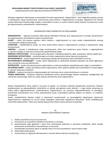 REGULAMIN IMPREZ TURYSTYCZNYCH DLA DZIECI I MŁODZIEŻY organizowanych przez Agencję Eventową ALTERNATYWA Niniejszy regulamin obowiązuje na wszystkich formach wypoczynku Organizatora i jest integralną częścią umowy o świadczenie usług turystycznych, zawieranych przez klienta z Organizatorem turystyki. Regulamin ten określa zasady dotyczące bezpiecznego pobytu uczestników turnusu w czasie trwania danej imprezy turystycznej, zasad jej organizowania, prowadzenia i nadzorowania. SŁOWNICZEK POJĘD ZAWARTYCH W REGULAMINIE ORGANIZATOR – Agencja Eventowa Alternatywa Mirosław Pietrzak, jest organizatorem turystyki uprawnionym do organizowania i prowadzenia imprez turystycznych. KLIENT – rodzic lub prawny opiekun, który zawiera z organizatorem na rzecz osoby niepełnoletniej umowę o świadczenie usług turystycznych. UCZESTNIK – niepełnoletnia osoba, na rzecz której klient zawarł z organizatorem umowę o świadczenie usług turystycznych. UMOWA – umowa o świadczenie usług turystycznych, która jest zawierana przez klienta z organizatorem w zakresie udziału w imprezie turystycznej niepełnoletniej osoby. IMPREZA TURYSTYCZNA – forma wypoczynku dla dzieci i młodzieży (kolonia, obóz, wycieczka, zielona szkoła itp.). KIEROWNIK WYPOCZYNKU – osoba kierująca w imieniu organizatora daną imprezą turystyczną. WYCHOWAWCA – osoba bezpośrednio sprawująca opiekę wychowawczą nad uczestnikami turnusu. WYCHOWAWCA DYŻURUJĄCY – osoba, która odpowiada za całokształt działania placówki od chwili ogłoszenia ciszy nocnej do czasu jej zakooczenia. INSTRUKTOR – osoba zatrudniona przez organizatora w celu prowadzenia specjalistycznych zajęd z uczestnikami. RATOWNIK WOPR – osoba zatrudniana przez organizatora, która spełnia opiekę nad uczestnikami w czasie kąpieli w różnych akwenach wodnych. TURNUS – impreza turystyczna rozpoczynająca się i koocząca się w czasie określonym w umowie. OPIEKA MEDYCZNA – działania medyczne świadczone przez uprawnionego lekarza medycyny, pielęgniarkę lub ratownika medycznego, które to osoby zostały zatrudnione przez organizatora. Osoby niepełnoletnie biorą udział w turnusie za zgodą i na wniosek rodziców (opiekunów prawnych). Rodzice (opiekunowie) są odpowiedzialni materialnie za szkody wyrządzone przez dziecko i z tego tytułu przyjmują na siebie pełną odpowiedzialnośd cywilnoprawną. Organizatorzy nie ponoszą odpowiedzialności za pieniądze, przedmioty wartościowe oraz rzeczy pozostawione przez uczestników podczas pobytu na obozie i w środkach transportu. Osoby niepełnoletnie biorące udział w imprezach turystycznych, są bezwzględnie obowiązane dostarczyd Organizatorowi najpóźniej na 14 dni przed wyjazdem poprawnie wypełniony dokument "Karta kwalifikacyjna uczestnika wypoczynku", który jest najważniejszą informacją o stanie zdrowia Uczestnika. §1 PRAWA UCZESTNIKÓW TURNUSU 1. Każdy uczestnik turnusu ma prawo do: a. korzystania ze wszystkich świadczeo zawartych w umowie; b. poszanowania jego godności i praw oraz zachowania dyskrecji w sprawach osobistych, które zostały powierzone pracownikom zatrudnionym na turnusie; c. swobodnego wyrażania opinii w sposób, który nie narusza godności i praw innych osób; d. aktywnego wypoczynku; e. uczestnictwa w zajęciach oferowanych w ramach danej imprezy turystycznej; f. korzystania z pomocy służb medycznych, kierownika turnusu, wychowawców i innych osób zatrudnionych przez organizatora na danym turnusie; g. szczególnej pomocy ze strony osób zatrudnionych na turnusie w przypadku rozwiązywania konfliktów personalnych i innych sytuacji, które naruszają jego prawa, wolności i bezpieczeostwo; h. zapoznania się z programem turnusu; i. korzystania ze sprzętu dostępnego w czasie trwania wypoczynku i przeznaczonego dla uczestników turnusu; j. zgłaszania kierownikowi turnusu wniosków, wszelkich uwag dotyczących działania wypoczynku; k. ochrony przed nielegalnym zażywaniem substancji i środków niedozwolonych prawnie oraz substancji psychotropowych; l. ochrony przed wszelkimi formami przemocy. §2 OBOWIĄZKI UCZESTNIKÓW TURNUSU 1. Każdy uczestnik turnusu ma obowiązek: a. przestrzegad postanowienia niniejszego regulaminu, ogólnych warunków udziału w imprezach turystycznych dla dzieci i młodzieży; b. okazywad szacunek wszystkim osobom, z którymi uczestnik kontaktuje się w czasie trwania turnusu; c. aktywnie uczestniczyd w zajęciach i innych imprezach określonych w programie turnusu, chyba że uczestnik został zwolniony przez wychowawcę, lub lekarza z udziału w danych zajęciach lub danym elemencie programu; d. zgłaszad wszystkie sytuacje, które wpływają na bezpieczeostwo własne, życia i zdrowia lub bezpieczeostwo innych uczestników lub osób; e. zgłaszad wszystkie niebezpieczeostwa a w szczególności zauważone awarie sprzętu, urządzeo, zniszczenie lub uszkodzenie mienia; f. zgłaszad niezwłocznie wszystkie swoje zachorowania swojemu wychowawcy lub kierownikowi turnusu; g. zgłaszad swojemu wychowawcy lub kierownikowi turnusu zachowania oraz działania niedozwolone prawnie, których uczestnik turnusu jest świadkiem lub dowiedział się o nich; h. zachowywad się w czasie trwania turnusu w sposób, który nie narusza godności i wolności innych osób; i. dbad o czystośd w miejscu, w którym uczestnik został zakwaterowany; j. dbad o mienie ośrodka i organizatora, z którego uczestnik korzysta w czasie trwania turnusu; k. przestrzegad zasady higieny osobistej; l. słuchad poleceo wychowawców, kierownika turnusu i innych osób zatrudnionych przez organizatora na danym turnusie; m. przebywad w danym czasie i miejscu wskazanym przez wychowawcę, kierownika turnusu lub inna osobę zatrudnioną przez organizatora na turnusie. 2. Bezwzględnie zabrania się w czasie trwania turnusu: a. stosowania wobec kogokolwiek wszelkich form przemocy, b. sprzedawania, udostępniania i zażywania wszelkich substancji, 