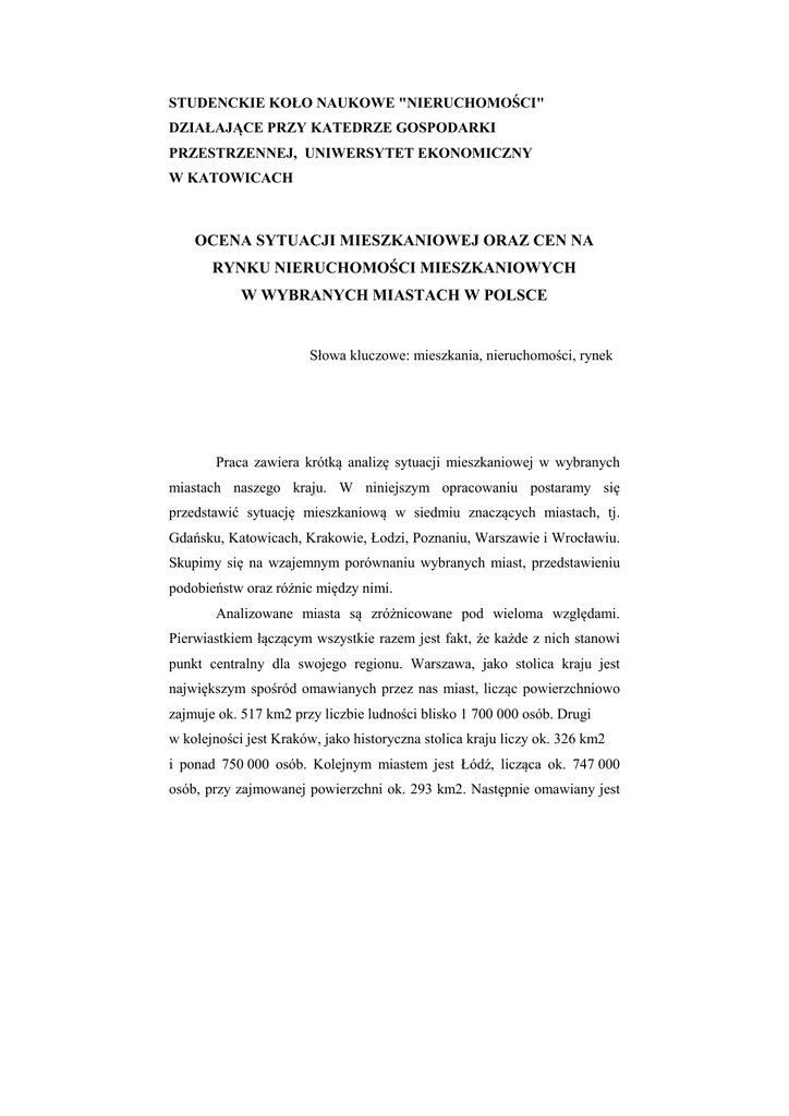 STUDENCKIE KOŁO NAUKOWE "NIERUCHOMOŚCI" DZIAŁAJĄCE PRZY KATEDRZE GOSPODARKI PRZESTRZENNEJ, UNIWERSYTET EKONOMICZNY W KATOWICACH OCENA SYTUACJI MIESZKANIOWEJ ORAZ CEN NA RYNKU NIERUCHOMOŚCI MIESZKANIOWYCH W WYBRANYCH MIASTACH W POLSCE Słowa kluczowe: mieszkania, nieruchomości, rynek Praca zawiera krótką analizę sytuacji mieszkaniowej w wybranych miastach naszego kraju. W niniejszym opracowaniu postaramy się przedstawić sytuację mieszkaniową w siedmiu znaczących miastach, tj. Gdańsku, Katowicach, Krakowie, Łodzi, Poznaniu, Warszawie i Wrocławiu. Skupimy się na wzajemnym porównaniu wybranych miast, przedstawieniu podobieństw oraz różnic między nimi. Analizowane miasta są zróżnicowane pod wieloma względami. Pierwiastkiem łączącym wszystkie razem jest fakt, że każde z nich stanowi punkt centralny dla swojego regionu. Warszawa, jako stolica kraju jest największym spośród omawianych przez nas miast, licząc powierzchniowo zajmuje ok. 517 km2 przy liczbie ludności blisko 1 700 000 osób. Drugi w kolejności jest Kraków, jako historyczna stolica kraju liczy ok. 326 km2 i ponad 750 000 osób. Kolejnym miastem jest Łódź, licząca ok. 747 000 osób, przy zajmowanej powierzchni ok. 293 km2. Następnie omawiany jest Wrocław, który jako czwarte miasto pod względem ludności w Polsce liczy ok. 632 000 osób i zajmuje powierzchnię 293 km2. Dalej pod względem powierzchni i liczby ludności plasuje się Poznań, z obszarem blisko 261km2 i liczbą ok. 557 000 osób. Szósty pod względem liczby ludności w kraju jest Gdańsk, liczący ok. 456 000 osób przy powierzchni ok. 265 km2. Na końcu całej grupy znajdują się Katowice z powierzchnią ok. 165km2 zajmujące 11 miejsce pod tym względem w całym kraju. Liczba ludności w Katowicach waha się w granicach 310 000 osób. Jedną z głównych wartości służących scharakteryzowaniu rynku nieruchomości jest wielkość zasobu mieszkaniowego w poszczególnych miastach. Do porównania rynków posłużono się łączną liczbą mieszkań w wybranych miastach. Rysunek 1 Liczba mieszkań w wybranych miastach w 2008r. Źródło: Opracowanie własne na podstawie danych GUS Drugim elementem analizy pozwalającym na obiektywne porównanie zasobu mieszkaniowego jest współczynnik liczby mieszkań na 1000 mieszkańców. 2 Rysunek 2 Liczba mieszkań w przeliczeniu na 1000 mieszkańców w wybranych miastach w 2008r. Źródło: Opracowanie własne na podstawie danych GUS Z porównania rysunków 1 i 2 wynika, że Warszawa posiada znaczną przewagę zarówno pod względem ogólnej liczby mieszkań, jak również ich liczby w przełożeniu na 1000 mieszkańców. Łódź, w nieznacznej mierze ustępuje Warszawie pod względem nasycenia mieszkań, mimo iż w ogólnej ich liczbie różnica jest znacznie większa. Najciekawsza sytuacja występuje w Katowicach. Tutaj wskaźnik nasycenia mieszkań jest na tyle wysoki iż przewyższa nie tylko najbliższy Katowicom pod względem ogólnej liczby mieszkań Gdańsk, ale również Karków, Wrocław i Poznań. Drugim z obszarów, nad którymi warto się zastanowić porównując różne miasta jest analiza struktury własnościowej zasobu mieszkaniowego pozwalająca na określenie dominujących form własności. W tablicy 1 zestawiono zasoby mieszkaniowe Katowic, Krakowa, Poznania, Łodzi, Gdańska, Wrocławia i Warszawy pod względem różnych form własności w ujęciu liczbowym oraz procentowym. 3 Tablica 1 Liczba mieszkań w wybranych miastach w 2008r. Miasto zasób gminy (komunalny) zasób spółdzielni mieszkaniowych zasób zakładów pracy Katowice Kraków Poznań Warszawa liczba 18 775 23 198 17 994 98 427 w% 14,00% 7,60% 7,90% 12,60% liczba 58 722 101 815 95 941 337 514 w% 43,90% 33,40% 42,10% 43,20% liczba 10 602 3 106 4 703 19 443 w% 7,90% 1,00% 2,10% 2,50% Łódź 68210 20,43% 141842 42,48% 4908 1,47% Gdańsk 28245 15,84% 65949 36,98% 906 0,51% 93142 36,71% Wrocław 49834 19,64% zasób Towarzystw Budownictwa Miasto Społecznego (TBS) liczba w% Katowice 1 329 1,00% Kraków 4 741 1,60% Poznań 1 508 0,70% Warszawa 3 339 0,40% zasób osób fizycznych liczba 43 149 170 692 98 074 300 299 w% 32,30% 56,00% 43,00% 38,50% 5052 1,99% zasób pozostałych podmiotów liczba w% 1 059 0,80% 984 0,30% 9 938 4,40% 21 889 2,80% Razem: liczba 133 636 304 536 228 158 780 911 w% 100% 100% 100% 100% Łódź 1053 0,32% 114489 34,29% 3384 1,01% 333886 100% Gdańsk 1991 1,12% 70239 39,38% 11013 6,18% 178343 100% Wrocław 2014 0,79% 101759 40,11% 1907 Źródło: Opracowanie własne na podstawie danych GUS 0,75% 253708 100% Katowicki rynek nieruchomości ujęty według form własności cechuje się bardzo wysokim udziałem mieszkań należących do spółdzielni mieszkaniowych w ogólnej liczbie mieszkań. Wielkość ta kształtuje się w granicach 44% i ma swoje źródło w przeszłości, kiedy to budowano wiele mieszkań z tzw. wielkiej płyty, które miały zaspokoić potrzeby mieszkaniowe osób napływających na Górny Śląsk w poszukiwaniu pracy. Na kolejnych pozycjach znajdują się zasoby osób fizycznych (własność prywatna) z 32% udziałem, zasoby gminy - 14%. Ze względu na przemysłowy charakter Górnego Śląska, duży odsetek mieszkań znajduje się w posiadaniu zakładów pracy do których należy 8% zasobu. Najmniejszy, 4 niespełna 1% udział przypada na mieszkania znajdujące się w TBS oraz w zasobach pozostałych podmiotów Rysunek 3 Struktura własnościowa mieszkań w Katowicach w 2008r. Źródło: Opracowanie własne na podstawie danych GUS W Krakowie dominującą formę własności stanowią zasoby osób fizycznych skupiające 56% mieszkań, znacznie mniej, bo jedynie 33,4% przypada na spółdzielnie mieszkaniowe. Wśród pozostałej części zasobu 7,6% jest własnością gminy, 1,6% należy do TBS, jedynie 1% stanowi własność zakładów pracy, natomiast 0,3% należy do pozostałych podmiotów. 5 Rysunek 4 Struktura własnościowa mieszkań w Krakowie w 2008r. Źródło: