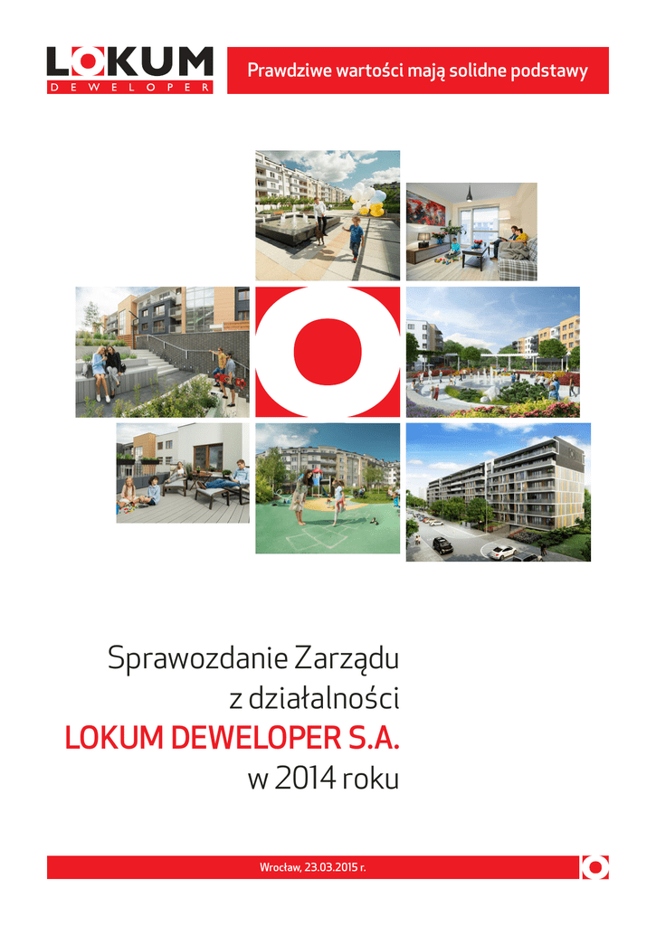 Prawdziwe wartości mają solidne podstawy Sprawozdanie Zarządu z działalności LOKUM DEWELOPER S.A. w 2014 roku Wrocław, 23.03.2015 r. Sprawozdanie Zarządu z działalności LOKUM DEWELOPER S.A. w 2014 roku Spis treści 1. Charakterystyka Lokum Deweloper S.A. . . . . . . . . . . . . . . . . . . . . . . . . . . . . . . . . . . . . . . . . . . . . . . . . . . . . . . . . . . . . . . . . . . . . . . . . . . . . . . . . . . . . . . . . . . . . . . . . . . . . . . . . . . . . . . . . . . . . . . . . . . . . . . . . . . . . . . . . . . . . . . . . . . . . . . . . . . . . . . . . . . . . . 3 1.1. Przedmiot działalności i struktura Spółki . . . . . . . . . . . . . . . . . . . . . . . . . . . . . . . . . . . . . . . . . . . . . . . . . . . . . . . . . . . . . . . . . . . . . . . . . . . . . . . . . . . . . . . . . . . . . . . . . . . . . . . . . . . . . . . . . . . . . . . . . . . . . . . . . . . . . . . . . . . . . . . . . . . . . . . . . . . . 3 1.2. Struktura sprzedaży Spółki . . . . . . . . . . . . . . . . . . . . . . . . . . . . . . . . . . . . . . . . . . . . . . . . . . . . . . . . . . . . . . . . . . . . . . . . . . . . . . . . . . . . . . . . . . . . . . . . . . . . . . . . . . . . . . . . . . . . . . . . . . . . . . . . . . . . . . . . . . . . . . . . . . . . . . . . . . . . . . . . . . . . . . . . . . . . . . . . . . . . 5 2. Sprawozdanie z działalności Lokum Deweloper S.A. . . . . . . . . . . . . . . . . . . . . . . . . . . . . . . . . . . . . . . . . . . . . . . . . . . . . . . . . . . . . . . . . . . . . . . . . . . . . . . . . . . . . . . . . . . . . . . . . . . . . . . . . . . . . . . . . . . . . . . . . . . . . . . . . . . . . . . . . . . . . . . . . 6 2.1. Inwestycje zakończone, realizowane i planowane . . . . . . . . . . . . . . . . . . . . . . . . . . . . . . . . . . . . . . . . . . . . . . . . . . . . . . . . . . . . . . . . . . . . . . . . . . . . . . . . . . . . . . . . . . . . . . . . . . . . . . . . . . . . . . . . . . . . . . . . . . . . . . . . . . . . . . . . . . . . 6 2.2. Umowy i spory sądowe . . . . . . . . . . . . . . . . . . . . . . . . . . . . . . . . . . . . . . . . . . . . . . . . . . . . . . . . . . . . . . . . . . . . . . . . . . . . . . . . . . . . . . . . . . . . . . . . . . . . . . . . . . . . . . . . . . . . . . . . . . . . . . . . . . . . . . . . . . . . . . . . . . . . . . . . . . . . . . . . . . . . . . . . . . . . . . . . . . . . . . . . . . 7 3. Sytuacja finansowa Lokum Deweloper S.A. . . . . . . . . . . . . . . . . . . . . . . . . . . . . . . . . . . . . . . . . . . . . . . . . . . . . . . . . . . . . . . . . . . . . . . . . . . . . . . . . . . . . . . . . . . . . . . . . . . . . . . . . . . . . . . . . . . . . . . . . . . . . . . . . . . . . . . . . . . . . . . . . . . . . . . . . . . . . . . . 8 3.1. Wybrane dane finansowe i ocena sytuacji finansowej . . . . . . . . . . . . . . . . . . . . . . . . . . . . . . . . . . . . . . . . . . . . . . . . . . . . . . . . . . . . . . . . . . . . . . . . . . . . . . . . . . . . . . . . . . . . . . . . . . . . . . . . . . . . . . . . . . . . . . . . . . . . . . . . . . . . . 8 3.2. Informacja o istotnych zdarzeniach wpływających na działalność jednostki, jakie wystąpiły po zakończeniu roku obrotowego do dnia zatwierdzenia sprawozdania . . . . . . . . . . . . . . . . . . . . . . . . . . . . . . . . . . . . . . . . . . . . . . . . . . . . . . . . . . . . . . . . . . . . . . . . . . . . . . . . . . . . . . . . . . . . . . . . . . . 12 3.3. Informacje o obligacjach korporacyjnych, kredytach, pożyczkach, poręczeniach i gwarancjach . . . . . . . . . . . . . . . . . . . . . . . . . . . . . . . . . . . . . . . . . . . . . . . . . . . . . . . . . . . 13 3.3.1. Obligacje . . . . . . . . . . . . . . . . . . . . . . . . . . . . . . . . . . . . . . . . . . . . . . . . . . . . . . . . . . . . . . . . . . . . . . . . . . . . . . . . . . . . . . . . . . . . . . . . . . . . . . . . . . . . . . . . . . . . . . . . . . . . . . . . . . . . . . . . . . . . . . . . . . . . . . . . . . . . . . . . . . . . . . . . . . . . . . . . . . . . . . . . . . . . . . . . . . . . . 13 3.3.2. Informacje o zaciągniętych i wypowiedzianych umowach kredytowych . . . . . . . . . . . . . . . . . . . . . . . . . . . . . . . . . . . . . . . . . . . . . . . . . . . . . . . . . . . . . . . . . . . . . . . . . . . . . . . . . . . . . . . . 13 3.3.3. Informacje o udzielonych i otrzymanych pożyczkach (w tym w ramach grupy kapitałowej) . . . . . . . . . . . . . . . . . . . . . . . . . . . . . . . . . . . . . . . . . . . . . . . . . . . . . . . 13 3.3.4. Informacje o udzielonych i otrzymanych gwarancjach i poręczeniach . . . . . . . . . . . . . . . . . . . . . . . . . . . . . . . . . . . . . . . . . . . . . . . . . . . . . . . . . . . . . . . . . . . . . . . . . . . . . . . . . . . . . . . . . . . . 14 3.4. Informacja o instrumentach finansowych w zakresie ryzyka . . . . . . . . . . . . . . . . . . . . . . . . . . . . . . . . . . . . . . . . . . . . . . . . . . . . . . . . . . . . . . . . . . . . . . . . . . . . . . . . . . . . . . . . . . . . . . . . . . . . . . . . . . . . . . . . . . . . . . . . 14 4. Ład korporacyjny Lokum Deweloper S.A. . . . . . . . . . . . . . . . . . . . . . . . . . . . . . . . . . . . . . . . . . . . . . . . . . . . . . . . . . . . . . . . . . . . . . . . . . . . . . . . . . . . . . . . . . . . . . . . . . . . . . . . . . . . . . . . . . . . . . . . . . . . . . . . . . . . . . . . . . . . . . . . . . . . . . . . . . . . . . . . . . 16 4.1. Kapitał zakładowy . . . . . . . . . . . . . . . . . . . . . . . . . . . . . . . . . . . . . . . . . . . . . . . . . . . . . . . . . . . . . . . . . . . . . . . . . . . . . . . . . . . . . . . . . . . . . . . . . . . . . . . . . . . . . . . . . . . . . . . . . . . . . . . . . . . . . . . . . . . . . . . . . . . . . . . . . . . . . . . . . . . . . . . . . . . . . . . . . . . . . . . . . . . . . . . . 16 4.2. Akcjonariat . . . . . . . . . . . . . . . . . . . . . . . . . 