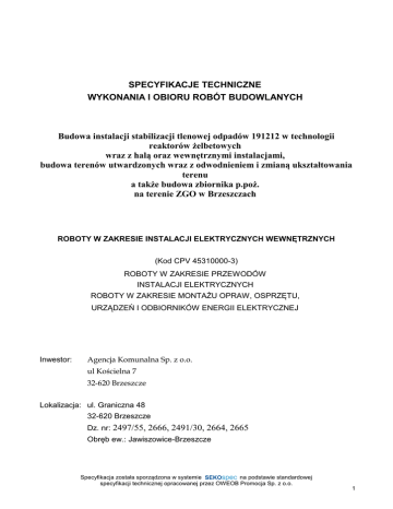 SPECYFIKACJE TECHNICZNE WYKONANIA I OBIORU ROBÓT BUDOWLANYCH Budowa instalacji stabilizacji tlenowej odpadów 191212 w technologii reaktorów żelbetowych wraz z halą oraz wewnętrznymi instalacjami, budowa terenów utwardzonych wraz z odwodnieniem i zmianą ukształtowania terenu a także budowa zbiornika p.poż. na terenie ZGO w Brzeszczach ROBOTY W ZAKRESIE INSTALACJI ELEKTRYCZNYCH WEWNĘTRZNYCH (Kod CPV 45310000-3) ROBOTY W ZAKRESIE PRZEWODÓW INSTALACJI ELEKTRYCZNYCH ROBOTY W ZAKRESIE MONTAŻU OPRAW, OSPRZĘTU, URZĄDZEŃ I ODBIORNIKÓW ENERGII ELEKTRYCZNEJ Inwestor: Agencja Komunalna Sp. z o.o. ul Kościelna 7 32-620 Brzeszcze Lokalizacja: ul. Graniczna 48 32-620 Brzeszcze Dz. nr: 2497/55, 2666, 2491/30, 2664, 2665 Obręb ew.: Jawiszowice-Brzeszcze Specyfikacja została sporządzona w systemie SEKOspec SEKOspec na podstawie standardowej specyfikacji technicznej OWEOB opracowanej Promocjaprzez Sp. zOWEOB o.o. 2005Promocja Sp. z o.o. 1 SPIS TREŚCI 1. CZĘŚĆ OGÓLNA ..................................................................................... 3 1.1.Nazwa nadana zamówieniu przez zamawiającego ........................... 3 1.2.Przedmiot ST .................................................................................... 3 1.3.Zakres stosowania ST ...................................................................... 3 1.4.Przedmiot i zakres robót objętych ST ............................................... 3 1.5.Określenia podstawowe, definicje .................................................... 4 1.6.Ogólne wymagania dotyczące robót ................................................. 5 1.7.Dokumentacja robót montażowych .................................................... 6 1.8.Nazwy i kody ..................................................................................... 6 2. WYMAGANIA DOTYCZĄCE WŁAŚCIWOŚCI MATERIAŁÓW ................ 6 3. WYMAGANIA DOTYCZĄCE SPRZĘTU, MASZYN I NARZĘDZI ............ 13 4. WYMAGANIA DOTYCZĄCE TRANSPORTU ......................................... 13 5. WYMAGANIA DOTYCZĄCE WYKONANIA ROBÓT ............................... 14 6. KONTROLA JAKOŚCI ROBÓT .............................................................. 16 7. WYMAGANIA DOTYCZĄCE PRZEDMIARU I OBMIARU ROBÓT ........ 17 8. ODBIÓR ROBÓT .................................................................................... 17 9. PODSTAWA ROZLICZENIA ROBÓT ..................................................... 18 10. DOKUMENTY ODNIESIENIA ............................................................... 19 Najważniejsze oznaczenia i skróty: ST – Specyfikacja Techniczna SST – Szczegółowa Specyfikacja Techniczna ITB – Instytut Techniki Budowlanej PZJ – Program Zabezpieczenia Jakości Specyfikacja została sporządzona w systemie SEKOspec SEKOspec na podstawie standardowej specyfikacji technicznej OWEOB opracowanej Promocjaprzez Sp. zOWEOB o.o. 2005Promocja Sp. z o.o. 2 1. CZĘŚĆ OGÓLNA 1.1.Nazwa nadana zamówieniu przez zamawiającego Budowa instalacji stabilizacji tlenowej odpadów 191212 w technologii reaktorów żelbetowych wraz z halą oraz wewnętrznymi instalacjami, budowa terenów utwardzonych wraz z odwodnieniem i zmianą ukształtowania terenu a także budowa zbiornika p.poż. na terenie ZGO w Brzeszczach 1.2.Przedmiot ST Przedmiotem niniejszej specyfikacji technicznej (ST) są wymagania dotyczące wykonania i odbioru robót związanych z układaniem i montażem elementów instalacji elektrycznej (układanie kabli i przewodów, montaż osprzętu i opraw) w obiektach kubaturowych. 1.3.Zakres stosowania ST Specyfikacja techniczna standardowa (ST) stanowi podstawę opracowania specyfikacji technicznej szczegółowej (SST), stosowanej jako dokument przetargowy i kontraktowy przy zlecaniu i realizacji robót wymienionych w pkt. 1.2. Projektant sporządzający dokumentację projektową i odpowiednie szczegółowe specyfikacje techniczne wykonania i odbioru robót budowlanych może wprowadzać do niniejszej standardowej specyfikacji zmiany, uzupełnienia lub uściślenia, odpowiednie dla przewidzianych projektem robót, uwzględniające wymagania Zamawiającego oraz konkretne warunki realizacji robót, niezbędne do uzyskania wymaganego standardu i jakości tych robót. Odstępstwa od wymagań podanych w niniejszej specyfikacji mogą mieć miejsce tylko w przypadkach prostych robót o niewielkim znaczeniu, dla których istnieje pewność, że podstawowe wymagania będą spełnione przy zastosowaniu metod wykonania wynikających z doświadczenia oraz uznanych reguł i zasad sztuki budowlanej. 1.4.Przedmiot i zakres robót objętych ST Ustalenia zawarte w niniejszej specyfikacji technicznej (ST) dotyczą zasad wykonywania i odbioru robót związanych z: – układaniem kabli i przewodów elektrycznych, – montażem opraw, osprzętu, urządzeń i odbiorników energii elektrycznej, wraz z przygotowaniem podłoża i robotami towarzyszącymi, dla obiektów kubaturowych. ST dotyczy wszystkich czynności mających na celu wykonanie robót związanych z: – kompletacją wszystkich materiałów potrzebnych do wykonania podanych wyżej prac, – wykonaniem wszelkich robót pomocniczych w celu przygotowania podłoża (w szczególności roboty murarskie, ślusarsko-spawalnicze montaż elementów osprzętu instalacyjnego itp.), – ułożeniem wszystkich materiałów w sposób i w miejscu zgodnym z dokumentacją techniczną, Specyfikacja została sporządzona w systemie SEKOspec SEKOspec na podstawie standardowej specyfikacji technicznej OWEOB opracowanej Promocjaprzez Sp. zOWEOB o.o. 2005Promocja Sp. z o.o. 3 – wykonaniem oznakowania zgodnego z dokumentacją techniczną wszystkich elementów wyznaczonych w dokumentacji, – ułożeniem drutu stalowego (dla instalacji prowadzonych w rurkach lub kanałach zamkniętych), ułatwiającego docelowe wciąganie zaprojektowanych przewodów (np. dla sieci teleinformatycznych), – wykonaniem oznakowania zgodnego z doku