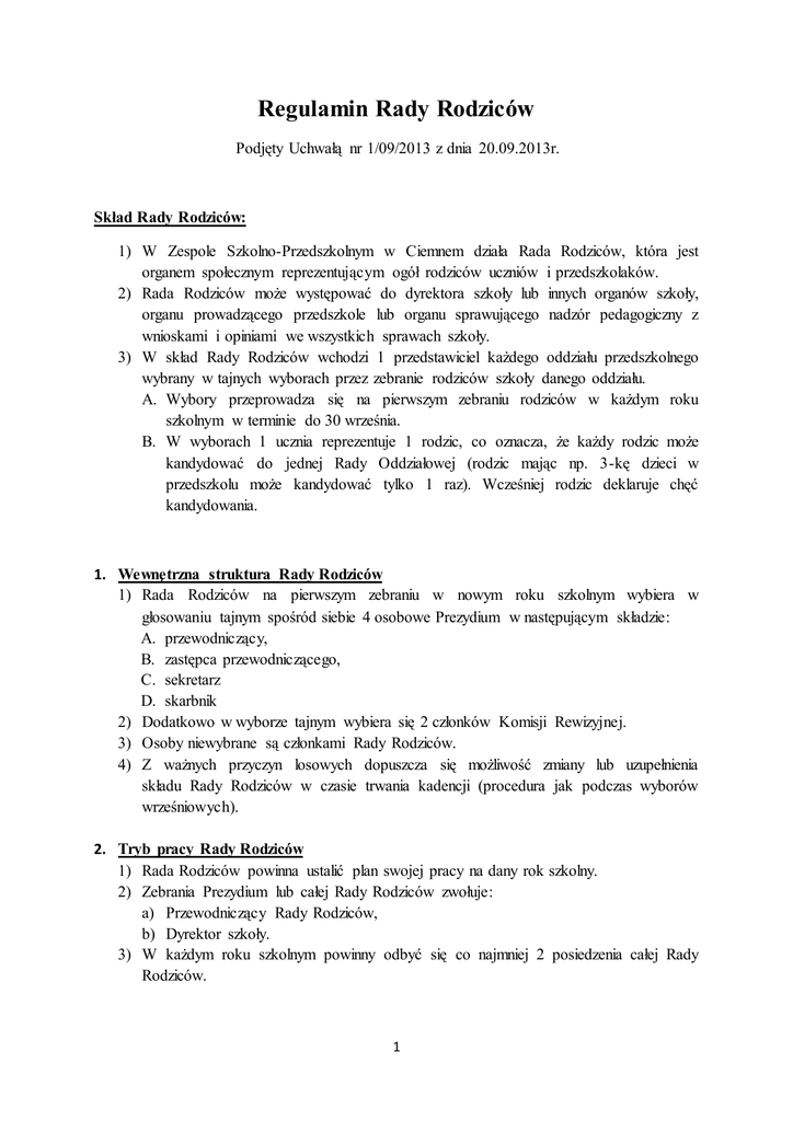 Regulamin Rady Rodziców Podjęty Uchwałą nr 1/09/2013 z dnia 20.09.2013r. Skład Rady Rodziców: 1) W Zespole Szkolno-Przedszkolnym w Ciemnem działa Rada Rodziców, która jest organem społecznym reprezentującym ogół rodziców uczniów i przedszkolaków. 2) Rada Rodziców może występować do dyrektora szkoły lub innych organów szkoły, organu prowadzącego przedszkole lub organu sprawującego nadzór pedagogiczny z wnioskami i opiniami we wszystkich sprawach szkoły. 3) W skład Rady Rodziców wchodzi 1 przedstawiciel każdego oddziału przedszkolnego wybrany w tajnych wyborach przez zebranie rodziców szkoły danego oddziału. A. Wybory przeprowadza się na pierwszym zebraniu rodziców w każdym roku szkolnym w terminie do 30 września. B. W wyborach 1 ucznia reprezentuje 1 rodzic, co oznacza, że każdy rodzic może kandydować do jednej Rady Oddziałowej (rodzic mając np. 3-kę dzieci w przedszkolu może kandydować tylko 1 raz). Wcześniej rodzic deklaruje chęć kandydowania. 1. Wewnętrzna struktura Rady Rodziców 1) Rada Rodziców na pierwszym zebraniu w nowym roku szkolnym wybiera w głosowaniu tajnym spośród siebie 4 osobowe Prezydium w następującym składzie: A. przewodniczący, B. zastępca przewodniczącego, C. sekretarz D. skarbnik 2) Dodatkowo w wyborze tajnym wybiera się 2 członków Komisji Rewizyjnej. 3) Osoby niewybrane są członkami Rady Rodziców. 4) Z ważnych przyczyn losowych dopuszcza się możliwość zmiany lub uzupełnienia składu Rady Rodziców w czasie trwania kadencji (procedura jak podczas wyborów wrześniowych). 2. Tryb pracy Rady Rodziców 1) Rada Rodziców powinna ustalić plan swojej pracy na dany rok szkolny. 2) Zebrania Prezydium lub całej Rady Rodziców zwołuje: a) Przewodniczący Rady Rodziców, b) Dyrektor szkoły. 3) W każdym roku szkolnym powinny odbyć się co najmniej 2 posiedzenia całej Rady Rodziców. 1 4) Zebranie jest prawomocne, gdy na zebraniu jest obecnych 2/3 składu całej Rady Rodziców. 5) Z zebrania sporządza się protokół, za który odpowiedzialne jest Prezydium Rady Rodziców. 3. Kompetencje Rady Rodziców 1) Rada Rodziców w porozumieniu z Radą Pedagogiczną uchwala: a) program wychowawczy szkoły, b) program profilaktyki. 2) Uchwały Rady Rodziców podejmowane są w drodze głosowania jawnego. Uchwała zapada zwykłą większością głosów w obecności 2/3 pełnego składu Rady Rodziców. 3) W przypadkach szczególnych dopuszcza się możliwość głosowania tajnego. 4) Rada Rodziców opiniuje : a) program i harmonogram poprawy efektywności kształcenia, b) program i harmonogram poprawy efektywności wychowania przedszkolnego, c) projekt planu finansowego, d) szkolny zestaw programów nauczania (w tym programy opracowane przez nauczycieli), e) szkolny zestaw podręczników na dany rok szkolny. 5) Ponadto Rada Rodziców: a) może wyrazić opinię o nauczycielu, który ubiega się o ocenę dorobku zawodowego, b) może wnioskować o dokonanie oceny pracy nauczyciela, z zastrzeżeniem, że ocena pracy nauczyciela może być dokonana w każdym czasie, nie wcześniej jednak niż po upływie roku od dokonania oceny poprzedniej lub oceny dorobku zawodowego, c) przyjmuje od rodziców propozycje dotyczące poprawy funkcjonowania placówki szkolno-przedszkolnej. d) przedstawiciele rodziców uczestniczą w pracach komisji konkursowej wyłaniającej kandydata na stanowisko dyrektora szkoły. 4. Obowiązki dyrektora szkoły wobec Rady Rodziców 1) W porozumieniu z Radą Rodziców dyrektor szkoły określa wzór jednolitego stroju dla uczniów, 2) Do 15 września każdego roku dyrektor szkoły przedstawia Radzie Rodziców plan nadzoru pedagogicznego. 3) Przed zakończeniem każdego roku przedszkolnego przedkłada informację o realizacji planu nadzoru pedagogicznego zawierającą: a) zakres wykonania pracy, b) wnioski z analizy poziomu osiągnięć edukacyjnych szkoły z uwzględnieniem ich możliwości rozwojowych, wymagań edukacyjnych wynikających z podstawy programowej, oraz wyników OKE. c) ocenę sytuacji wychowawczej oraz stanu opieki nad uczniami, 2 d) podjęte działania wynikające ze sprawowania nadzoru pedagogicznego. 5. Zasady uchwalania opiniowania dokumentów szkolnych przez Radę Rodziców (program wychowawczy i profilaktyki, szkolny zestaw programów nauczania, szkolny zestaw podręczników) 1) Dyrektor szkoły przedkłada do zaopiniowania Radzie Rodziców dokumenty wypracowane przez Radę Pedagogiczną. 2) Rada Rodziców zapoznaje się z treścią dokumentów podczas zebrania i opiniuje (pozytywnie lub negatywnie) poprzez stwierdzenie „Rada Rodziców zapoznała się z treścią ………………………………. w dniu ……………..i opiniuje go pozytywnie /negatywnie.”Następnie składa podpisy na końcu opiniowanego dokumentu. 3) Gdy objętość dokumentu jest zbyt duża by dokonać analizy i wydać opinię podczas jednego zebrania Rada Rodziców może spotkać się jeszcze w dodatkowym terminach, by zaopiniować dokument. W tym wypadku zaopiniowany dokument dyrektorowi dostarcza Przewodniczący Rady Rodziców w terminie 7 dni od daty przedłożenia dokumentu do opiniowania przez dyrektora. 4) W przypadku braku porozumienia w zakresie treści dokumentów przedłożonych przez dyrektora do zaopiniowania Radzie Rodziców, Rada Rodziców może rozpocząć pracę nad nową wersją programów, które można poprzedzić diagnozami czy szerszymi konsultacjami. Tak więc Rada Rodziców ma prawo własnego sformułowania treści całego dokumentu lub obowiązek uszczegółowienia obszarów do zmiany. Rada Pedagogiczna wprowadza zmiany i przedkłada Radzie Rodziców poprawiony dokument do ponownego zaopiniowania. 6. Tryb wydania opinii o pracy nauczyciela związanej z oceną dorobku zawodowego. 1) Dyrektor zwraca się pisemnie do przewodniczącego Rady Rodziców z prośbą o przedstawienie opinii o nauczycielu ………………… w związku z dokonywaniem oceny jego dorobku zawodowego. 2) 