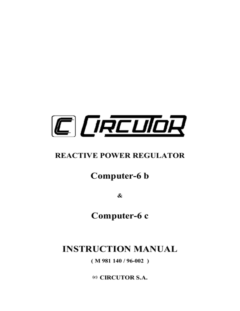 REACTIVE POWER REGULATOR Computer-6 b & Computer-6 c INSTRUCTION MANUAL ( M 981 140 / 96-002 ) (c) CIRCUTOR S.A. ---- 1.- COMPUTER 6 b / 6 c REGULATOR Page Nº 2 BASIC INSTRUCTIONS 1.1.- Delivery spot check This manual is issued to help all the Computer 6b & 6c users to install and use it in order to get the best from it. After receiving the unit please check the following points: (a) Does this device corresponds to your order specifications? (b) Check if any damage was done during the shipment process. (c) Verify that it includes *One instruction manual . 1.2.- Connection procedures The manual you hold in your hands contains information and warnings that the user should respect in order to guarantee a proper operation of all the instrument functions and keep its safety conditions. Before connecting the instrument to the mains see all the installation specification described at the previous chapters named INSTALLATION AND STARTUP, INSTALLATION MODES and TECHNICAL CHARACTERISTICS. ---- 2.- COMPUTER 6 b / 6 c REGULATOR Page Nº 3 REACTIVE POWER REGULATOR COMPUTER 6b and COMPUTER 6c The computer 6b regulators (Front mounted knobs) and Computer 6c regulators ( rear mounted knobs) control the connection and disconnection of capacitor steps, depending on the consumed reactive current, in order to keep the power factor within a desired value. These devices have a front display indicating the cos ϕ measured value. Based on microelectronics technology CIRCUTOR designed the FCP control system (Fast Computerized Program). The regulator uses the microprocessor intelligence to take complex decisions which need a high calculation capacity. ---- COMPUTER 6 b / 6 c REGULATOR Page Nº 4 3.- DISPLAY AND LED SIGNS The front part of the regulator has the following control signs : A-B D E F Led - Shows the cos ϕ example: 95 means that measured cos ϕ is 0,95 - The sign " " indicates that the measured current is below the limits to enable correct reading. In such condition there is no connection of new capacitor steps Lights on when cos ϕ is inductive. Led Lights on when cos ϕ is capacitive. Led Lights on when the display (A-B) shows the rumber of capacitor steps connected (lights on when pushing button C). numerical display 4.- ADJUSTMENTS and PUSH BUTTONS : C Push button G Push button I Push button J K cos ϕ control C/K control To read the number of capacitor steps connected at that time. When C is released , the A-B display returns to its normal cosϕ indication for manual switching ON of capacitors. Increases the number of steps connected. for manual switching OFF of capacitors. Reduces the number of steps connected. Cos ϕ setting control from 0.85 ind. to 0.95 Cap. - Reactive current setting - May be manual or automatic. - C/ K : current of the first capacitor step divided for the transformer ratio. ---- COMPUTER 6 b / 6 c REGULATOR Page Nº 5 5.- INSTALLATION AND STARTUP The manual you hold in your hands contains information and warnings that the user should respect in order to guarantee a proper operation of all the instrument functions and keep its safety conditions. The instrument must not be powered and used until its definitive assembly on the cabinet’s door. Whether the instrument is not used as manufacturer’s specifications, the protection of the instrument can be damaged. When any protection failure is suspected to exist (for example, it presents external visible damages), the instrument must be immediately powered off. In this case contact a qualified service representative. 5.1.- INSTALLATION Before applying AC power to the, check following points : a.- Supply voltage : see rear part of your 6b & 6c (According Computer-6 model) - Frequency Supply tolerance Connection terminals Instrument burden : : : : 50 / 60 Hz + 10 % / --15 % Terminals 3 -4 or 3 - 5 5 VA b.- Maximum admissible current : Transformer of In / 5 A a.c. ---- COMPUTER 6 b / 6 c REGULATOR Page Nº 6 c.- Operation conditions : - Operating temperature : 0 to 50ºC - Humidity : 25 to 80 % R.H. noncondensing d.- Safety : Designed to meet protection class II as per EN 61010. 5.2.- CONNECTIONS Instrument is to be mounted on panel (cut-out 138+1 x 138+1 mm, as per DIN 43 700). All connections keep inside the cabinet. Note that with the instrument powered on, the terminals could be dangerous to touching and cover opening actions or elements removal may allow accessing dangerous parts. Therefore, the instrument must not be used until this is completely installed. The instrument must be connected to a power supply circuit protected with gl type (IEC 269 ) or M type fuses rated between 0.5 and 2 A. This circuit should be provided with an automatic switch or any equivalent element to disconnect the instrument from the power supply network. The supply and measuring voltage circuits will be both connected through a wire with a minimum cross-section of 1 2 mm . The line of the current transformer secondary will have a minimum cross2 section of 2,5 mm . ---- COMPUTER 6 b / 6 c REGULATOR Page Nº 7 Connect the equipment according to the connection schema at the outside part of the regulator : - For the start-up it is necessary to install a current transformer (normally In / 5 A ). The transformer has to be chosen according to the maximum current of the equipment. The secundary line of the current transformer has to be the section according with the distances to regulator. - The current transformer has to be installed in a connection point where the total current of the equipments is flowing, including the own capacitor current CORRECT - The current transformer must be fitted line-side of the battery and loads (motors, ....) WRONG - No capacitor connections because no current information is delivered by the CT. - Insure that the CT is not short circuited , or installation out of load. - All the capacitors connects and no regulation takes places in relation with the load of the main supply. Risk of an over compensation on a main-supply wit