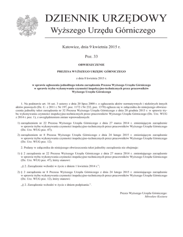 DZIENNIK URZĘDOWY Wyższego Urzędu Górniczego Katowice, dnia 9 kwietnia 2015 r. Poz. 33 OBWIESZCZENIE PREZESA WYŻSZEGO URZĘDU GÓRNICZEGO z dnia 8 kwietnia 2015 r. w sprawie ogłoszenia jednolitego tekstu zarządzenia Prezesa Wyższego Urzędu Górniczego w sprawie trybu wykonywania czynności inspekcyjno-technicznych przez pracowników Wyższego Urzędu Górniczego 1. Na podstawie art. 16 ust. 3 ustawy z dnia 20 lipca 2000 r. o ogłaszaniu aktów normatywnych i niektórych innych aktów prawnych (Dz. U. z 2011 r. Nr 197, poz. 1172 i Nr 232, poz. 1378) ogłasza się w załączniku do niniejszego obwieszczenia jednolity tekst zarządzenia nr 32 Prezesa Wyższego Urzędu Górniczego z dnia 20 grudnia 2013 r. w sprawie trybu wykonywania czynności inspekcyjno-technicznych przez pracowników Wyższego Urzędu Górniczego (Dz. Urz. WUG z 2014 r. poz. 1), z uwzględnieniem zmian wprowadzonych: 1)zarządzeniem nr 22 Prezesa Wyższego Urzędu Górniczego z dnia 27 marca 2014 r. zmieniającym zarządzenie w sprawie trybu wykonywania czynności inspekcyjno-technicznych przez pracowników Wyższego Urzędu Górniczego (Dz. Urz. WUG poz. 47); 2)zarządzeniem nr 8 Prezesa Wyższego Urzędu Górniczego z dnia 24 lutego 2015 r. zmieniającym zarządzenie w sprawie trybu wykonywania czynności inspekcyjno-technicznych przez pracowników Wyższego Urzędu Górniczego (Dz. Urz. WUG poz. 12). 2. Podany w załączniku do niniejszego obwieszczenia tekst jednolity zarządzenia nie obejmuje: 1)§ 2 zarządzenia nr 22 Prezesa Wyższego Urzędu Górniczego z dnia 27 marca 2014 r. zmieniającego zarządzenie w sprawie trybu wykonywania czynności inspekcyjno-technicznych przez pracowników Wyższego Urzędu Górniczego (Dz. Urz. WUG poz. 47), który stanowi: „§ 2. Zarządzenie wchodzi w życie z dniem 1 kwietnia 2014 r.”; 2)§ 2 zarządzenia nr 8 Prezesa Wyższego Urzędu Górniczego z dnia 24 lutego 2015 r. zmieniającego zarządzenie w sprawie trybu wykonywania czynności inspekcyjno-technicznych przez pracowników Wyższego Urzędu Górniczego (Dz. Urz. WUG poz. 12), który stanowi: „§ 2. Zarządzenie wchodzi w życie z dniem podpisania.”. Prezes Wyższego Urzędu Górniczego: Mirosław Koziura Dziennik Urzędowy Wyższego Urzędu Górniczego – 2 – Poz. 33 Załącznik do obwieszczenia Prezesa Wyższego Urzędu Górniczego z dnia 8 kwietnia 2015 r. (poz. 33) ZARZĄDZENIE Nr 32 PREZESA WYŻSZEGO URZĘDU GÓRNICZEGO z dnia 20 grudnia 2013 r. w sprawie trybu wykonywania czynności inspekcyjno-technicznych przez pracowników Wyższego Urzędu Górniczego Na podstawie art. 165 ust. 1 oraz art. 166 ust. 2 ustawy z dnia 9 czerwca 2011 r. — Prawo geologiczne i górnicze (Dz. U. z 2015 r. poz. 196) zarządza się, co następuje: Rozdział 1 Przepisy ogólne § 1. 1. Zarządzenie określa tryb wykonywania czynności inspekcyjno-technicznych przez pracowników Wyższego Urzędu Górniczego, zwanego dalej „WUG”, w ramach zadań organów nadzoru górniczego oraz zadań organu wyspecjalizowanego w rozumieniu przepisów o systemie kontroli wyrobów. 2. W przypadku zadań z zakresu administracji architektoniczno-budowlanej i nadzoru budowlanego, wykonywanych przez organy nadzoru górniczego, przepisy zarządzenia stosuje się w przypadkach nieuregulowanych w przepisach prawa budowlanego. § 2. Ilekroć w zarządzeniu jest mowa o: 1)„czynnościach inspekcyjno-technicznych” — rozumie się przez to: a) przeprowadzanie kontroli w: siedzibie przedsiębiorcy, zakładach górniczych, miejscach wydobywania kopalin, zakładach prowadzących działalność określoną w art. 2 ust. 1 ustawy z dnia 9 czerwca 2011 r. — Prawo geologiczne i górnicze, zakładach wykonujących roboty geologiczne, o których mowa w art. 86 tej ustawy, podmiotach zawodowo trudniących się ratownictwem górniczym, jednostkach organizacyjnych prowadzących działalność szkoleniową, a także u przedsiębiorców produkujących, importujących lub wprowadzających do obrotu wyroby przeznaczone do stosowania w ruchu zakładu górniczego albo zakładu, b)dokonywanie kompleksowego sprawdzenia i oceny stanu bezpieczeństwa powszechnego, związanego z ruchem zakładu górniczego, stanu bezpieczeństwa pracy w górnictwie, stanu rozpoznania i zwalczania zagrożeń w zakładach górniczych, stanu ratownictwa górniczego oraz innych zagadnień związanych z prowadzeniem ruchu zakładów górniczych, c) czynności w zakresie pogotowia technicznego, d)ustalanie stanu faktycznego i przyczyn niebezpiecznych zdarzeń, wypadków oraz zgonów naturalnych, zaistniałych w ruchu zakładu górniczego albo zakładu, e) sprawowanie nadzoru nad prowadzeniem akcji ratowniczej oraz pracami prowadzonymi na zasadach akcji ratowniczej, f) niewymienione w lit. a—e czynności w terenie, w szczególności oględziny, niezbędne do zajęcia stanowiska przez Prezesa WUG, w ramach prowadzonych postępowań; 2)„pracowniku inspekcyjno-technicznym” — rozumie się przez to pracownika merytorycznego zatrudnionego w WUG, wykonującego czynności inspekcyjno-techniczne w zakładach górniczych, niezwiązane z obsługą prawną. § 3. Czynności inspekcyjno-techniczne są wykonywane przez pracowników inspekcyjno-technicznych, a w przypadkach określonych w zarządzeniu — także przez innych pracowników WUG. § 4. 1. Pracownicy inspekcyjno-techniczni są obowiązani prowadzić „Kartę pracy pracownika inspekcyjno-technicznego”. Dziennik Urzędowy Wyższego Urzędu Górniczego – 3 – Poz. 33 2. (uchylony)1) Rozdział 2 Kontrole § 5.2) Kontrole przeprowadza się w trybie: 1)kontroli, do której stosuje się przepisy dotyczące zawiadomienia o zamiarze jej wszczęcia oraz przepisy o ograniczeniu czasu jej trwania; 2)kontroli, do której stosuje się wyjątki określone w art. 84aa pkt 2 ustawy z dnia 2 lipca 2004 r. o swobodzie działalności gospodarczej (Dz. U. z 2013 r. poz. 672, z późn. zm.3)); 3)kontroli, do której stosuje się wyjątki określ