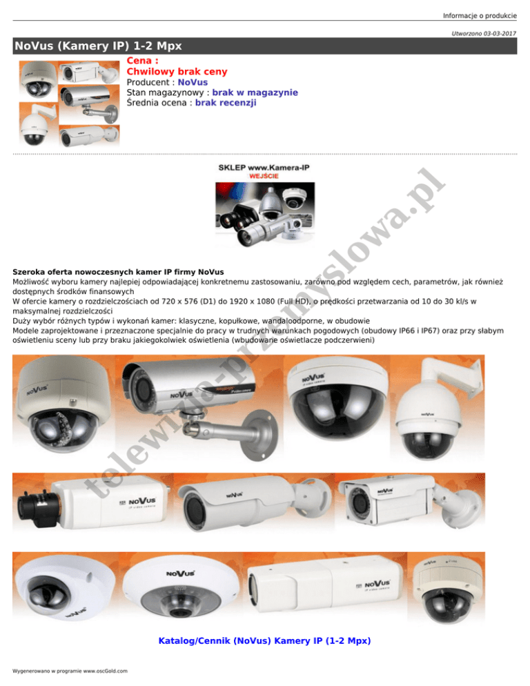 Informacje o produkcie Utworzono 03-03-2017 NoVus (Kamery IP) 1-2 Mpx Cena : Chwilowy brak ceny ze m ys lo w a. pl Producent : NoVus Stan magazynowy : brak w magazynie Średnia ocena : brak recenzji te le w iz ja -p r Szeroka oferta nowoczesnych kamer IP firmy NoVus Możliwość wyboru kamery najlepiej odpowiadającej konkretnemu zastosowaniu, zarówno pod względem cech, parametrów, jak również dostępnych środków finansowych W ofercie kamery o rozdzielczościach od 720 x 576 (D1) do 1920 x 1080 (Full HD), o prędkości przetwarzania od 10 do 30 kl/s w maksymalnej rozdzielczości Duży wybór różnych typów i wykonań kamer: klasyczne, kopułkowe, wandaloodporne, w obudowie Modele zaprojektowane i przeznaczone specjalnie do pracy w trudnych warunkach pogodowych (obudowy IP66 i IP67) oraz przy słabym oświetleniu sceny lub przy braku jakiegokolwiek oświetlenia (wbudowane oświetlacze podczerwieni) Katalog/Cennik (NoVus) Kamery IP (1-2 Mpx) Wygenerowano w programie www.oscGold.com KAMERY MEGAPIKSELOWE STACJONARNE 1.3 MPX Kamera IP z oświetlaczem IR w obudowie IP66, dzień/noc, 1.3 Mpx, CMOS 1/3", maks. rozdzielczość 1280 x 1024 pikseli, do 30 kl/s, 0.04lx (F1.8), 0lx (IR wł.); obiektyw f=4.2mm, F1.8, wyjście analogowe wideo, wejście audio, dwa niezależne strumienie, kompresja H.264, sprzętowa detekcja ruchu, zapis alarmowy na serwerze FTP, e-mail z załącznikiem, strefy prywatności, średnica obudowy 116mm, zasilanie PoE, 12VDC, oprogramowanie NMS w komplecie Kamera IP, wandaloodporna z oświetlaczem IR, IP66, dzień/noc, 1.3 Mpx, CMOS 1/3", maks. rozdzielczość 1280 x 1024 pikseli, do 30 kl/s, 0.03lx (F1.4), 0lx (IR wł.); obiektyw f=2.8~12mm, F1.4,wyjście analogowe wideo, wejście audio, dwa niezależne strumienie, kompresja H.264, sprzętowa detekcja ruchu, zapis alarmowy na karcie MicroSD, serwerze FTP, e-mail z załącznikiem, strefy prywatności, średnica obudowy 150mm, zasilanie PoE, 12VDC, oprogramowanie NMS w komplecie Kamera IP z oświetlaczem IR w obudowie IP66, dzień/noc, 1.3 Mpx, CMOS 1/3", maks. rozdzielczość 1280 x 1024 pikseli, do 30 kl/s, 0.04lx (F1.8), 0lx (IR wł.); obiektyw f=4.2mm, F1.8, wyjście analogowe wideo, wejście audio, dwa niezależne strumienie, kompresja H.264, sprzętowa detekcja ruchu, zapis alarmowy na serwerze FTP, e-mail z załącznikiem , strefy prywatności, zasilanie PoE, 12VDC, oprogramowanie NMS w komplecie Kamera IP z oświetlaczem IR w obudowie IP66, dzień/noc, 1.3 Mpx, CMOS 1/3", maks. rozdzielczość 1280 x 1024 pikseli, do 30 kl/s, 0.03lx (F1.4), 0lx (IR wł.); obiektyw f=2.8~12mm, F1.4, wyjście analogowe wideo, wejście audio, dwa niezależne strumienie, kompresja H.264, sprzętowa detekcja ruchu, zapis alarmowy na serwerze FTP, e-mail z załącznikiem , strefy prywatności, zasilanie PoE, 12VDC, oprogramowanie NMS w komplecie kod produktu NVIP-1DN3020V/IR-1P 899,00 pl NVIP-1DN3040V/IR-1P Cena netto 599,00 599,00 ze m ys lo w a. NVIP-1DN3000H/IR-1P NVIP-1DN3020H/IR-1P Kamera IP, wandaloodporna z oświetlaczem IR, IP66, dzień/noc, 2 Mpx, CMOS 1/3", maks. rozdzielczość 1920 x 1080 pikseli, do 30 kl/s, 0.03lx (F1.6), 0lx (IR wł.); obiektyw f=4mm, F1.6, wyjście analogowe wideo, wejście audio, dwa niezależne strumienie, kompresja H.264, sprzętowa detekcja ruchu, zapis alarmowy na serwerze FTP, e-mail z załącznikiem, strefy prywatności, średnica obudowy 116mm, zasilanie PoE, 12VDC, oprogramowanie NMS w komplecie Kamera IP, wandaloodporna z oświetlaczem IR, IP66, dzień/noc, 2 Mpx, CMOS 1/3", maks. rozdzielczość 1920 x 1080 pikseli, do 30 kl/s, 0.03lx (F1.4), 0lx (IR wł.); obiektyw f=2.8~12mm, F1.4, wyjście analogowe wideo, wejście/wyjście audio, dwa niezależne strumienie, kompresja H.264, sprzętowa detekcja ruchu, zapis alarmowy na karcie MicroSD, serwerze FTP, e-mail z załącznikiem, strefy prywatności, średnica obudowy 150mm, zasilanie PoE, 12VDC, oprogramowanie NMS w komplecie Kamera IP z oświetlaczem IR w obudowie IP66, dzień/noc, 2 Mpx, CMOS 1/3", maks. rozdzielczość 1920 x 1080 pikseli, do 30 kl/s, 0.03lx (F1.6), 0lx (IR wł.); obiektyw, f=4mm, F1.6, wyjście analogowe wideo, wejście audio, dwa niezależne strumienie, kompresja H.264, sprzętowa detekcja ruchu, zapis alarmowy na serwerze FTP, e-mail z załącznikiem , strefy prywatności, zasilanie PoE, 12VDC, oprogramowanie NMS w komplecie Cena netto 749,00 te le kod produktu NVIP-2DN3020V/IR-1P w iz ja NVIP-1DN5000H/IR-1P 2 MPX Kamera IP, wandaloodporna z oświetlaczem IR, IP66, dzień/noc (filtr IR), 1.3 Mpx, CMOS 1/3", maks. rozdzielczość 1280x960 pikseli, do 30 kl/s dla 1280x960, 0lx (włączony IR), funkcje: DSS,DNR; obiektyw F2.2 , f=3.6 mm , 649,00 standardowy, do trzech niezależnych strumieni, kompresja H.264 lub/i M-JPEG, sprzętowa detekcja ruchu, zapis alarmowy na karcie SD lub serwerze FTP, NAS, zasilanie PoE lub 12VDC, temperatura pracy od -10°C do +50°C, oprogramowanie NMS w komplecie Kamera IP z oświetlaczem IR w obudowie IP66, dzień/noc (filtr IR), 1.3 Mpx, CMOS 1/3", maks. rozdzielczość 1280x960 pikseli, do 30 kl/s dla 1280x960, 0lx (włączony IR), funkcje: DSS,DNR; obiektyw F2.2 , f=3.6 mm , standardowy, do trzech niezależnych strumieni, kompresja H.264 i M-JPEG, 649,00 sprzętowa detekcja ruchu, zapis alarmowy na serwerze FTP lub NAS, zasilanie PoE lub 12VDC, temperatura pracy od -10°C do +50°C, oprogramowanie NMS w komplecie -p r NVIP-1DN5000V/IR-1P 899,00 NVIP-2DN3040V/IR-1P NVIP-2DN3000H/IR-1P NVIP-2DN3020H/IR-1P Kamera IP z oświetlaczem IR w obudowie IP66, dzień/noc, 2 Mpx, CMOS 1/3", maks. rozdzielczość 1920 x 1080 pikseli, do 30 kl/s, 0.03lx (F1.4), 0lx (IR wł.); obiektyw f=2.8~12mm, F1.4, wyjście analogowe wideo, wejście audio, dwa niezależne strumienie, kompresja H.264, sprzętowa detekcja ruchu, zapis alarmowy na serwerze FTP, e-mail z załącznikiem , strefy prywatności, zasilanie PoE, 12VDC, oprogramowanie NMS w komplecie 1 199,00 749,00 1 099,00 Informacje o produkcie NVIP-2DN5000D/