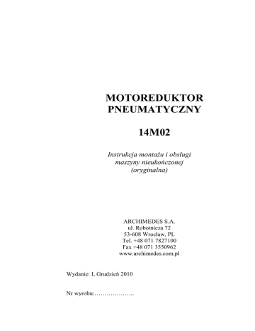 MOTOREDUKTOR PNEUMATYCZNY 14M02 Instrukcja montażu i obsługi maszyny nieukończonej (oryginalna) ARCHIMEDES S.A. ul. Robotnicza 72 53-608 Wrocław, PL Tel. +48 071 7827100 Fax +48 071 3550962 www.archimedes.com.pl Wydanie: I, Grudzień 2010 Nr wyrobu:……………….. 1. WSTĘP Niniejsza instrukcja powinna być starannie przechowywana i zawsze dostępna dla operatora, zakładowej służby BHP i innych osób związanych z obsługą motoreduktorów pneumatycznych. Informacje tu zawarte są istotne z punktu widzenia bezpieczeństwa pracy, właściwej eksploatacji, konserwacji i utylizacji wyrobu, a ponadto ułatwiają zamawianie części zamiennych. Użytkownik – przed zastosowaniem motoreduktora w wyrobie finalnym – powinien dokładnie zapoznać się z treścią niniejszego dokumentu i upewnić się, że informacje tu zawarte są dla niego zrozumiałe. W przypadku jakichkolwiek wątpliwości dotyczących wykorzystania naszych wyrobów, prosimy o kontakt ze sprzedawcą lub bezpośrednio z firmą Archimedes we Wrocławiu. Identyfikacja czasu produkcji wyrobu Wyroby pneumatyczne posiadają trwały, indywidualny numer fabryczny składający się z co najmniej pięciu cyfr. Dwie pierwsze cyfry odnoszą się do roku budowy wyrobu, a następne oznaczają kolejny egzemplarz wyrobu wyprodukowanego w danym roku. 2. CHARAKTERYSTYKA I PRZEZNACZENIE WYROBU Motoreduktor pneumatyczny to jednostka napędowa, zbudowane z silnika obrotowego napędzanego sprężonym powietrzem i z przekładni planetarnych redukujących obroty wrzeciona. Motoreduktory pneumatyczne przeznaczone są do zabudowy w wyrobie finalnym i służą jak źródło napędu różnego rodzaju urządzeń mechanicznych. Mają zastosowanie głównie tam, gdzie nie może być wykorzystany napęd elektryczny i gdzie wymagana jest znaczna moc przy małych gabarytach źródła napędu. -1- 3. PARAMETRY TECHNICZNO - EKSPLOATACYJNE Obroty biegu luzem Obroty mocy max Moc max. Moment obciążenia max. Moment startu max. Zużycie powietrza Średnica końcówki wrzeciona Masa Gniazdo końcówki powietrznej Średnica wewnętrzna przewodu powietrznego Ciśnienie zasilania (max.) Poziom ciśnienia akustycznego Poziom mocy akustycznej - 350 obr./min. - 175 obr./min. - 1,5 kW - 175 Nm - 140 Nm - 105 m3/h - ø 19h6 - 4,1 kg - G 3/8 - ø16 mm - 0,63 MPa - 88 dB/A/ - 99 dB/A/ 4. BEZPIECZEŃSTWO Przed zastosowaniem motoreduktora w wyrobie finalnym należy dokładnie zapoznać się z przepisami obowiązującymi w zakresie bezpieczeństwa maszyn oraz z treścią niniejszej instrukcji obsługi. Elementy ruchome motoreduktora (wrzeciono, sprzęgło) powinny być zabudowane osłoną. Nie wolno zwiększać ciśnienia powietrza roboczego powyżej 0,63 MPa. Zadbać o to, by w miejscu pracy był łatwy dostęp do urządzeń odcinających dopływ powietrza. Nie stosować uszkodzonych węży powietrznych. Wąż taki może być przyczyną wypadku. Stosować węże obliczone na ciśnienie robocze wynoszące co najmniej 0,63 MPa. Unikać nadmiernego smarowania narzędzia, ponieważ olej wydostający się z narzędzia w postaci mgły jest szkodliwy dla środowiska naturalnego i dla operatora. W przypadku przedostania się smaru lub oleju do oczu, należy bezwzględnie skorzystać z pomocy medycznej. Po zakończeniu pracy zamknąć zawór sieciowy sprężonego powietrza. -2- Uszkodzone urządzenie należy wycofać z użytkowania i ostrzegawczo oznaczyć. Motoreduktor, przed przeprowadzeniem konserwacji czy naprawy, należy odłączyć od sieci sprężonego powietrza. Nieprzestrzeganie ww. wymagań dotyczących bezpieczeństwa pracy może doprowadzić do wypadku, obrażeń ciała lub utraty zdrowia. Producent nie odpowiada za skutki powstałe w wyniku wykorzystania wyrobu w sposób niezgodny z jego przeznaczeniem. Uwaga: Hałas emitowany przez motoreduktory 14M02 jest wyższy od wartości dopuszczalnych – w odniesieniu do 8-godzinnego dobowego wymiaru czasu pracy – określonych w Rozporządzeniu Ministra Pracy i Polityki Społecznej z dnia 29.11.2002r. – Dziennik Ustaw Nr 161. Przy bezpośredniej obsłudze pracującego motoreduktora należy stosować ochronniki słuchu. W warunkach konkretnego zastosowania motoreduktora wartości tych parametrów mogą się zmieniać, co należy uwzględnić przy ocenie wyrobu finalnego. 5. PRZYGOTOWANIE DO PRACY Motoreduktor powinien być zasilany z sieci sprężonego powietrza o ciśnieniu nominalnym 0,63 MPa, wyposażonej w blok przygotowania powietrza – złożony z filtra, regulatora ciśnienia oraz smarownicy. Powietrze robocze powinno być zawsze czyste i pozbawione wilgoci; Powinno odpowiadać 4 klasie czystości wg PN-ISO8573-1. Zaleca się, by instalacja sprężonego powietrza wyposażona była w odwadniacz. Instalację powietrzną należy regularnie odwadniać. Końcówki powietrzne należy pewnie połączyć z przewodem sprężonego powietrza i koniecznie zabezpieczyć opaskami zaciskowymi. Należy unikać przewodów dłuższych niż 5 m, gdyż spadek ciśnienia w przewodzie powoduje obniżenie mocy urządzenia. W przypadku konieczności użycia dłuższych przewodów stosować najpierw przewód o większej średnicy, a następnie ok. 3 m przewód o średnicy nominalnej, tj. 16 mm. Dla zapewnienia skutecznego smarowania mgłą olejową, długość węża łączącego motoreduktor ze smarownicą nie powinna być większa niż 6÷10 m. -3- Schemat typowej instalacji sprężonego powietrza 6. INSTALOWANIE MOTOREDUKTORA Motoreduktor 14M02 należy używać tylko do prac, do których został zaprojektowany. Nie należy dokonywać przeróbek dla innego wykorzystania wyrobu. Uwaga: Motoreduktor należy pewnie zamocować w urządzeniu finalnym, za pomocą sześciu śrub M8 – wykorzystując gniazdo bazujące ø45H9. (Połączenie gwintowe zabezpieczyć przed samoczynnym odkręceniem.) Elementy odwodu pneumatycznego motoreduktora (w tym przewody zasilające) powinny gwarantować przepływ powietrza na poziomie 105 m3/h. Jest t