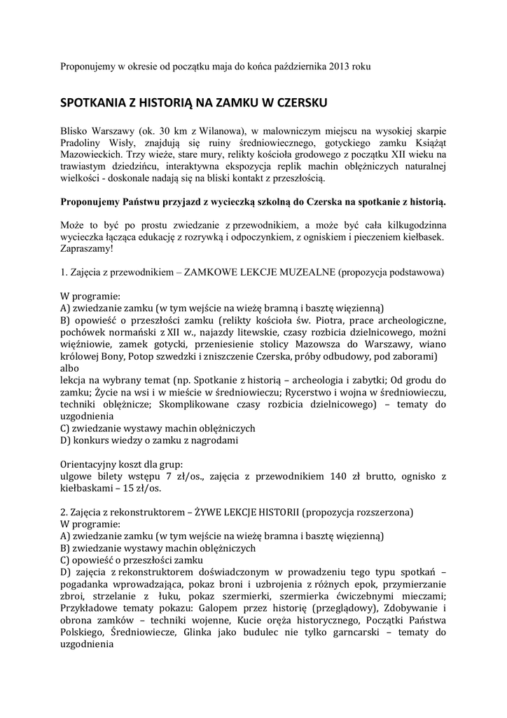 Proponujemy w okresie od początku maja do końca października 2013 roku SPOTKANIA Z HISTORIĄ NA ZAMKU W CZERSKU Blisko Warszawy (ok. 30 km z Wilanowa), w malowniczym miejscu na wysokiej skarpie Pradoliny Wisły, znajdują się ruiny średniowiecznego, gotyckiego zamku Książąt Mazowieckich. Trzy wieże, stare mury, relikty kościoła grodowego z początku XII wieku na trawiastym dziedzińcu, interaktywna ekspozycja replik machin oblężniczych naturalnej wielkości - doskonale nadają się na bliski kontakt z przeszłością. Proponujemy Państwu przyjazd z wycieczką szkolną do Czerska na spotkanie z historią. Może to być po prostu zwiedzanie z przewodnikiem, a może być cała kilkugodzinna wycieczka łącząca edukację z rozrywką i odpoczynkiem, z ogniskiem i pieczeniem kiełbasek. Zapraszamy! 1. Zajęcia z przewodnikiem – ZAMKOWE LEKCJE MUZEALNE (propozycja podstawowa) W programie: A) zwiedzanie zamku (w tym wejście na wieżę bramną i basztę więzienną) B) opowieść o przeszłości zamku (relikty kościoła św. Piotra, prace archeologiczne, pochówek normański z XII w., najazdy litewskie, czasy rozbicia dzielnicowego, możni więźniowie, zamek gotycki, przeniesienie stolicy Mazowsza do Warszawy, wiano królowej Bony, Potop szwedzki i zniszczenie Czerska, próby odbudowy, pod zaborami) albo lekcja na wybrany temat (np. Spotkanie z historią – archeologia i zabytki; Od grodu do zamku; Życie na wsi i w mieście w średniowieczu; Rycerstwo i wojna w średniowieczu, techniki oblężnicze; Skomplikowane czasy rozbicia dzielnicowego) – tematy do uzgodnienia C) zwiedzanie wystawy machin oblężniczych D) konkurs wiedzy o zamku z nagrodami Orientacyjny koszt dla grup: ulgowe bilety wstępu 7 zł/os., zajęcia z przewodnikiem 140 zł brutto, ognisko z kiełbaskami – 15 zł/os. 2. Zajęcia z rekonstruktorem – ŻYWE LEKCJE HISTORII (propozycja rozszerzona) W programie: A) zwiedzanie zamku (w tym wejście na wieżę bramna i basztę więzienną) B) zwiedzanie wystawy machin oblężniczych C) opowieść o przeszłości zamku D) zajęcia z rekonstruktorem doświadczonym w prowadzeniu tego typu spotkań – pogadanka wprowadzająca, pokaz broni i uzbrojenia z różnych epok, przymierzanie zbroi, strzelanie z łuku, pokaz szermierki, szermierka ćwiczebnymi mieczami; Przykładowe tematy pokazu: Galopem przez historię (przeglądowy), Zdobywanie i obrona zamków – techniki wojenne, Kucie oręża historycznego, Początki Państwa Polskiego, Średniowiecze, Glinka jako budulec nie tylko garncarski – tematy do uzgodnienia Orientacyjny koszt dla grup: ulgowe bilety wstępu 7 zł/os., zajęcia z rekonstruktorem 480 zł netto, z rekonstruktorem i przewodnikiem 580 zł netto, ognisko z kiełbaskami – 15 zł/os. Dodatkowe informacje, ustalenie tematyki zajęć i płatności oraz rezerwacja terminów ŻYWYCH LEKCJI HISTORII NA ZAMKU W CZERSKU pod numerem 693 022 639 lub na mail [email protected] UWAGA! Konieczna wcześniejsza rezerwacja. Zapraszamy!