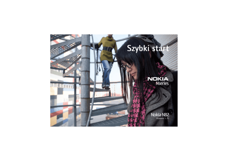 Szybki start Nokia N82 Model: N82-1 Wydanie 1. PL Klawisze i inne elementy (przód) Numer modelu: Nokia N82-1. Nazywany w dalszej czê¶ci Nokia N82. 1 Klawisz wy³±cznika 2 Z³±cze Nokia AV (3,5) mm do pod³±czania kompatybilnych zestawów s³uchawkowych, s³uchawek lub kabli wyj¶cia telewizyjnego 3 Czujnik ¶wiat³a 4 Kamera pomocnicza o ni¿szej rozdzielczo¶ci 5 Klawisze wyboru Wskazówka: Aby zablokowaæ lub odblokowaæ klawiaturê, naci¶nij lewy klawisz wyboru, a nastêpnie . 6 Klawisz po³±czenia 7 Klawisz menu 8 Klawiatura numeryczna 9 Klawisz przewijania 10 Klawisz usuwania C 11 Klawisz multimedialny 12 Klawisz zakoñczenia 2 Klawisze i inne elementy (ty³ i boki) 1 2 3 4 5 G³o¶niki stereo z efektem d¼wiêku przestrzennego W³±cznik kamery z os³on± obiektywu Klawisz pomniejszania/powiêkszania i g³o¶no¶ci Ksenonowa lampa b³yskowa Kamera g³ówna do robienia zdjêæ i nagrywania wideo o wysokiej rozdzielczo¶ci (do 5 megapikseli) 6 Klawisz galerii 7 2-stopniowy klawisz fotografowania do automatycznego ustawiania ostro¶ci, robienia zdjêæ oraz nagrywania wideo 8 Z³±cze micro USB umo¿liwiaj±ce po³±czenie z kompatybilnym komputerem 9 Gniazdo kompatybilnej karty pamiêci microSD 10 Z³±cze ³adowarki 11 Mikrofon 3 Wk³adanie karty (U)SIM i baterii Karta USIM to udoskonalona wersja karty SIM, przeznaczona do u¿ytku w telefonach UMTS. powinny byæ skierowane w dó³. Przesuñ uchwyt w lewo, z powrotem do gniazda, aby zablokowaæ go na miejscu. Wszystkie karty SIM nale¿y przechowywaæ w miejscu niedostêpnym dla ma³ych dzieci. Przed wyjêciem baterii zawsze nale¿y wy³±czyæ telefon i od³±czyæ go od ³adowarki. 1 Odwróæ urz±dzenie ty³em do przodu, naci¶nij i przytrzymaj przycisk zwalniaj±cy obudowê, przesuñ obudowê, a nastêpnie j± unie¶. 4 W³ó¿ bateriê. 2 Aby odblokowaæ uchwyt karty SIM, przesuñ go w prawo i unie¶. 5 Umie¶æ ty³ obudowy we w³a¶ciwym miejscu, tak aby zatrzaski blokuj±ce by³y skierowane w kierunku ich otworów, a nastêpnie wsuñ obudowê na miejsce. 3 W³ó¿ kartê SIM do uchwytu. ¦ciêty róg karty powinien pokrywaæ siê ze ¶ciêtym rogiem uchwytu, a jej styki 4 W³±czanie urz±dzenia £adowanie baterii 1 Naci¶nij i przytrzymaj 1 Pod³±cz kompatybiln± klawisz wy³±cznika. 2 Je¶li urz±dzenie za¿±da podania kodu PIN lub kodu blokady, wprowad¼ ten kod i naci¶nij lewy klawisz wyboru. Fabrycznie ustawionym kodem blokady jest ci±g cyfr 12345. Urz±dzenie to ma anteny wewnêtrzne. ³adowarkê do gniazdka sieci elektrycznej. 2 Przewód ³adowarki pod³±cz do urz±dzenia. Je¶li bateria by³a ca³kowicie roz³adowana, mo¿e up³yn±æ trochê czasu, zanim wska¼nik ³adowania zacznie siê przesuwaæ. 3 Gdy bateria zostanie w pe³ni na³adowana, wska¼nik ³adowania przestanie siê przesuwaæ. Od³±cz ³adowarkê najpierw od urz±dzenia, a potem od gniazdka sieci elektrycznej. Wskazówka: gdy ³adowarka nie jest u¿ywana, od³±cz j± od urz±dzenia i gniazdka sieciowego. £adowarka w³o¿ona do gniazdka zu¿ywa energiê, nawet je¿eli nie jest pod³±czona do urz±dzenia. Uwaga: Tak jak w przypadku ka¿dego innego urz±dzenia nadawczo-odbiorczego, nie dotykaj bez potrzeby funkcjonuj±cej anteny. Na przyk³ad, unikaj dotykania anteny komórkowej w trakcie rozmowy telefonicznej. Kontakt z anten± wysy³aj±c± lub odbieraj±c± sygna³ wp³ywa na jako¶æ komunikacji radiowej, mo¿e przyczyniaæ siê do niepotrzebnego wzrostu pobieranej przez urz±dzenie energii i mo¿e spowodowaæ skrócenie ¿ywotno¶ci baterii. 1 Antena komórkowa 2 Antena Bluetooth/ bezprzewodowej sieci lokalnej 3 Odbiornik GPS 5 Karta pamiêci Korzystaj wy³±cznie z kart pamiêci microSD kompatybilnych i zatwierdzonych przez firmê Nokia do u¿ytku z tym urz±dzeniem. Chocia¿ firma Nokia przestrzega standardów przyjêtych w bran¿y kart pamiêci, to karty niektórych producentów mog± nie byæ w pe³ni kompatybilne z tym urz±dzeniem. Niekompatybilna karta mo¿e ulec uszkodzeniu i uszkodziæ urz±dzenie. Istnieje te¿ ryzyko utraty danych zapisanych na takiej karcie. kompatybiln± kartê pamiêci. Z³±cza karty powinny byæ skierowane w górê i w kierunku gniazda. 3 Wci¶nij kartê. Karty pamiêci nale¿y przechowywaæ w miejscu niedostêpnym dla ma³ych dzieci. Gdy karta zatrza¶nie siê na swoim miejscu, us³yszysz klikniêcie. 4 Wsuñ z powrotem zawias i zamknij pokrywê. Sprawd¼, czy pokrywa jest dobrze zamkniêta. Wk³adanie karty pamiêci Wyjmowanie karty pamiêci Karta pamiêci mo¿e ju¿ byæ w³o¿ona do urz±dzenia. W przeciwnym razie wykonaj nastêpuj±ce czynno¶ci: 1 W³ó¿ palec w szczelinê pod pokryw± gniazda karty pamiêci i unie¶ pokrywê. Odci±gnij pokrywê w lewo, aby ods³oniæ zawias, a nastêpnie odsuñ j± na bok. 6 2 W³ó¿ do gniazda Wa¿ne: nigdy nie wyjmuj karty pamiêci w trakcie wykonywania operacji na tej karcie. Wyjêcie karty w takim momencie mo¿e spowodowaæ uszkodzenie samej karty pamiêci, jak równie¿ urz±dzenia. Uszkodzeniu mog± te¿ ulec zapisane na karcie dane. Aby wysun±æ kartê pamiêci, wykonaj nastêpuj±ce czynno¶ci: 1 Przed wyjêciem karty pamiêci naci¶nij klawisz wy³±cznika, a nastêpnie wybierz Usuñ kartê pamiêci. Wszystkie aplikacje zostan± zamkniête. 2 Gdy zostanie wy¶wietlony komunikat Wyjmuj±c kartê 2 Aby zablokowaæ ostro¶æ pamiêci, zamkniesz otwarte aplikacje. Chcesz wyj±æ mimo to?, wybierz Tak. 3 Gdy zostanie wy¶wietlony komunikat Wyjmij kartê pamiêci i naci¶nij „OK”, otwórz pokrywê gniazda karty pamiêci. 4 Naci¶nij kartê, aby zwolniæ jej zatrzask. 5 Wyjmij kartê pamiêci. Je¶li urz±dzenie jest w³±czone, wybierz OK. na obiekcie, naci¶nij klawisz fotografowania do po³owy (dotyczy tylko kamery g³ównej; ta opcja jest niedostêpna w trybach scen krajobraz i sport). Na wy¶wietlaczu pojawi siê zielony wska¼nik blokady ostro¶ci. Je¶li ostro¶æ nie zosta³a ustawiona, pojawi siê czerwony wska¼nik ostro¶ci. 3 Aby zrobiæ z