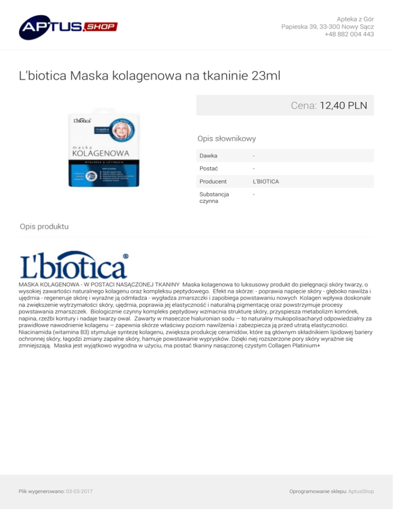 Apteka z Gór Papieska 39, 33-300 Nowy Sącz +48 882 004 443 L'biotica Maska kolagenowa na tkaninie 23ml Cena: 12,40 PLN Opis słownikowy Dawka - Postać - Producent L'BIOTICA Substancja czynna - Opis produktu MASKA KOLAGENOWA - W POSTACI NASĄCZONEJ TKANINY Maska kolagenowa to luksusowy produkt do pielęgnacji skóry twarzy, o wysokiej zawartości naturalnego kolagenu oraz kompleksu peptydowego. Efekt na skórze: - poprawia napięcie skóry - głęboko nawilża i ujędrnia - regeneruje skórę i wyraźne ją odmładza - wygładza zmarszczki i zapobiega powstawaniu nowych Kolagen wpływa doskonale na zwiększenie wytrzymałości skóry, ujędrnia, poprawia jej elastyczność i naturalną pigmentację oraz powstrzymuje procesy powstawania zmarszczek. Biologicznie czynny kompleks peptydowy wzmacnia strukturę skóry, przyspiesza metabolizm komórek, napina, rzeźbi kontury i nadaje twarzy owal. Zawarty w maseczce hialuronian sodu – to naturalny mukopolisacharyd odpowiedzialny za prawidłowe nawodnienie kolagenu – zapewnia skórze właściwy poziom nawilżenia i zabezpiecza ją przed utratą elastyczności. Niacinamida (witamina B3) stymuluje syntezę kolagenu, zwiększa produkcję ceramidów, które są głównym składnikiem lipidowej bariery ochronnej skóry, łagodzi zmiany zapalne skóry, hamuje powstawanie wyprysków. Dzięki niej rozszerzone pory skóry wyraźnie się zmniejszają. Maska jest wyjątkowo wygodna w użyciu, ma postać tkaniny nasączonej czystym Collagen Platinium+ Plik wygenerowano: 03-03-2017 Powered by TCPDF (www.tcpdf.org) Oprogramowanie sklepu: AptusShop