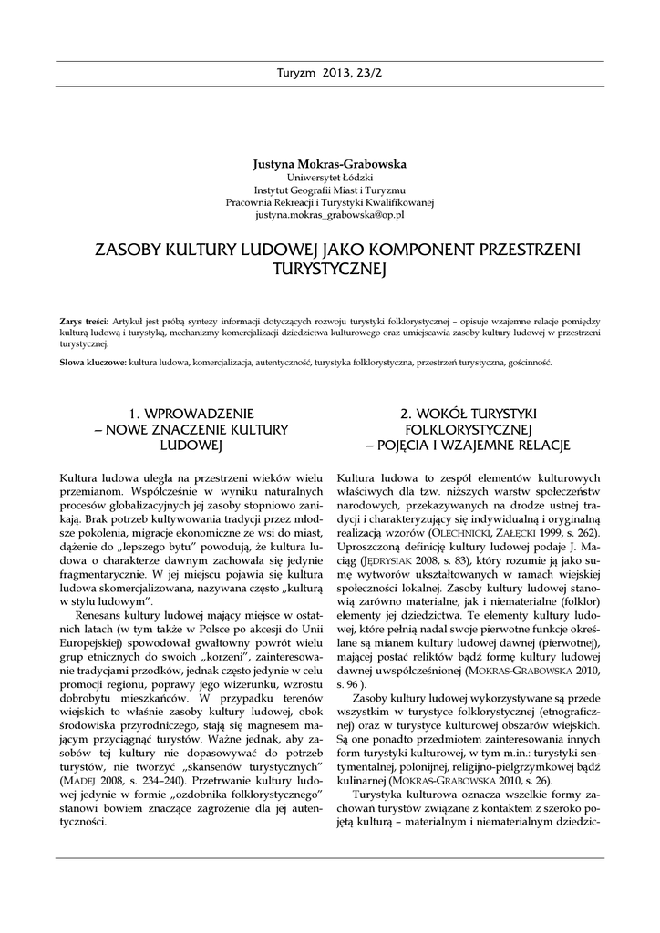 Turyzm 2013, 23/2 Justyna Mokras-Grabowska Uniwersytet Łódzki Instytut Geografii Miast i Turyzmu Pracownia Rekreacji i Turystyki Kwalifikowanej [email protected] ZASOBY KULTURY LUDOWEJ JAKO KOMPONENT PRZESTRZENI TURYSTYCZNEJ Zarys treści: Artykuł jest próbą syntezy informacji dotyczących rozwoju turystyki folklorystycznej – opisuje wzajemne relacje pomiędzy kulturą ludową i turystyką, mechanizmy komercjalizacji dziedzictwa kulturowego oraz umiejscawia zasoby kultury ludowej w przestrzeni turystycznej. Słowa kluczowe: kultura ludowa, komercjalizacja, autentyczność, turystyka folklorystyczna, przestrzeń turystyczna, gościnność. 1. WPROWADZENIE – NOWE ZNACZENIE KULTURY LUDOWEJ 2. WOKÓŁ TURYSTYKI FOLKLORYSTYCZNEJ – POJĘCIA I WZAJEMNE RELACJE Kultura ludowa uległa na przestrzeni wieków wielu przemianom. Współcześnie w wyniku naturalnych procesów globalizacyjnych jej zasoby stopniowo zanikają. Brak potrzeb kultywowania tradycji przez młodsze pokolenia, migracje ekonomiczne ze wsi do miast, dążenie do „lepszego bytu” powodują, że kultura ludowa o charakterze dawnym zachowała się jedynie fragmentarycznie. W jej miejscu pojawia się kultura ludowa skomercjalizowana, nazywana często „kulturą w stylu ludowym”. Renesans kultury ludowej mający miejsce w ostatnich latach (w tym także w Polsce po akcesji do Unii Europejskiej) spowodował gwałtowny powrót wielu grup etnicznych do swoich „korzeni”, zainteresowanie tradycjami przodków, jednak często jedynie w celu promocji regionu, poprawy jego wizerunku, wzrostu dobrobytu mieszkańców. W przypadku terenów wiejskich to właśnie zasoby kultury ludowej, obok środowiska przyrodniczego, stają się magnesem mającym przyciągnąć turystów. Ważne jednak, aby zasobów tej kultury nie dopasowywać do potrzeb turystów, nie tworzyć „skansenów turystycznych” (MADEJ 2008, s. 234–240). Przetrwanie kultury ludowej jedynie w formie „ozdobnika folklorystycznego” stanowi bowiem znaczące zagrożenie dla jej autentyczności. Kultura ludowa to zespół elementów kulturowych właściwych dla tzw. niższych warstw społeczeństw narodowych, przekazywanych na drodze ustnej tradycji i charakteryzujący się indywidualną i oryginalną realizacją wzorów (OLECHNICKI, ZAŁĘCKI 1999, s. 262). Uproszczoną definicję kultury ludowej podaje J. Maciąg (JĘDRYSIAK 2008, s. 83), który rozumie ją jako sumę wytworów ukształtowanych w ramach wiejskiej społeczności lokalnej. Zasoby kultury ludowej stanowią zarówno materialne, jak i niematerialne (folklor) elementy jej dziedzictwa. Te elementy kultury ludowej, które pełnią nadal swoje pierwotne funkcje określane są mianem kultury ludowej dawnej (pierwotnej), mającej postać reliktów bądź formę kultury ludowej dawnej uwspółcześnionej (MOKRAS-GRABOWSKA 2010, s. 96 ). Zasoby kultury ludowej wykorzystywane są przede wszystkim w turystyce folklorystycznej (etnograficznej) oraz w turystyce kulturowej obszarów wiejskich. Są one ponadto przedmiotem zainteresowania innych form turystyki kulturowej, w tym m.in.: turystyki sentymentalnej, polonijnej, religijno-pielgrzymkowej bądź kulinarnej (MOKRAS-GRABOWSKA 2010, s. 26). Turystyka kulturowa oznacza wszelkie formy zachowań turystów związane z kontaktem z szeroko pojętą kulturą – materialnym i niematerialnym dziedzic- 48 Turyzm 2013, 23/2 twem obszaru. Turystyka kulturowa sensu largo obejmuje podróże, których sednem jest bliższy kontakt turysty z mieszkańcami, chłonięcie atmosfery miejsca (STASIAK 2007, s. 8). Za kulturę w ujęciu szerokim uważa się całokształt duchowego i materialnego dorobku społeczeństw, przekazywanego z pokolenia na pokolenie. A. KOWALCZYK (2008, s. 13) stwierdza, że turystykę kulturową w wąskim znaczeniu można definiować jako zespól zachowań turystów związanych z ich autentycznym zainteresowaniem dziedzictwem kulturowym oraz uczestnictwem w życiu kulturalnym. Tak rozumiana turystyka kulturowa jest zjawiskiem przestrzennym osadzonym w krajobrazie kulturowym, powstającym wskutek przekształcania krajobrazu naturalnego. Integralną częścią krajobrazu kulturowego są zasoby i walory kulturowe, w tym związane z kulturą ludową. Jak już zostało wspomniane, formą turystyki je wykorzystującą jest turystyka folklorystyczna, zwana także turystyką etnograficzną (ang. ethnotourism) (KOWALCZYK 2008, s. 48). W literaturze przedmiotu stosowany jest ponadto termin tribal tourism, odnoszący się jednak najczęściej do obszarów, w których nadal funkcjonuje kultura plemienna. Turystyka folklorystyczna wykorzystuje przede wszystkim: skanseny, muzea regionalne, imprezy kulturalne, sanktuaria, gwarę i tradycje kulinarne. Wynikające ze wspomnianej definicji turystyki kulturowej pojęcie autentyczności kultury ludowej zdaje się jednak budzić wiele wątpliwości. Jak podaje K. REMBOWSKA (2008, s. 19): „turystyka to skomercjalizowane doznanie kulturowe”. Obserwowany wzrost zainteresowania turystów życiem codziennym mieszkańców obszarów wiejskich, ich kulturą, zwyczajami, rękodziełem ludowym, niesie w sobie bowiem niebezpieczeństwo zatarcia się granicy między tym, co autentyczne a tym, co jest sztucznie wypreparowaną atrakcją turystyczną o uproszczonej formie i przekazie. Podstawą autentyzmu jest ludzka spontaniczność, dobrowolność, realizowanie źródłowych i prawdziwych pragnień jednostki (ZOWISŁO 2011, s. 64). Jej przeciwieństwem jest bezkrytyczne i automatyczne przyswajanie zewnętrznych wzorców. Pojawiają się wówczas tendencje do przeciętności, rozproszenia i działania mechanicznego. Sprzyja temu postawa człowieka ponowoczesnego – konsumenta i kolekcjonera wrażeń „w płynnej rzeczywistości” pozbawionej pryncypiów (ZOWISŁO 2011, s. 77). W odniesieniu do komercjalizacji kultury ludowej pod wpływem turystyki można mówić o autentyczności w aspekcie wierności ideałom i wzorcom oraz autenty