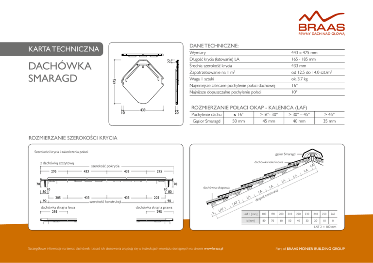 Dane techniczne: Karta techniczna 27 475 Dachówka SMARAGD Wymiary Długość krycia (łatowanie) LA Średnia szerokość krycia Zapotrzebowanie na 1 m2 Waga 1 sztuki Najmniejsze zalecane pochylenie połaci dachowej Najniższe dopuszczalne pochylenie połaci 10 433 20 443 x 475 mm 165 - 185 mm 433 mm od 12,5 do 14,0 szt./m2 ok. 3,7 kg 16° 10° Rozmierzanie połaci okap - kalenica (LAF) Pochylenie dachu Gąsior Smaragd ≤ 16° 50 mm >16°- 30° 45 mm > 30° – 45° 40 mm > 45° 35 mm Rozmierzanie SZEROKOŚCI KRYCIA Szerokości krycia i zakończenia połaci z dachówką szczytową 295 295 gąsior Smaragd dachówka kalenicowa szerokość pokrycia 433 433 433 433 295 295 70 70 70 70 80 80 90 90 10 10 10 10 205 205 dachówka skrajna lewa 295 295 433 433 szerokość konstrukcji 433 433 205 205 80 80 LA 90 90 k LAT 1 2 LAT LA LA LA ji ukc LA nstr o k ść ługo dachówka okapowa dachówka skrajna prawa 295 295 LA LAF d LAT 1 [mm] 180 190 200 210 220 230 240 250 260 k [mm] 80 70 60 50 40 30 20 10 0 LAT 2 = 180 mm Szczegółowe informacje na temat dachówek i zasad ich stosowania znajdują się w instrukcjach montażu dostępnych na stronie www.braas.pl