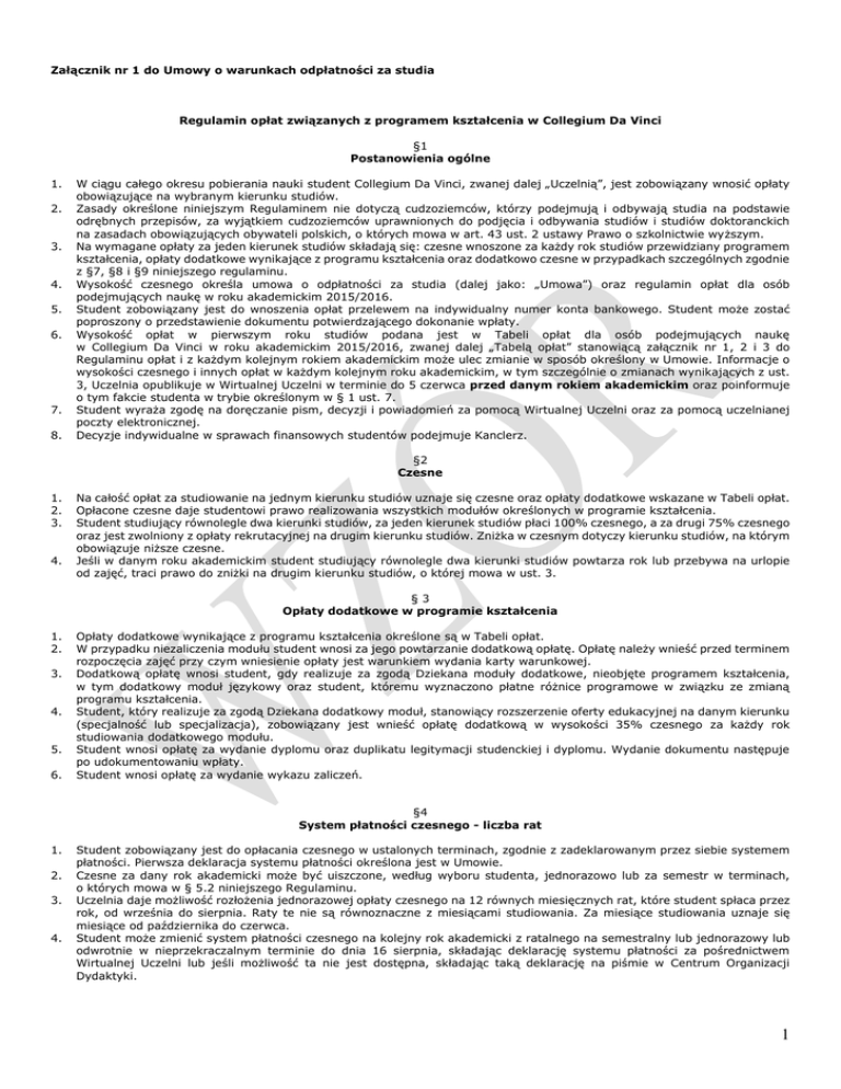 Załącznik nr 1 do Umowy o warunkach odpłatności za studia Regulamin opłat związanych z programem kształcenia w Collegium Da Vinci §1 Postanowienia ogólne 1. 2. 3. 4. 5. 6. 7. 8. W ciągu całego okresu pobierania nauki student Collegium Da Vinci, zwanej dalej „Uczelnią”, jest zobowiązany wnosić opłaty obowiązujące na wybranym kierunku studiów. Zasady określone niniejszym Regulaminem nie dotyczą cudzoziemców, którzy podejmują i odbywają studia na podstawie odrębnych przepisów, za wyjątkiem cudzoziemców uprawnionych do podjęcia i odbywania studiów i studiów doktoranckich na zasadach obowiązujących obywateli polskich, o których mowa w art. 43 ust. 2 ustawy Prawo o szkolnictwie wyższym. Na wymagane opłaty za jeden kierunek studiów składają się: czesne wnoszone za każdy rok studiów przewidziany programem kształcenia, opłaty dodatkowe wynikające z programu kształcenia oraz dodatkowo czesne w przypadkach szczególnych zgodnie z §7, §8 i §9 niniejszego regulaminu. Wysokość czesnego określa umowa o odpłatności za studia (dalej jako: „Umowa”) oraz regulamin opłat dla osób podejmujących naukę w roku akademickim 2015/2016. Student zobowiązany jest do wnoszenia opłat przelewem na indywidualny numer konta bankowego. Student może zostać poproszony o przedstawienie dokumentu potwierdzającego dokonanie wpłaty. Wysokość opłat w pierwszym roku studiów podana jest w Tabeli opłat dla osób podejmujących naukę w Collegium Da Vinci w roku akademickim 2015/2016, zwanej dalej „Tabelą opłat” stanowiącą załącznik nr 1, 2 i 3 do Regulaminu opłat i z każdym kolejnym rokiem akademickim może ulec zmianie w sposób określony w Umowie. Informacje o wysokości czesnego i innych opłat w każdym kolejnym roku akademickim, w tym szczególnie o zmianach wynikających z ust. 3, Uczelnia opublikuje w Wirtualnej Uczelni w terminie do 5 czerwca przed danym rokiem akademickim oraz poinformuje o tym fakcie studenta w trybie określonym w § 1 ust. 7. Student wyraża zgodę na doręczanie pism, decyzji i powiadomień za pomocą Wirtualnej Uczelni oraz za pomocą uczelnianej poczty elektronicznej. Decyzje indywidualne w sprawach finansowych studentów podejmuje Kanclerz. §2 Czesne 1. 2. 3. 4. Na całość opłat za studiowanie na jednym kierunku studiów uznaje się czesne oraz opłaty dodatkowe wskazane w Tabeli opłat. Opłacone czesne daje studentowi prawo realizowania wszystkich modułów określonych w programie kształcenia. Student studiujący równolegle dwa kierunki studiów, za jeden kierunek studiów płaci 100% czesnego, a za drugi 75% czesnego oraz jest zwolniony z opłaty rekrutacyjnej na drugim kierunku studiów. Zniżka w czesnym dotyczy kierunku studiów, na którym obowiązuje niższe czesne. Jeśli w danym roku akademickim student studiujący równolegle dwa kierunki studiów powtarza rok lub przebywa na urlopie od zajęć, traci prawo do zniżki na drugim kierunku studiów, o której mowa w ust. 3. §3 Opłaty dodatkowe w programie kształcenia 1. 2. 3. 4. 5. 6. Opłaty dodatkowe wynikające z programu kształcenia określone są w Tabeli opłat. W przypadku niezaliczenia modułu student wnosi za jego powtarzanie dodatkową opłatę. Opłatę należy wnieść przed terminem rozpoczęcia zajęć przy czym wniesienie opłaty jest warunkiem wydania karty warunkowej. Dodatkową opłatę wnosi student, gdy realizuje za zgodą Dziekana moduły dodatkowe, nieobjęte programem kształcenia, w tym dodatkowy moduł językowy oraz student, któremu wyznaczono płatne różnice programowe w związku ze zmianą programu kształcenia. Student, który realizuje za zgodą Dziekana dodatkowy moduł, stanowiący rozszerzenie oferty edukacyjnej na danym kierunku (specjalność lub specjalizacja), zobowiązany jest wnieść opłatę dodatkową w wysokości 35% czesnego za każdy rok studiowania dodatkowego modułu. Student wnosi opłatę za wydanie dyplomu oraz duplikatu legitymacji studenckiej i dyplomu. Wydanie dokumentu następuje po udokumentowaniu wpłaty. Student wnosi opłatę za wydanie wykazu zaliczeń. §4 System płatności czesnego - liczba rat 1. 2. 3. 4. Student zobowiązany jest do opłacania czesnego w ustalonych terminach, zgodnie z zadeklarowanym przez siebie systemem płatności. Pierwsza deklaracja systemu płatności określona jest w Umowie. Czesne za dany rok akademicki może być uiszczone, według wyboru studenta, jednorazowo lub za semestr w terminach, o których mowa w § 5.2 niniejszego Regulaminu. Uczelnia daje możliwość rozłożenia jednorazowej opłaty czesnego na 12 równych miesięcznych rat, które student spłaca przez rok, od września do sierpnia. Raty te nie są równoznaczne z miesiącami studiowania. Za miesiące studiowania uznaje się miesiące od października do czerwca. Student może zmienić system płatności czesnego na kolejny rok akademicki z ratalnego na semestralny lub jednorazowy lub odwrotnie w nieprzekraczalnym terminie do dnia 16 sierpnia, składając deklarację systemu płatności za pośrednictwem Wirtualnej Uczelni lub jeśli możliwość ta nie jest dostępna, składając taką deklarację na piśmie w Centrum Organizacji Dydaktyki. 1 §5 Terminy płatności 1. 2. 3. Za datę uregulowania należnej płatności uważa się datę wpływu środków na indywidualny numer konta bankowego, który zostaje wskazany dla danego studenta w Umowie. Terminy wnoszenia czesnego są następujące: a) dla opłaty rocznej – do 5. września b) dla opłaty semestralnej – do 5. września i 5. marca c) dla 12 rat – do 5. dnia każdego miesiąca, począwszy od miesiąca września. Student rozpoczynający studia w późniejszym terminie na podstawie indywidualnej decyzji Dziekana, w przypadku przyjęcia na studia po upływie terminu płatności czesnego w danym miesiącu jest zobowiązany opłacić czesne w ciągu 7 dni od daty przyjęcia. Studenci, którzy wybrali 12 ratalny system płatności s
