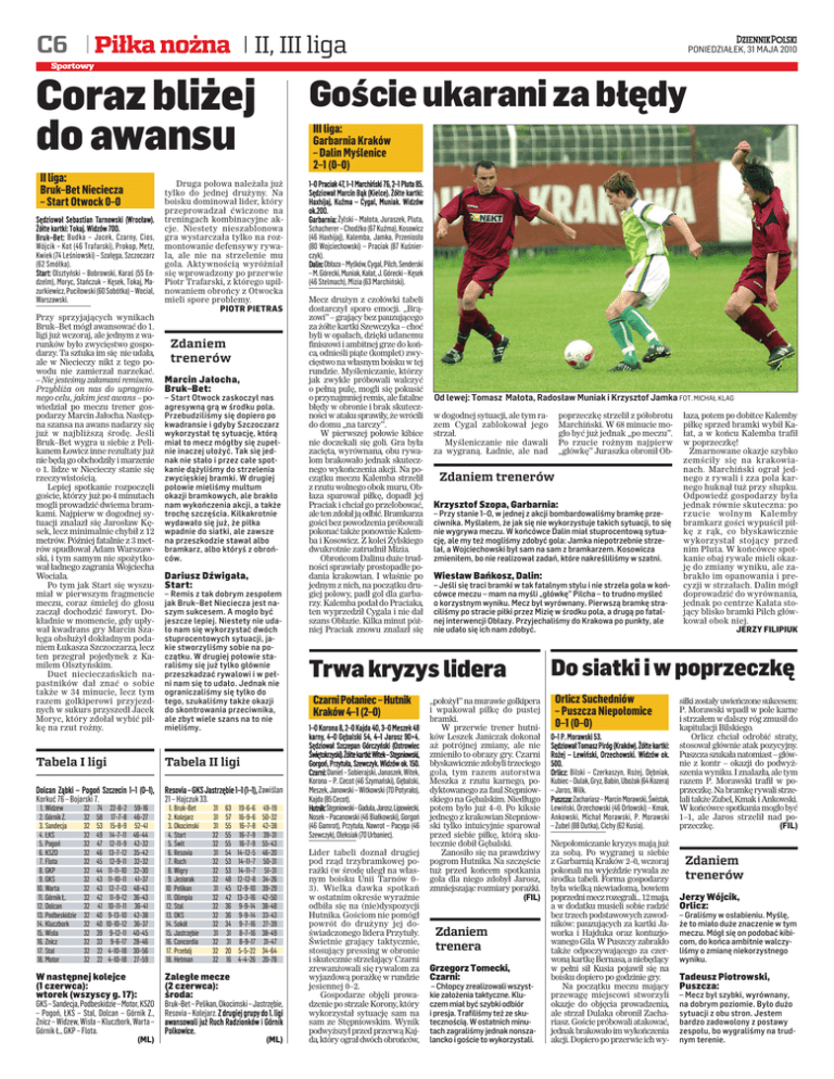 C6 Piłka nożna | II, III liga Coraz bliżej do awansu II liga: Bruk–Bet Nieciecza – Start Otwock 0–0 Żółte kartki: Tokaj. Widzów 700. Budka – Jacek, Czarny, Cios, Wójcik – Kot (46 Trafarski), Prokop, Metz, Kwiek (74 Leśniowski) – Szałęga, Szczoczarz (62 Smółka). Start: Olsztyński – Bobrowski, Karaś (55 Endzelm), Moryc, Stańczuk – Kęsek, Tokaj, Mazurkiewicz, Puciłowski (60 Sobótka) – Wocial, Warszawski. Przy sprzyjających wynikach Bruk–Bet mógł awansować do 1. ligi już wczoraj, ale jednym z warunków było zwycięstwo gospodarzy. Ta sztuka im się nie udała, ale w Niecieczy nikt z tego powodu nie zamierzał narzekać. – Nie jesteśmy załamani remisem. Przybliża on nas do upragnionego celu, jakim jest awans – powiedział po meczu trener gospodarzy Marcin Jałocha. Następna szansa na awans nadarzy się już w najbliższą środę. Jeśli Bruk–Bet wygra u siebie z Pelikanem Łowicz inne rezultaty już nie będą go obchodziły i marzenie o 1. lidze w Niecieczy stanie się rzeczywistością. Lepiej spotkanie rozpoczęli goście, którzy już po 4 minutach mogli prowadzić dwiema bramkami. Najpierw w dogodnej sytuacji znalazł się Jarosław Kęsek, lecz minimalnie chybił z 12 metrów. Później fatalnie z 3 metrów spudłował Adam Warszawski, i tym samym nie spożytkował ładnego zagrania Wojciecha Wociala. Po tym jak Start się wyszumiał w pierwszym fragmencie meczu, coraz śmielej do głosu zaczął dochodzić faworyt. Dokładnie w momencie, gdy upływał kwadrans gry Marcin Szałęga obsłużył dokładnym podaniem Łukasza Szczoczarza, lecz ten przegrał pojedynek z Kamilem Olsztyńskim. Duet niecieczańskich napastników dał znać o sobie także w 34 minucie, lecz tym razem golkiperowi przyjezdnych w sukurs przyszedł Jacek Moryc, który zdołał wybić piłkę na rzut rożny. PONIEDZIAŁEK, 31 MAJA 2010 Goście ukarani za błędy III liga: Garbarnia Kraków – Dalin Myślenice 2–1 (0–0) Druga połowa należała już tylko do jednej drużyny. Na boisku dominował lider, który przeprowadzał ćwiczone na treningach kombinacyjne akcje. Niestety nieszablonowa gra wystarczała tylko na rozmontowanie defensywy rywala, ale nie na strzelenie mu gola. Aktywnością wyróżniał się wprowadzony po przerwie Piotr Trafarski, z którego upilnowaniem obrońcy z Otwocka mieli spore problemy. PIOTR PIETRAS Zdaniem trenerów Marcin Jałocha, Bruk–Bet: – Start Otwock zaskoczył nas agresywną grą w środku pola. Przebudziliśmy się dopiero po kwadransie i gdyby Szczoczarz wykorzystał tę sytuację, którą miał to mecz mógłby się zupełnie inaczej ułożyć. Tak się jednak nie stało i przez całe spotkanie dążyliśmy do strzelenia zwycięskiej bramki. W drugiej połowie mieliśmy multum okazji bramkowych, ale brakło nam wykończenia akcji, a także trochę szczęścia. Kilkakrotnie wydawało się już, że piłka wpadnie do siatki, ale zawsze na przeszkodzie stawał albo bramkarz, albo któryś z obrońców. Dariusz Dźwigała, Start: – Remis z tak dobrym zespołem jak Bruk–Bet Nieciecza jest naszym sukcesem. A mogło być jeszcze lepiej. Niestety nie udało nam się wykorzystać dwóch stuprocentowych sytuacji, jakie stworzyliśmy sobie na początku. W drugiej połowie staraliśmy się już tylko głównie przeszkadzać rywalowi i w pełni nam się to udało. Jednak nie ograniczaliśmy się tylko do tego, szukaliśmy także okazji do skontrowania przeciwnika, ale zbyt wiele szans na to nie mieliśmy. ok.200. Garbarnia: Żylski – Małota, Juraszek, Pluta, Schacherer – Chodźko (67 Kuźma), Kosowicz (46 Haxhijaj), Kalemba, Jamka, Przeniosło (80 Wojciechowski) – Praciak (87 Kuśnierczyk). Obłaza –Myśków, Cygal, Pilch, Senderski – M. Górecki, Muniak, Kałat, J. Górecki – Kęsek (46 Stelmach), Mizia (63 Marchiński). Mecz drużyn z czołówki tabeli dostarczył sporo emocji. „Brązowi” – grający bez pauzującego za żółte kartki Szewczyka – choć byli w opałach, dzięki udanemu finiszowi i ambitnej grze do końca, odnieśli piąte (komplet) zwycięstwo na własnym boisku w tej rundzie. Myśleniczanie, którzy jak zwykle próbowali walczyć o pełną pulę, mogli się pokusić o przynajmniej remis, ale fatalne błędy w obronie i brak skuteczności w ataku sprawiły, że wrócili do domu „na tarczy”. W pierwszej połowie kibice nie doczekali się goli. Gra była zacięta, wyrównana, obu rywalom brakowało jednak skutecznego wykończenia akcji. Na początku meczu Kalemba strzelił z rzutu wolnego obok muru, Obłaza sparował piłkę, dopadł jej Praciak i chciał go przelobować, ale ten zdołał ją odbić. Bramkarza gości bez powodzenia próbowali pokonać także ponownie Kalemba i Kosowicz. Z kolei Żylskiego dwukrotnie zatrudnił Mizia. Obrońcom Dalinu duże trudności sprawiały prostopadłe podania krakowian. I właśnie po jednym z nich, na początku drugiej polowy, padł gol dla garbarzy. Kalemba podał do Praciaka, ten wyprzedził Cygala i nie dał szans Obłazie. Kilka minut później Praciak znowu znalazł się Tabela II ligi Dolcan Z Korkuć 76 – Bojarski 7. R v J 21 – Hajczuk 33. 1. Widzew 2. Górnik Z. 3. Sandecja 4. ŁKS 5. Pogoń 6. KSZO 7. Flota 8. GKP 9. GKS 10. Warta 11. Górnik Ł. 12. Dolcan 13. Podbeskidzie 14. Kluczbork 15. Wisła 16. Znicz 17. Stal 18. Motor 32 32 32 32 32 32 32 32 32 32 32 32 32 32 32 32 32 32 74 58 53 49 47 46 45 44 43 43 42 41 40 40 39 33 22 22 22–8–2 17–7–8 15–8–9 14–7–11 12–11–9 13–7–12 12–9–11 11–11–10 11–10–11 12–7–13 11–9–12 10–11–11 9–13–10 10–10–12 9–12–11 9–6–17 4–10–18 4–10–18 59–16 46–27 52–41 46–44 42–32 35–42 32–32 32–30 41–37 48–43 36–43 36–41 42–38 36–37 40–45 28–46 30–56 27–59 W następnej kolejce (1 czerwca): wtorek (wszyscy g. 17): 1. Bruk–Bet 2. Kolejarz 3. Okocimski 4. Start 5. Świt 6. Resovia 7. Ruch 8. Wigry 9. Je