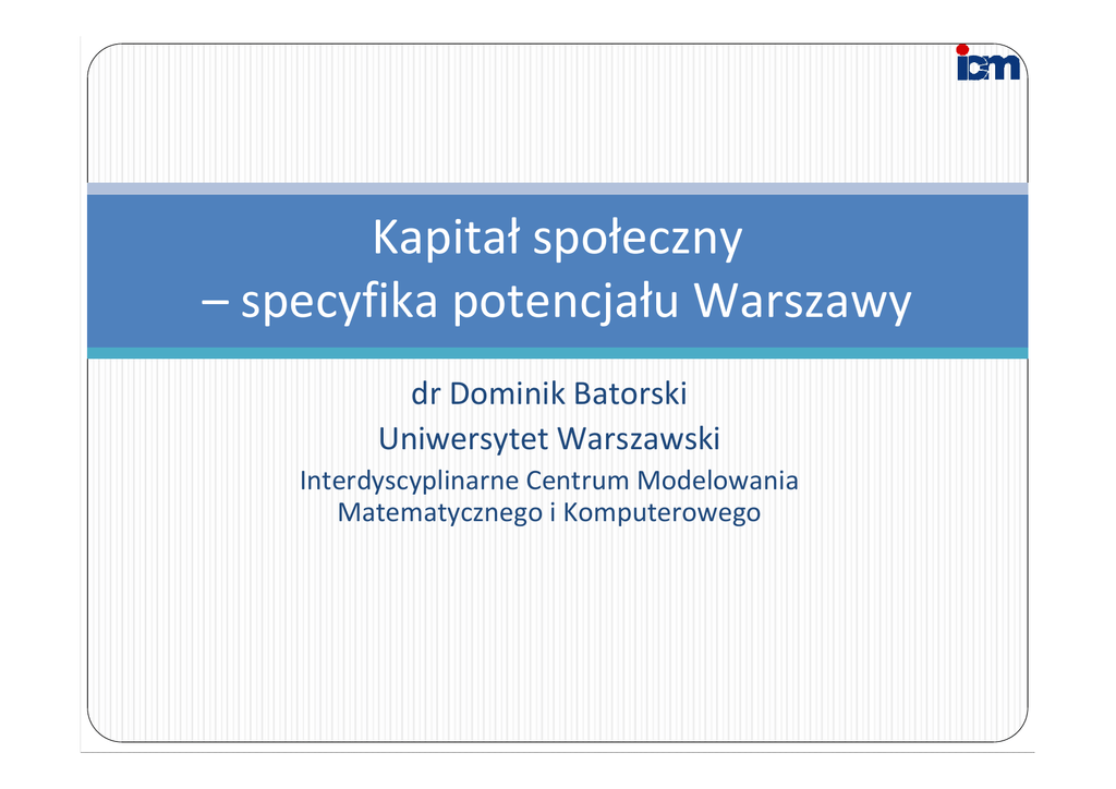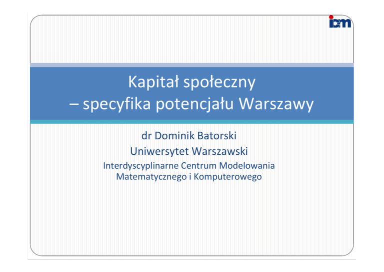 Kapitał społeczny – specyfika potencjału Warszawy dr Dominik Batorski Uniwersytet Warszawski Interdyscyplinarne Centrum Modelowania Matematycznego i Komputerowego Typy kapitału społecznego Wiążący (bonding) więzi pomiędzy członkami jednej grupy społecznej; Pomostowy (bridging) sieci pomiędzy osobami należących do różnych społeczności. Na poziomie indywidualnym lub jako własność zbiorowa Pozytywne i negatywne efekty różnych form kapitału społecznego. Definicje kapitału społecznego Kapitał społeczny to zasoby osadzone w strukturze społecznej, które mogą być osiągane lub mobilizowane poprzez celowe działanie Kapitał społeczny odnosi się do instytucji, relacji, sieci społecznych i norm, które kształtują jakość i ilość interakcji społecznych. Relacje te pozwalają aktorom mobilizować większe zasoby i osiągać wspólne cele, dobre dla społeczeństw lub określonej grupy osób. Istotne elementy pojęcia i definicji. A po trzecie użycie lub mobilizację tych zasobów przez jednostki w celowych działaniach Kapitał; Zasoby osadzone w strukturze społecznej – wiedza, umiejętności, doświadczenia, kapitał finansowy, czas; Dostępne dla jednostki – wiedza o tym kto jakie zasoby posiada (sieci społeczne); Możliwość zmobilizowania ich Znaczenie zróżnicowanej sieci kontaktów Jak pod tym względem wygląda sytuacja Warszawiaków? Korzyści związane z kapitałem społecznym Inwestycje w relacje społeczne powinny przynosić zysk. Lin (2001) przedstawia cztery wytłumaczenia w jaki sposób kapitał społeczny – zasoby funkcjonujące w sieci społecznej – poprawiają rezultaty podejmowanych działań. Po pierwsze relacje ułatwiają przepływy informacji. Warunki w których funkcjonują zarówno ludzie, jak i organizacje charakteryzują się ograniczoną dostępnością informacji. Rzadko kiedy zdarza się sytuacja, że jednostka podejmująca decyzję lub działanie ma pełną informację. Informacja jako podstawa tworzenia wiedzy wspólnej Relacje społeczne pozwalają też wywierać wpływ na inne osoby, których decyzje mają znaczenie dla jednostki. Relacje społeczne mogą też służyć jako społeczne referencje. Kontakty to często również wsparcie społeczne, wspólne interesy, przynależność do tej samej grupy i wynikające z tego wzmocnienia. Zaufanie to zdolność do podejmowania działań kooperacyjnych w sytuacji niepewności (w obliczu ryzyka). Specyfika Warszawy Zasoby Wysoki kapitał kulturowy, finansowy i fizyczny Większe zróżnicowanie kapitału kulturowego Dostępność zasobów w sieciach społecznych Warszawiaków większa mobilność społeczna (geograficzna, zawodowa); większe i bardziej rozległe sieci społeczne; ale też niebezpieczeństwo zamykania się grup społecznych. Zdolność mobilizacji zasobów Słabe zdolności do mobilizacji i przykład dysfunkcjonalności mocnych więzi Nowe osiedla – wymiana informacji i tworzenie wiedzy wspólnej Przykład banków czasu 1. Zasoby w strukturze społecznej Wysoki kapitał kulturowy, finansowy i fizyczny. Warszawa: centrum kompetencji, centrum finansowe, centrum administracyjne, itd.. Większe zróżnicowanie kapitału kulturowego 2. Dostępność zasobów w sieciach społecznych Większa mobilność społeczna mieszkańców Warszawy geograficzna, zawodowa. Napływ ludności zwiększa różnorodność zasobów, kompetencji i kapitału kulturowego posiadanych przez Warszawiaków Większe i bardziej rozległe sieci społeczne więcej kontaktów społecznych z bardziej zróżnicowanymi osobami; ale też niebezpieczeństwo zamykania się grup społecznych grodzone osiedla Zakres dominacji Warszawy (Batorski, Rakocy) Mapa przedstawia pozycję Warszawy w rankingu gmin, z których mieszkańcami komunikują się przez internet mieszkańcy poszczególnych gmin. Mieszkańcy wielu gmin otaczających Warszawę (ale także innych) komunikują się najczęściej z osobami mieszkającymi w Warszawie. Komunikacja Komunikacja z Warszawą (2004r.) Jasne gminy, to te dla których Warszawa ma mniejszą rangę niż 150 lub nie ma relacji. Komunikacja z Warszawą (2007r.) Pozycja Warszawy 3. Zdolność mobilizacji zasobów Jednak żeby mogło to być wykorzystane potrzebne są odpowiednie więzi międzyludzkie Zaufanie; skłonność do kooperacji i udzielania pomocy – zdolność mobilizowania zasobów, kultura współpracy. Słabe zdolności do mobilizacji i przykład dysfunkcjonalności mocnych więzi (Wróbel, Batorski). Nowe osiedla – wymiana informacji i tworzenie wiedzy wspólnej. Organizacje pozarządowe. Banki czasu (Czerniawska) Czas jako istotny zasób Zasoby indywidualne wymieniane z innymi osobami Instytucjonalne mechanizmy wspierania wymiany Kapitał społeczny – specyfika potencjału Warszawy dr Dominik Batorski Uniwersytet Warszawski Interdyscyplinarne Centrum Modelowania Matematycznego i Komputerowego