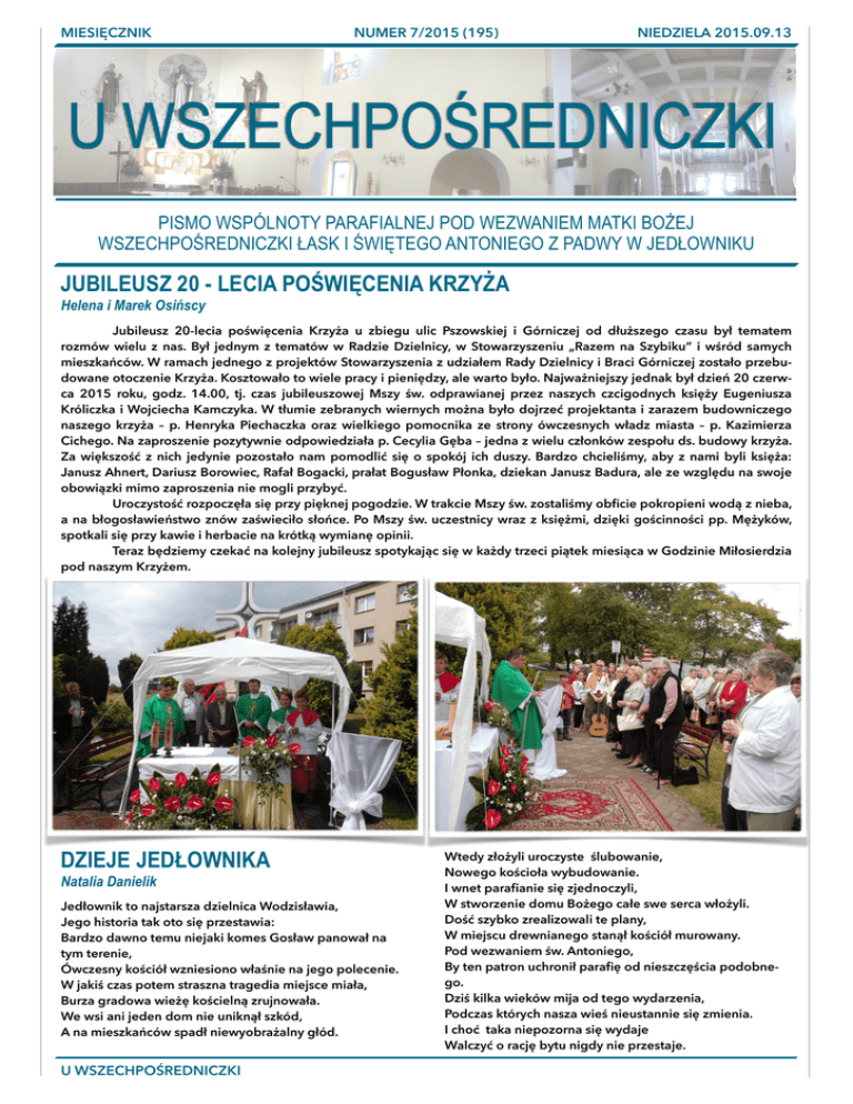MIESIĘCZNIK NUMER 7/2015 (195) NIEDZIELA 2015.09.13 U WSZECHPOŚREDNICZKI PISMO WSPÓLNOTY PARAFIALNEJ POD WEZWANIEM MATKI BOŻEJ WSZECHPOŚREDNICZKI ŁASK I ŚWIĘTEGO ANTONIEGO Z PADWY W JEDŁOWNIKU JUBILEUSZ 20 - LECIA POŚWIĘCENIA KRZYŻA Helena i Marek Osińscy Jubileusz 20-lecia poświęcenia Krzyża u zbiegu ulic Pszowskiej i Górniczej od dłuższego czasu był tematem rozmów wielu z nas. Był jednym z tematów w Radzie Dzielnicy, w Stowarzyszeniu „Razem na Szybiku” i wśród samych mieszkańców. W ramach jednego z projektów Stowarzyszenia z udziałem Rady Dzielnicy i Braci Górniczej zostało przebudowane otoczenie Krzyża. Kosztowało to wiele pracy i pieniędzy, ale warto było. Najważniejszy jednak był dzień 20 czerwca 2015 roku, godz. 14.00, tj. czas jubileuszowej Mszy św. odprawianej przez naszych czcigodnych księży Eugeniusza Króliczka i Wojciecha Kamczyka. W tłumie zebranych wiernych można było dojrzeć projektanta i zarazem budowniczego naszego krzyża – p. Henryka Piechaczka oraz wielkiego pomocnika ze strony ówczesnych władz miasta – p. Kazimierza Cichego. Na zaproszenie pozytywnie odpowiedziała p. Cecylia Gęba – jedna z wielu członków zespołu ds. budowy krzyża. Za większość z nich jedynie pozostało nam pomodlić się o spokój ich duszy. Bardzo chcieliśmy, aby z nami byli księża: Janusz Ahnert, Dariusz Borowiec, Rafał Bogacki, prałat Bogusław Płonka, dziekan Janusz Badura, ale ze względu na swoje obowiązki mimo zaproszenia nie mogli przybyć. Uroczystość rozpoczęła się przy pięknej pogodzie. W trakcie Mszy św. zostaliśmy obficie pokropieni wodą z nieba, a na błogosławieństwo znów zaświeciło słońce. Po Mszy św. uczestnicy wraz z księżmi, dzięki gościnności pp. Mężyków, spotkali się przy kawie i herbacie na krótką wymianę opinii. Teraz będziemy czekać na kolejny jubileusz spotykając się w każdy trzeci piątek miesiąca w Godzinie Miłosierdzia pod naszym Krzyżem. DZIEJE JEDŁOWNIKA Natalia Danielik Jedłownik to najstarsza dzielnica Wodzisławia, Jego historia tak oto się przestawia: Bardzo dawno temu niejaki komes Gosław panował na tym terenie, Ówczesny kościół wzniesiono właśnie na jego polecenie. W jakiś czas potem straszna tragedia miejsce miała, Burza gradowa wieżę kościelną zrujnowała. We wsi ani jeden dom nie uniknął szkód, A na mieszkańców spadł niewyobrażalny głód. U WSZECHPOŚREDNICZKI Wtedy złożyli uroczyste ślubowanie, Nowego kościoła wybudowanie. I wnet parafianie się zjednoczyli, W stworzenie domu Bożego całe swe serca włożyli. Dość szybko zrealizowali te plany, W miejscu drewnianego stanął kościół murowany. Pod wezwaniem św. Antoniego, By ten patron uchronił parafię od nieszczęścia podobnego. Dziś kilka wieków mija od tego wydarzenia, Podczas których nasza wieś nieustannie się zmienia. I choć taka niepozorna się wydaje Walczyć o rację bytu nigdy nie przestaje. MIESIĘCZNIK NUMER 7/2015 (195) NIEDZIELA 2015.09.13 MIĘDZY NAMI MINISTRANTAMI… WAKACYJNA WYPRAWA Ks. dr Wojciech Kamczyk Lipiec i sierpień to ulubione miesiące wszystkich uczniów – wszak nie ma wtedy zajęć w szkole. Dla ministrantów nie jest to jednak czas wolny od służby przy ołtarzu. Mimo wszystko części z nas udało się wziąć udział w kilkudniowym wyjeździe ministranckim do Zakopanego. Dni pomiędzy 18 a 22 lipca czternastoosobowej grupie ministrantów pozostaną na długo w pamięci. Wyprawa rozpoczęła się w sobotę wcześnie rano na dworcu kolejowym w Rybniku. Stąd wyruszyliśmy dzięki dobrodziejstwu kolei żelaznych do Zakopanego. Miejscem naszego pobytu był Dom Księży Misjonarzy Werbistów, któremu przewodził ojciec Jan Wichary. Jeszcze tego samego dnia zdołaliśmy podziwiać widok na Zakopane z Wielkiej Krokwii. Drugi dzień, niedziela, to oprócz porannej Eucharystii okazja do wędrówek po okolicy. O własnych siłach i na własnych nogach weszliśmy na Gubałówkę, skąd roztaczał się wspaniały widok na Tatry. Stamtąd przeszliśmy na Butorowy Wierch, skąd, już wyciągiem krzesełkowym, zjechaliśmy w okolice Krzeptówek. Tam mogliśmy odwiedzić piękne sanktuarium Matki Bożej Fatimskiej, swoją historią nawiązujące do zamachu na życie Jana Pawła II. Kolejnego dnia, który początkowo zapowiadał się deszczowo, spacerowaliśmy po Dolinie Kościeliskiej na terenie Tatrzańskiego Parku Narodowego. Szczególną atrakcją dla niektórych było wejście do Jaskini Mroźnej. Innym wielką radość sprawiła możliwość delektowania się świeżymi oscypkami. Przedostatni dzień wizyty w Zakopanym spędziliśmy odwiedzając Pustelnię św. Brata Alberta Chmielowskiego. W tamtejszej kaplicy uczestniczyliśmy we Mszy Świętej. Mogliśmy również zrelaksować się w zakopiańskim Aqua-parku. 2 W trakcie wyjazdu nie zabrakło okazji do pogrania w piłkę nożną bądź w „uno”, a także możliwości spacerowania po Krupówkach. Szczególne podziękowania należą się wszystkim rodzicom, którzy przygotowali nas do wyjazdu (za transport i „telefoniczne” wsparcie) oraz panu Jackowi Filasowi za opiekę nad grupą. Pozostaje jedynie nie rozwiązana kwestia i pytanie: dokąd wyruszymy w przyszłym roku? WSZYSTKICH CHŁOPCÓW, KTÓRZY CHCIELIBY ROZPOCZĄĆ SŁUŻBĘ PRZY OŁTARZU I ZOSTAĆ MINISTRANTAMI ZAPRASZAMY NA ZBIÓRKI MINISTRANCKIE W SOBOTY O GODZINIE 9.00 W DOMU PARAFIALNYM U WSZECHPOŚREDNICZKI MIESIĘCZNIK NUMER 7/2015 (195) W SERCU PROBOSZCZA Kochani Parafianie! Zakończyły się wakacje, rozpoczął się nowy rok szkolny. Wypoczęci, z nowym zapałem podejmujemy stare i nowe obowiązki i zadania. Wszystkim uczniom życzę, by byli w nowym roku szkolnym, tak jak mówiłem w kazaniu 1 września br., DOBRYMI UCZNIAMI. Nauczycielom, wychowawcom i katechetom życzę zapału i wytrwałości w nauczaniu i wychowywaniu. Rodzicom życzę umiejętnego wspierania wysiłków swoich pociech. W czasie wakacji, ch
