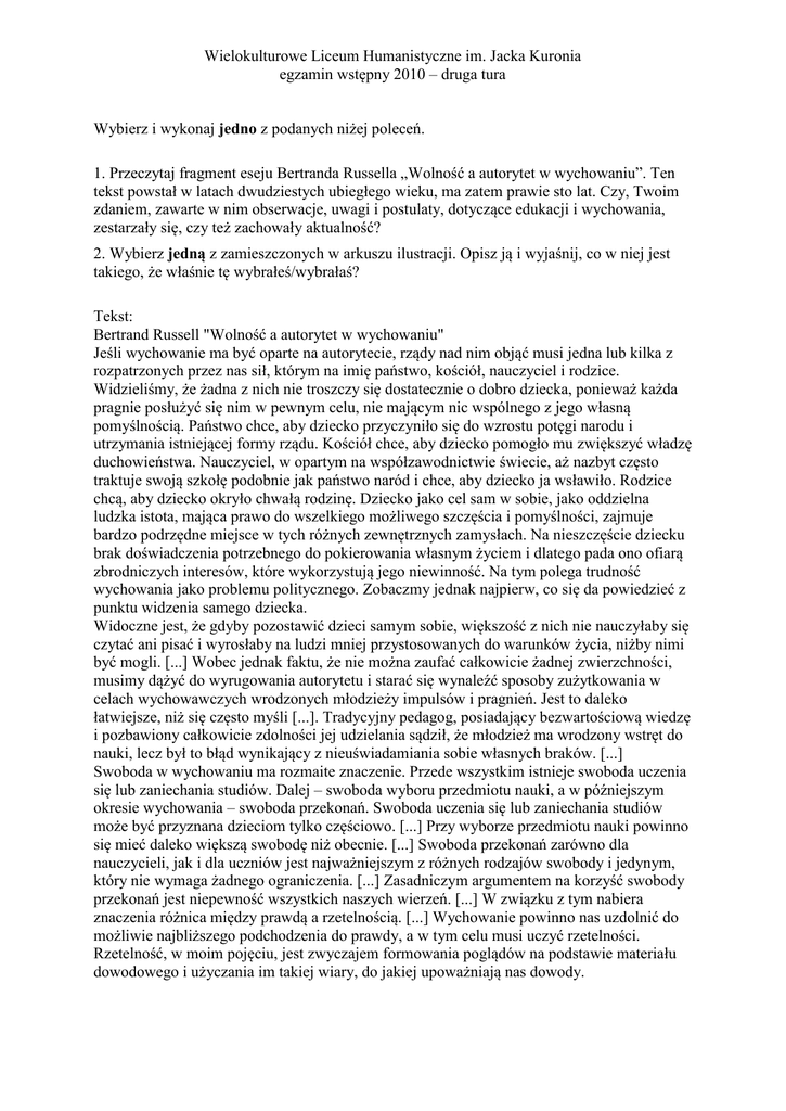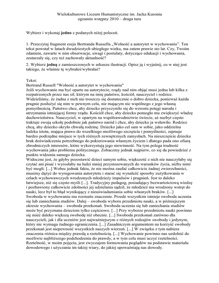Wielokulturowe Liceum Humanistyczne im. Jacka Kuronia egzamin wstępny 2010 – druga tura Wybierz i wykonaj jedno z podanych niżej poleceń. 1. Przeczytaj fragment eseju Bertranda Russella „Wolność a autorytet w wychowaniu”. Ten tekst powstał w latach dwudziestych ubiegłego wieku, ma zatem prawie sto lat. Czy, Twoim zdaniem, zawarte w nim obserwacje, uwagi i postulaty, dotyczące edukacji i wychowania, zestarzały się, czy też zachowały aktualność? 2. Wybierz jedną z zamieszczonych w arkuszu ilustracji. Opisz ją i wyjaśnij, co w niej jest takiego, że właśnie tę wybrałeś/wybrałaś? Tekst: Bertrand Russell "Wolność a autorytet w wychowaniu" Jeśli wychowanie ma być oparte na autorytecie, rządy nad nim objąć musi jedna lub kilka z rozpatrzonych przez nas sił, którym na imię państwo, kościół, nauczyciel i rodzice. Widzieliśmy, że żadna z nich nie troszczy się dostatecznie o dobro dziecka, ponieważ każda pragnie posłużyć się nim w pewnym celu, nie mającym nic wspólnego z jego własną pomyślnością. Państwo chce, aby dziecko przyczyniło się do wzrostu potęgi narodu i utrzymania istniejącej formy rządu. Kościół chce, aby dziecko pomogło mu zwiększyć władzę duchowieństwa. Nauczyciel, w opartym na współzawodnictwie świecie, aż nazbyt często traktuje swoją szkołę podobnie jak państwo naród i chce, aby dziecko ja wsławiło. Rodzice chcą, aby dziecko okryło chwałą rodzinę. Dziecko jako cel sam w sobie, jako oddzielna ludzka istota, mająca prawo do wszelkiego możliwego szczęścia i pomyślności, zajmuje bardzo podrzędne miejsce w tych różnych zewnętrznych zamysłach. Na nieszczęście dziecku brak doświadczenia potrzebnego do pokierowania własnym życiem i dlatego pada ono ofiarą zbrodniczych interesów, które wykorzystują jego niewinność. Na tym polega trudność wychowania jako problemu politycznego. Zobaczmy jednak najpierw, co się da powiedzieć z punktu widzenia samego dziecka. Widoczne jest, że gdyby pozostawić dzieci samym sobie, większość z nich nie nauczyłaby się czytać ani pisać i wyrosłaby na ludzi mniej przystosowanych do warunków życia, niżby nimi być mogli. [...] Wobec jednak faktu, że nie można zaufać całkowicie żadnej zwierzchności, musimy dążyć do wyrugowania autorytetu i starać się wynaleźć sposoby zużytkowania w celach wychowawczych wrodzonych młodzieży impulsów i pragnień. Jest to daleko łatwiejsze, niż się często myśli [...]. Tradycyjny pedagog, posiadający bezwartościową wiedzę i pozbawiony całkowicie zdolności jej udzielania sądził, że młodzież ma wrodzony wstręt do nauki, lecz był to błąd wynikający z nieuświadamiania sobie własnych braków. [...] Swoboda w wychowaniu ma rozmaite znaczenie. Przede wszystkim istnieje swoboda uczenia się lub zaniechania studiów. Dalej – swoboda wyboru przedmiotu nauki, a w późniejszym okresie wychowania – swoboda przekonań. Swoboda uczenia się lub zaniechania studiów może być przyznana dzieciom tylko częściowo. [...] Przy wyborze przedmiotu nauki powinno się mieć daleko większą swobodę niż obecnie. [...] Swoboda przekonań zarówno dla nauczycieli, jak i dla uczniów jest najważniejszym z różnych rodzajów swobody i jedynym, który nie wymaga żadnego ograniczenia. [...] Zasadniczym argumentem na korzyść swobody przekonań jest niepewność wszystkich naszych wierzeń. [...] W związku z tym nabiera znaczenia różnica między prawdą a rzetelnością. [...] Wychowanie powinno nas uzdolnić do możliwie najbliższego podchodzenia do prawdy, a w tym celu musi uczyć rzetelności. Rzetelność, w moim pojęciu, jest zwyczajem formowania poglądów na podstawie materiału dowodowego i użyczania im takiej wiary, do jakiej upoważniają nas dowody. Wielokulturowe Liceum Humanistyczne im. Jacka Kuronia egzamin wstępny 2010 – druga tura il. 2 il. 1 il. 3