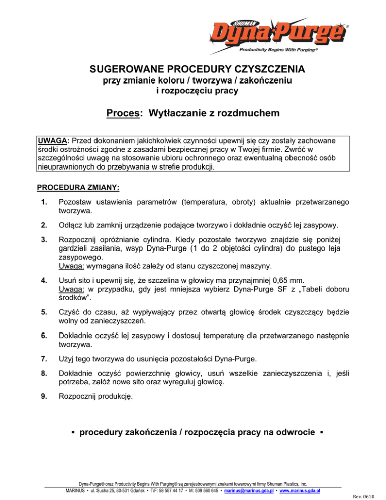 SUGEROWANE PROCEDURY CZYSZCZENIA przy zmianie koloru / tworzywa / zakończeniu i rozpoczęciu pracy Proces: Wytłaczanie z rozdmuchem UWAGA: Przed dokonaniem jakichkolwiek czynności upewnij się czy zostały zachowane środki ostrożności zgodne z zasadami bezpiecznej pracy w Twojej firmie. Zwróć w szczególności uwagę na stosowanie ubioru ochronnego oraz ewentualną obecność osób nieuprawnionych do przebywania w strefie produkcji. PROCEDURA ZMIANY: 1. Pozostaw ustawienia parametrów (temperatura, obroty) aktualnie przetwarzanego tworzywa. 2. Odłącz lub zamknij urządzenie podające tworzywo i dokładnie oczyść lej zasypowy. 3. Rozpocznij opróżnianie cylindra. Kiedy pozostałe tworzywo znajdzie się poniżej gardzieli zasilania, wsyp Dyna-Purge (1 do 2 objętości cylindra) do pustego leja zasypowego. Uwaga: wymagana ilość zależy od stanu czyszczonej maszyny. 4. Usuń sito i upewnij się, że szczelina w głowicy ma przynajmniej 0,65 mm. Uwaga: w przypadku, gdy jest mniejsza wybierz Dyna-Purge SF z „Tabeli doboru środków”. 5. Czyść do czasu, aż wypływający przez otwartą głowicę środek czyszczący będzie wolny od zanieczyszczeń. 6. Dokładnie oczyść lej zasypowy i dostosuj temperaturę dla przetwarzanego następnie tworzywa. 7. Użyj tego tworzywa do usunięcia pozostałości Dyna-Purge. 8. Dokładnie oczyść powierzchnię głowicy, usuń wszelkie zanieczyszczenia i, jeśli potrzeba, załóż nowe sito oraz wyreguluj głowicę. 9. Rozpocznij produkcję. ▪ procedury zakończenia / rozpoczęcia pracy na odwrocie ▪ Dyna-Purge® oraz Productivity Begins With Purging® są zarejestrowanymi znakami towarowymi firmy Shuman Plastics, Inc. MARINUS • ul. Sucha 25, 80-531 Gdańsk • T/F: 58 557 44 17 • M: 509 560 645 • [email protected] • www.marinus.gda.pl Rev. 0610 Proces: Wytłaczanie z rozdmuchem ZAKOŃCZENIE PRACY: 1. Pozostaw ustawienia parametrów (temperatura, obroty) aktualnie przetwarzanego tworzywa. 2. Odłącz lub zamknij urządzenie podające tworzywo i dokładnie oczyść lej zasypowy. 3. Rozpocznij opróżnianie cylindra. Kiedy pozostałe tworzywo znajdzie się poniżej gardzieli zasilania, wsyp Dyna-Purge (1 do 2 objętości cylindra) do pustego leja zasypowego. Uwaga: wymagana ilość zależy od stanu czyszczonej maszyny. 4. Usuń sito i upewnij się, że szczelina w głowicy ma przynajmniej 0,65 mm. Uwaga: w przypadku, gdy jest mniejsza wybierz Dyna-Purge SF z „Tabeli doboru środków”. 5. Rozpocznij czyszczenie i kontynuuj do momentu, aż wypływający z maszyny środek będzie wolny od zanieczyszczeń. 6. Upewnij się, że cylinder jest wypełniony Dyna-Purge. Zatrzymaj obroty ślimaka oraz obniż temperaturę lub wyłącz strefy grzania maszyny. Ostrzeżenie: nie uruchamiaj ślimaka przy zastygniętym środku czyszczącym! ROZPOCZĘCIE PRACY: 1. Zwiększ temperaturę o 10°C powyżej minimalnej temperatury przetwarzania DynaPurge. Uwaga: sprawdź w instrukcji obsługi maszyny zalecenia producenta dot. rozruchu. 2. Kiedy żądana temperatura Dyna-Purge zostanie osiągnięta, rozpocznij powolne obracanie ślimaka. Ponieważ środek może być wciąż zastygnięty, nie ustawiaj obrotów ślimaka na maksimum. 3. Jeżeli wypływający z maszyny środek będzie wciąż zanieczyszczony, wsyp więcej Dyna-Purge i poczekaj, aż będzie on wolny od zanieczyszczeń. 4. Dokładnie oczyść lej zasypowy i dostosuj temperaturę dla przetwarzanego następnie tworzywa. 5. Użyj tego tworzywa do usunięcia pozostałości Dyna-Purge 6. Dokładnie oczyść powierzchnię głowicy, usuń wszelkie zanieczyszczenia i, jeśli potrzeba, załóż nowe sito oraz wyreguluj głowicę. 7. Rozpocznij produkcję. Uwaga: Powyższe informacje oparte są na danych, które uważamy za wiarygodne, jednakże firma Shuman Plastics, Inc. nie jest w stanie zagwarantować w żaden sposób efektów dla poszczególnych zastosowań. Z uwagi na to, iż firma Shuman Plastics nie ma możliwości nadzoru nad każdym użyciem swojego produktu, efekty osiągane przez poszczególnych klientów mogą się różnić. Każdy użytkownik produktu powinien przeprowadzić przed jego zakupem testy na swoich maszynach w celu określenia przydatności dla swoich zastosowań. Żadna z informacji zawartych w tym dokumencie nie ma na celu naruszenia jakiegokolwiek obowiązującego patentu, zarówno krajowego jak i międzynarodowego, ani jakichkolwiek praw, które mogłyby mieć zastosowanie w tym przypadku. Dyna-Purge® oraz Productivity Begins With Purging® są zarejestrowanymi znakami towarowymi firmy Shuman Plastics, Inc. MARINUS • ul. Sucha 25, 80-531 Gdańsk • T/F: 58 557 44 17 • M: 509 560 645 • [email protected] • www.marinus.gda.pl Rev. 0610