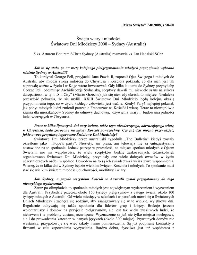 „Msza Święta” 7-8/2008, s 58-60 Święto wiary i młodości Światowe Dni Młodzieży 2008 – Sydney (Australia) Z ks. Arturem Boturem SChr z Sydney (Australia) rozmawia ks. Jan Hadalski SChr. Jak to się stało, że na metę kolejnego pielgrzymowania młodych przez ziemię wybrano właśnie Sydney w Australii? To kardynał George Pell, przyjaciel Jana Pawła II, zaprosił Ojca Świętego i młodych do Australii, aby młodzi swoją miłością do Chrystusa i Kościoła pokazali, co dla nich jest tak naprawdę ważne w życiu i w Kogo warto inwestować. Gdy kilka lat temu do Sydney przybył abp George Pell, obejmując Archidiecezję Sydnejską, sceptycy dawali mu niewiele szans na sukces duszpasterski w tym „Sin City” (Miasto Grzechu), jak się niekiedy określa to miejsce. Niedaleka przeszłość pokazała, że się mylili. XXIII Światowe Dni Młodzieży będą kolejną okazją przypomnienia tego, co w życiu każdego człowieka jest ważne. Kiedyś Paryż najlepiej pokazał, jak pobyt młodych ludzi zmienił patrzenie Francuzów na Kościół i wiarę. Teraz to niewątpliwie szansa dla mieszkańców Sydney do odnowy duchowej, ożywienia wiary i budowania jedności ludzi wierzących w Chrystusa. Przez te kilka lipcowych dni oczy świata, także tego niewierzącego, odrzucającego wiarę w Chrystusa, będą zwrócone na młody Kościół powszechny. Czy już dziś można przewidzieć, jakie owoce przyniosą tegoroczne Światowe Dni Młodzieży? Światowe Dni Młodzieży przez australijski tygodnik „The Bulletin” kiedyś zostały określone jako „Pope’s party”. Niestety, ani prasa, ani telewizja nie są entuzjastycznie nastawione na to spotkanie. Jednak patrząc w przeszłość, na miejsca spotkań młodych z Ojcem Świętym, nie ma wątpliwości, że wielu sceptyków będzie zaskoczonych. Gdziekolwiek organizowano Światowe Dni Młodzieży, przyniosły one wiele dobrych owoców w życiu uczestniczących osób i wspólnot. Dowodem na to są ich świadectwa i wciąż żywe wspomnienia. Wierzę, że te kilka dni w Sydney będzie wielkim świętem Kościoła i młodych. To spotkanie musi stać się wielkim świętem młodości, duchowości, modlitwy i wiary. Jak Sydney, a przede wszystkim Kościół w Australii został przygotowany do tego niezwykłego wydarzenia? Zaraz po olimpiadzie to spotkanie młodych jest największym wydarzeniem i wyzwaniem dla Australii. Przybędzie przecież około 150 tysięcy pielgrzymów z całego świata, około 100 tysięcy młodych z Australii. Od wielu miesięcy w szkołach i w parafiach mówi się o Światowych Dniach Młodzieży i zachęca się rodziny, aby zaangażowały się w te wielkie, wyjątkowe dni. Regularnie odbywają się także spotkania dla liderów grup i księży. Brakuje jeszcze wolontariuszy i domów na przyjęcie pielgrzymów, ale jest tak wielu życzliwych ludzi, że niebawem i te problemy zostaną rozwiązane. Wyznaczone są już nie tylko miejsca noclegowe, ale i do prowadzenia katechez w danych językach (około 300 miejsc). Prywatnych domów nie wystarczy, przygotowuje się więc szkoły i inne pomieszczenia. Są już podpisane kontrakty z firmami w celu zapewnienia wyżywienia. Bardzo dobra, życzliwa jest też współpraca z australijskim rządem. Jakie są najważniejsze punkty programu tegorocznych Światowych Dni Młodzieży? Czy jak w wielu poprzednich młodzież spotka się z Ojcem Świętym? Pierwsze dni po przyjeździe do Australii młodzi spędzą w diecezjach, i to nie tylko sydneyskiej. Wielu biskupów z całej Australii zaprosiło młodych pielgrzymów na swój teren. Oficjalne rozpoczęcie, otwarcie Światowych Dni Młodzieży będzie miało miejsce we wtorek, 15 lipca, podczas Mszy Świętej, której będzie przewodniczył kard. George Pell. Ta Msza Święta będzie sprawowana na Burangaroo. Od środy do piątku w godzinach porannych odbędą się katechezy dla młodych w ich ojczystym języku. Codziennie będzie celebrowana Najświętsza Ofiara. Jednym z elementów Światowych Dni Młodzieży są Festiwale Młodych. Będą one miały w miejsce w godzinach popołudniowych. Chodzi o spektakle taneczne, teatralne, koncerty muzyczne, ewangelizacyjne, wystawy, projekty spotkań modlitewnych, dyskusyjnych, projekcje filmów itp. W czwartek, 17 lipca, przybędzie (przypłynie) Ojciec Święty, a w piątek wieczorem ulicami Sydney przejdzie Droga Krzyżowa. W sobotę, 19 lipca, wszyscy udadzą się w pielgrzymce na Randwick na całonocne czuwanie i adorację. Następnego dnia, w niedzielę, 20 lipca, o godzinie 10.00 rano zostanie odprawiona Msza Święta z udziałem Ojca Świętego i nastąpi oficjalne zakończenie tegorocznych Światowych Dni Młodzieży. To będzie wielkie święto Kościoła katolickiego w Australii. Jak inni wierni, zwłaszcza dorośli, będą mogli włączyć się w Światowe Dni Młodzieży? Dla osób powyżej 35 roku życia są również możliwości włączenia się w to wielkie wydarzenie. Na powitanie Ojca Świętego i Drogę Krzyżową ulicami Sydney nie będą potrzebne żadne identyfikatory. Każdy może włączyć się tę uroczystości. Także każdy, kto przyjął co najmniej dwóch pielgrzymów do swojego domu, będzie mógł uczestniczyć w głównej Mszy Świętej na Randwicku. Inne osoby będą mogły oglądać Mszę Świętą z Papieżem na dużych ekranach w Centennial Park. Czy w to światowe świętowanie młodych katolików włączą się australijskie media, zazwyczaj niezbyt przychylne i zainteresowane Kościołem katolickim? Na pewno będzie transmisja w TV i z tego, co wiem, emitowana przez stację SBS. Wiele informacji i wiadomości będzie przekazywane na bieżąco. Jeśli chodzi o prasę, to bardzo angażuje się między innymi „Catholic Weekly”, a także niektóre stacje radiowe. Są specjalne strony internetowe informujące na bieżąco, co się dzieje i na jakim etapie są przygotowania do spotkania młodych. Zachęcam, aby zajrzeć na stronę obsług