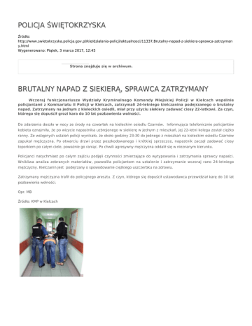 POLICJA ŚWIĘTOKRZYSKA Źródło: http://www.swietokrzyska.policja.gov.pl/kie/dzialania-policji/aktualnosci/11337,Brutalny-napad-z-siekiera-sprawca-zatrzyman y.html Wygenerowano: Piątek, 3 marca 2017, 12:45 Strona znajduje się w archiwum. BRUTALNY NAPAD Z SIEKIERĄ, SPRAWCA ZATRZYMANY Wczoraj funkcjonariusze Wydziały Kryminalnego Komendy Miejskiej Policji w Kielcach wspólnie policjantami z Komisariatu II Policji w Kielcach, zatrzymali 24-letniego kielczanina podejrzanego o brutalny napad. Zatrzymany na jednym z kieleckich osiedli, miał przy użyciu siekiery zadawać ciosy 22-latkowi. Za czyn, którego się dopuścił grozi kara do 10 lat pozbawienia wolności. Do zdarzenia doszło w nocy ze środy na czwartek na kieleckim osiedlu Czarnów. Informująca telefonicznie policjantów kobieta oznajmiła, że po wizycie napastnika uzbrojonego w siekierę w jednym z mieszkań, jej 22-letni kolega został ciężko ranny. Ze wstępnych ustaleń policji wynikało, że około godziny 23:30 do jednego z mieszkań na kieleckim osiedlu Czarnów zapukał mężczyzna. Po otwarciu drzwi przez poszkodowanego i krótkiej sprzeczce, napastnik zaczął zadawać ciosy toporkiem po całym ciele, poważnie go raniąc. Po chwili agresywny mężczyzna oddalił się w nieznanym kierunku. Policjanci natychmiast po całym zajściu podjęli czynności zmierzające do wytypowania i zatrzymania sprawcy napaści. Wnikliwa analiza zebranych materiałów, pozwoliła policjantom na ustalenie i zatrzymanie wczoraj rano 24-letniego mężczyzny. Kielczanin jest podejrzany o spowodowanie ciężkiego uszczerbku na zdrowiu. Zatrzymany mężczyzna trafił do policyjnego aresztu. Z czyn, którego się dopuścił ustawodawca przewidział karę do 10 lat pozbawienia wolności. Opr. MB Źródło: KMP w Kielcach Ocena: 3/5 (2) Tweetnij