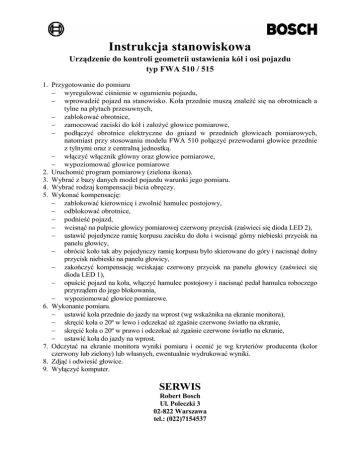 Instrukcja stanowiskowa Urządzenie do kontroli geometrii ustawienia kół i osi pojazdu typ FWA 510 / 515 1. Przygotowanie do pomiaru − wyregulować ciśnienie w ogumieniu pojazdu, − wprowadzić pojazd na stanowisko. Koła przednie muszą znaleźć się na obrotnicach a tylne na płytach przesuwnych, − zablokować obrotnice, − zamocować zaciski do kół i załoŜyć głowice pomiarowe, − podłączyć obrotnice elektryczne do gniazd w przednich głowicach pomiarowych, natomiast przy stosowaniu modelu FWA 510 połączyć przewodami głowice przednie z tylnymi oraz z centralną jednostką. − włączyć włącznik główny oraz głowice pomiarowe, − wypoziomować głowice pomiarowe 2. Uruchomić program pomiarowy (zielona ikona). 3. Wybrać z bazy danych model pojazdu warunki jego pomiaru. 4. Wybrać rodzaj kompensacji bicia obręczy. 5. Wykonać kompensację: − zablokować kierownicę i zwolnić hamulec postojowy, − odblokować obrotnice, − podnieść pojazd, − wcisnąć na pulpicie głowicy pomiarowej czerwony przycisk (zaświeci się dioda LED 2), − ustawić pojedyncze ramię korpusu zacisku do dołu i wcisnąć górny niebieski przycisk na panelu głowicy, − obrócić koło tak aby pojedynczy ramię korpusu było skierowane do góry i nacisnąć dolny przycisk niebieski na panelu głowicy, − zakończyć kompensację wciskając czerwony przycisk na panelu głowicy (zaświeci się dioda LED 1), − opuścić pojazd na koła, włączyć hamulec postojowy i nacisnąć pedał hamulca roboczego przyrządem do jego blokowania, − wypoziomować głowice pomiarowe. 6. Wykonanie pomiaru. − ustawić koła przednie do jazdy na wprost (wg wskaźnika na ekranie monitora), − skręcić koła o 20º w lewo i odczekać aŜ zgaśnie czerwone światło na ekranie, − skręcić koła o 20º w prawo i odczekać aŜ zgaśnie czerwone światło na ekranie, − ustawić koła do jazdy na wprost. 7. Odczytać na ekranie monitora wyniki pomiaru i ocenić je wg kryteriów producenta (kolor czerwony lub zielony) lub własnych, ewentualnie wydrukować wyniki. 8. Zdjąć i odwiesić głowice. 9. Wyłączyć komputer. SERWIS Robert Bosch Ul. Poleczki 3 02-822 Warszawa tel.: (022)7154537