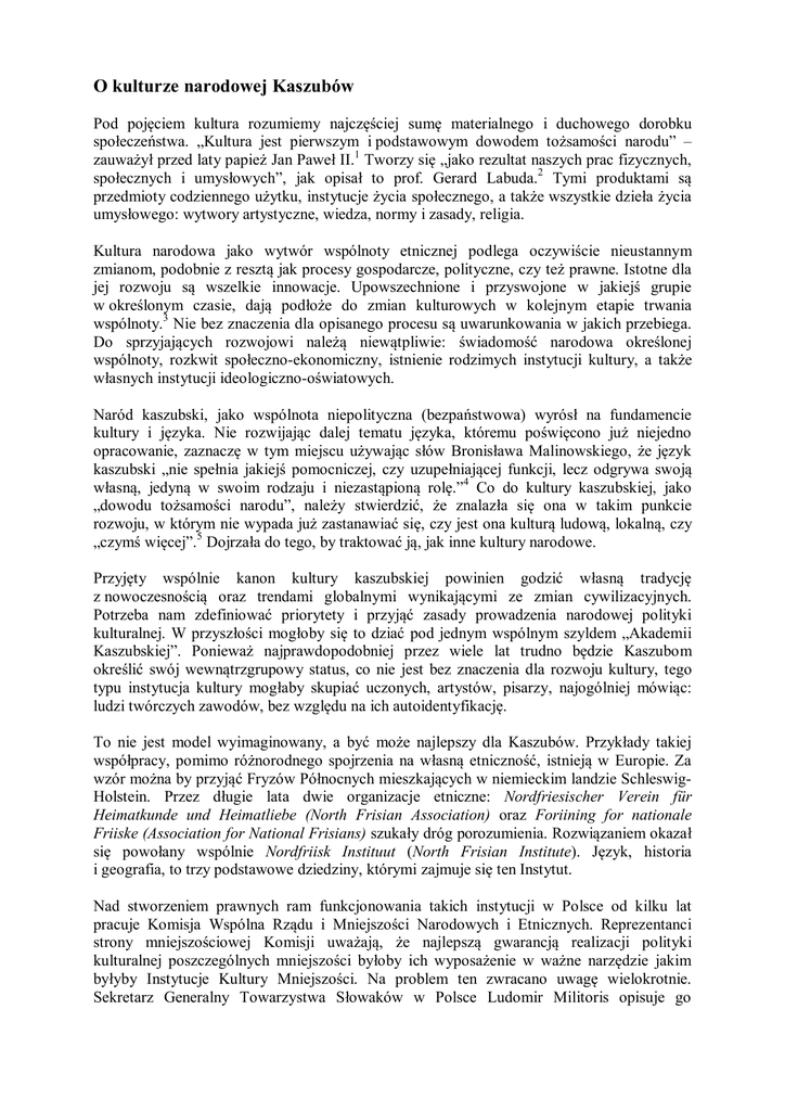 O kulturze narodowej Kaszubów Pod pojęciem kultura rozumiemy najczęściej sumę materialnego i duchowego dorobku społeczeństwa. „Kultura jest pierwszym i podstawowym dowodem tożsamości narodu” – zauważył przed laty papież Jan Paweł II.1 Tworzy się „jako rezultat naszych prac fizycznych, społecznych i umysłowych”, jak opisał to prof. Gerard Labuda.2 Tymi produktami są przedmioty codziennego użytku, instytucje życia społecznego, a także wszystkie dzieła życia umysłowego: wytwory artystyczne, wiedza, normy i zasady, religia. Kultura narodowa jako wytwór wspólnoty etnicznej podlega oczywiście nieustannym zmianom, podobnie z resztą jak procesy gospodarcze, polityczne, czy też prawne. Istotne dla jej rozwoju są wszelkie innowacje. Upowszechnione i przyswojone w jakiejś grupie w określonym czasie, dają podłoże do zmian kulturowych w kolejnym etapie trwania wspólnoty.3 Nie bez znaczenia dla opisanego procesu są uwarunkowania w jakich przebiega. Do sprzyjających rozwojowi należą niewątpliwie: świadomość narodowa określonej wspólnoty, rozkwit społeczno-ekonomiczny, istnienie rodzimych instytucji kultury, a także własnych instytucji ideologiczno-oświatowych. Naród kaszubski, jako wspólnota niepolityczna (bezpaństwowa) wyrósł na fundamencie kultury i języka. Nie rozwijając dalej tematu języka, któremu poświęcono już niejedno opracowanie, zaznaczę w tym miejscu używając słów Bronisława Malinowskiego, że język kaszubski „nie spełnia jakiejś pomocniczej, czy uzupełniającej funkcji, lecz odgrywa swoją własną, jedyną w swoim rodzaju i niezastąpioną rolę.”4 Co do kultury kaszubskiej, jako „dowodu tożsamości narodu”, należy stwierdzić, że znalazła się ona w takim punkcie rozwoju, w którym nie wypada już zastanawiać się, czy jest ona kulturą ludową, lokalną, czy „czymś więcej”.5 Dojrzała do tego, by traktować ją, jak inne kultury narodowe. Przyjęty wspólnie kanon kultury kaszubskiej powinien godzić własną tradycję z nowoczesnością oraz trendami globalnymi wynikającymi ze zmian cywilizacyjnych. Potrzeba nam zdefiniować priorytety i przyjąć zasady prowadzenia narodowej polityki kulturalnej. W przyszłości mogłoby się to dziać pod jednym wspólnym szyldem „Akademii Kaszubskiej”. Ponieważ najprawdopodobniej przez wiele lat trudno będzie Kaszubom określić swój wewnątrzgrupowy status, co nie jest bez znaczenia dla rozwoju kultury, tego typu instytucja kultury mogłaby skupiać uczonych, artystów, pisarzy, najogólniej mówiąc: ludzi twórczych zawodów, bez względu na ich autoidentyfikację. To nie jest model wyimaginowany, a być może najlepszy dla Kaszubów. Przykłady takiej współpracy, pomimo różnorodnego spojrzenia na własną etniczność, istnieją w Europie. Za wzór można by przyjąć Fryzów Północnych mieszkających w niemieckim landzie SchleswigHolstein. Przez długie lata dwie organizacje etniczne: Nordfriesischer Verein für Heimatkunde und Heimatliebe (North Frisian Association) oraz Foriining for nationale Friiske (Association for National Frisians) szukały dróg porozumienia. Rozwiązaniem okazał się powołany wspólnie Nordfriisk Instituut (North Frisian Institute). Język, historia i geografia, to trzy podstawowe dziedziny, którymi zajmuje się ten Instytut. Nad stworzeniem prawnych ram funkcjonowania takich instytucji w Polsce od kilku lat pracuje Komisja Wspólna Rządu i Mniejszości Narodowych i Etnicznych. Reprezentanci strony mniejszościowej Komisji uważają, że najlepszą gwarancją realizacji polityki kulturalnej poszczególnych mniejszości byłoby ich wyposażenie w ważne narzędzie jakim byłyby Instytucje Kultury Mniejszości. Na problem ten zwracano uwagę wielokrotnie. Sekretarz Generalny Towarzystwa Słowaków w Polsce Ludomir Militoris opisuje go w sposób następujący: „Obecne zapisy ustawy zawarte w Art. 18, ustęp 4 ustawy z dnia 6 stycznia 2005 r. o mniejszościach narodowych i etnicznych oraz o języku regionalnym pozostawiają w tym zakresie jednostkom samorządu terytorialnego zupełną swobodę, gdyż jednostki te „mogą” przekazywać środki na realizację zadań wynikających z cytowanej ustawy, a nie „są” do tych działań zobowiązane. W praktyce sytuacja jest taka, iż jednostki samorządu terytorialnego realizujące zadania w sferze kultury przekazują środki wyłącznie na rzecz polskich instytucji kultury, a odmawiają przekazywania tych środków na rzecz stowarzyszeń i instytucji mniejszości narodowych i etnicznych.”6 Wierzę, że wcześniej, czy później różnego rodzaju bariery zostaną przełamane i zaświeci zielone światło dla powołania takiej instytucji kultury także na Kaszubach. W ruchu kaszubskim są osoby, które obawiają się niestety współpracy z nurtem narodowym w zakresie rozwoju języka, kultury, historii i geografii Kaszub uważając, że „klucz do kaszubskich serc” jest w ich posiadaniu i tylko one wiedzą najlepiej, co i jak chronić, czy rozwijać. Gdy na przykład przed kilkoma laty zaproponowałem zwołanie III Kongresu Kaszubskiego, po którym spodziewałem się wypracowania czegoś w rodzaju „Karty Kaszubów”, rozumianej jako deklaracja praw, przywilejów i obowiązków oraz wspólny program działania członków naszej społeczności, a także jednolitego kanonu symboli, prawd historycznych, języka, kultury, niektóre środowiska zareagowały wręcz histerycznie. Takich postaw musimy się wyzbyć. Już ponad 20 lat żyjemy w demokratycznej Polsce. Jako Kaszubi dobrze wykorzystaliśmy ten czas. Osiągnęliśmy cele zamierzone przez przeszłe pokolenia. Chronimy i rozwijamy język kaszubski: uczymy go w szkole, modlimy się w nim w Kościele, komunikujemy się za jego pośrednictwem w mediach i uzyskaliśmy dla niego status języka regionalnego – drugiego oficjalnego języka w Polsce. Nadszedł czas, by więcej energii poświęcić naszej k