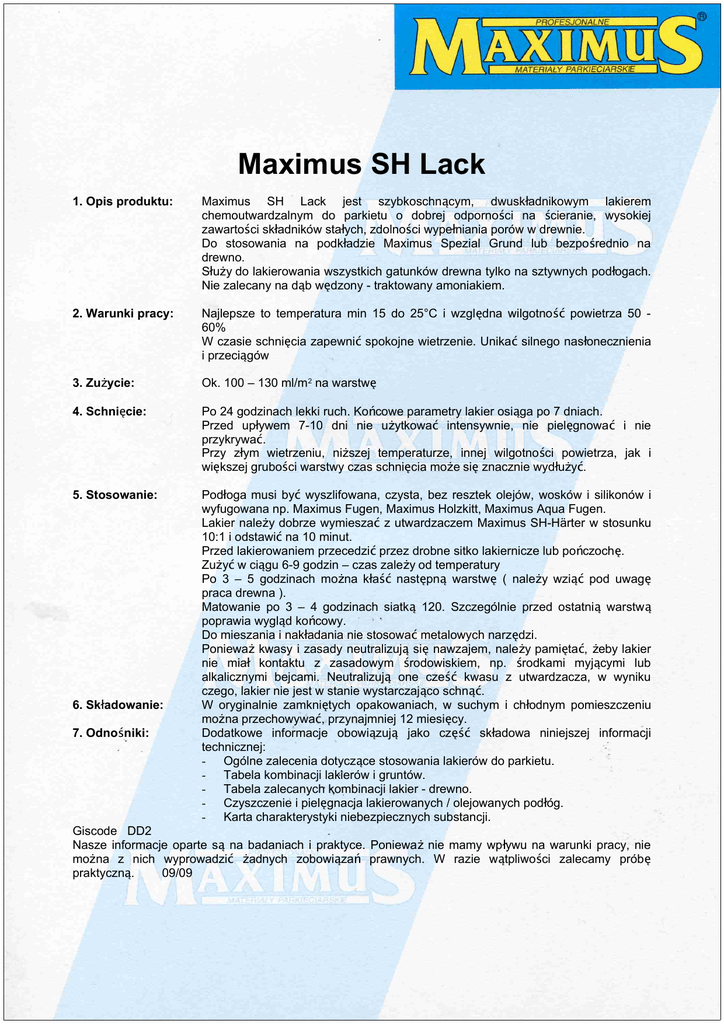 Maximus SH Lack 1. Opis produktu: Maximus SH Lack jest szybkoschnącym, dwuskładnikowym lakierem chemoutwardzalnym do parkietu o dobrej odporności na ścieranie, wysokiej zawartości składników stałych, zdolności wypełniania porów w drewnie. Do stosowania na podkładzie Maximus Spezial Grund lub bezpośrednio na drewno. Służy do lakierowania wszystkich gatunków drewna tylko na sztywnych podłogach. Nie zalecany na dąb wędzony - traktowany amoniakiem. 2. Warunki pracy: Najlepsze to temperatura min 15 do 25°C i względna wilgotność powietrza 50 60% W czasie schnięcia zapewnić spokojne wietrzenie. Unikać silnego nasłonecznienia i przeciągów 3. Zużycie: Ok. 100 – 130 ml/m2 na warstwę 4. Schnięcie: Po 24 godzinach lekki ruch. Końcowe parametry lakier osiąga po 7 dniach. Przed upływem 7-10 dni nie użytkować intensywnie, nie pielęgnować i nie przykrywać. Przy złym wietrzeniu, niższej temperaturze, innej wilgotno ści powietrza, jak i większej grubości warstwy czas schnięcia może się znacznie wydłużyć. 5. Stosowanie: Podłoga musi być wyszlifowana, czysta, bez resztek olejów, wosków i silikonów i wyfugowana np. Maximus Fugen, Maximus Holzkitt, Maximus Aqua Fugen. Lakier należy dobrze wymieszać z utwardzaczem Maximus SH-Härter w stosunku 10:1 i odstawić na 10 minut. Przed lakierowaniem przecedzić przez drobne sitko lakiernicze lub pończoch ę. Zużyć w ciągu 6-9 godzin – czas zależy od temperatury Po 3 – 5 godzinach można kłaść następną warstwę ( należy wziąć pod uwagę praca drewna ). Matowanie po 3 – 4 godzinach siatką 120. Szczególnie przed ostatni ą warstw ą poprawia wygląd końcowy. Do mieszania i nakładania nie stosować metalowych narzędzi. Ponieważ kwasy i zasady neutralizują się nawzajem, należy pamiętać, żeby lakier nie miał kontaktu z zasadowym środowiskiem, np. środkami myjącymi lub alkalicznymi bejcami. Neutralizują one cześć kwasu z utwardzacza, w wyniku czego, lakier nie jest w stanie wystarczająco schnąć. W oryginalnie zamkniętych opakowaniach, w suchym i chłodnym pomieszczeniu można przechowywać, przynajmniej 12 miesięcy. Dodatkowe informacje obowiązują jako część składowa niniejszej informacji technicznej: - Ogólne zalecenia dotyczące stosowania lakierów do parkietu. - Tabela kombinacji lakierów i gruntów. - Tabela zalecanych kombinacji lakier - drewno. - Czyszczenie i pielęgnacja lakierowanych / olejowanych podłóg. - Karta charakterystyki niebezpiecznych substancji. 6. Składowanie: 7. Odnośniki: Giscode DD2 Nasze informacje oparte są na badaniach i praktyce. Ponieważ nie mamy wpływu na warunki pracy, nie można z nich wyprowadzić żadnych zobowiązań prawnych. W razie wątpliwości zalecamy prób ę praktyczną. 09/09