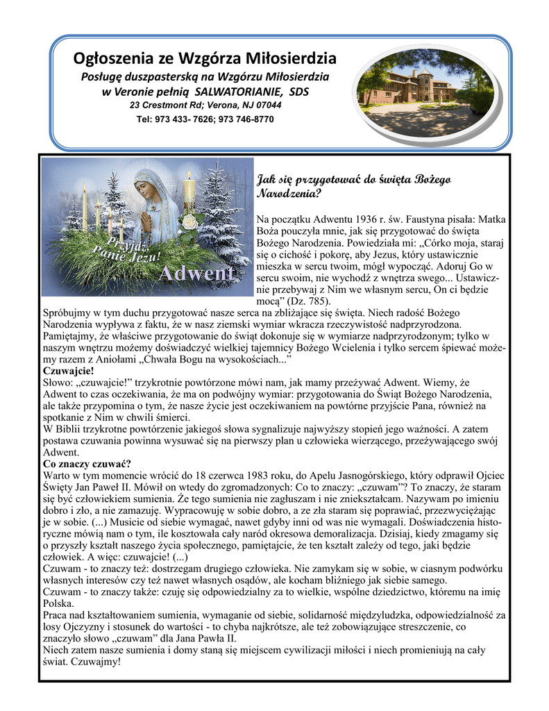 Ogłoszenia ze Wzgórza Miłosierdzia Posługę duszpasterską na Wzgórzu Miłosierdzia w Veronie pełnią SALWATORIANIE, SDS 23 Crestmont Rd; Verona, NJ 07044 Tel: 973 433- 7626; 973 746-8770 Jak się przygotować do więta Bożego Narodzenia? Na początku Adwentu 1936 r. w. Żaustyna pisałaŚ Matka Bo a pouczyła mnie, jak się przygotować do więta Bo ego Narodzenia. Powiedziała miŚ „Córko moja, staraj się o cicho ć i pokorę, aby Jezus, który ustawicznie mieszka w sercu twoim, mógł wypocząć. Adoruj żo w sercu swoim, nie wychod z wnętrza swego... Ustawicznie przebywaj z Nim we własnym sercu, On ci będzie mocą” (Dz. 785). Spróbujmy w tym duchu przygotować nasze serca na zbli ające się więta. Niech rado ć Bo ego Narodzenia wypływa z faktu, e w nasz ziemski wymiar wkracza rzeczywisto ć nadprzyrodzona. Pamiętajmy, e wła ciwe przygotowanie do wiąt dokonuje się w wymiarze nadprzyrodzonymś tylko w naszym wnętrzu mo emy do wiadczyć wielkiej tajemnicy Bo ego Wcielenia i tylko sercem piewać mo emy razem z Aniołami „Chwała Bogu na wysoko ciach...” Czuwajcie! SłowoŚ „czuwajcie!” trzykrotnie powtórzone mówi nam, jak mamy prze ywać Adwent. Wiemy, e Adwent to czas oczekiwania, e ma on podwójny wymiarŚ przygotowania do wiąt Bo ego Narodzenia, ale tak e przypomina o tym, e nasze ycie jest oczekiwaniem na powtórne przyj cie Pana, równie na spotkanie z Nim w chwili mierci. W Biblii trzykrotne powtórzenie jakiego słowa sygnalizuje najwy szy stopień jego wa no ci. A zatem postawa czuwania powinna wysuwać się na pierwszy plan u człowieka wierzącego, prze ywającego swój Adwent. Co znaczy czuwać? Warto w tym momencie wrócić do 18 czerwca 1983 roku, do Apelu Jasnogórskiego, który odprawił Ojciec więty Jan Paweł II. Mówił on wtedy do zgromadzonychŚ Co to znaczyŚ „czuwam”? To znaczy, że staram się być człowiekiem sumienia. e tego sumienia nie zagłuszam i nie zniekształcam. Nazywam po imieniu dobro i zło, a nie zamazuję. Wypracowuję w sobie dobro, a ze zła staram się poprawiać, przezwycię ając je w sobie. (...) Musicie od siebie wymagać, nawet gdyby inni od was nie wymagali. Do wiadczenia historyczne mówią nam o tym, ile kosztowała cały naród okresowa demoralizacja. Dzisiaj, kiedy zmagamy się o przyszły kształt naszego ycia społecznego, pamiętajcie, e ten kształt zale y od tego, jaki będzie człowiek. A więcŚ czuwajcie! (...) Czuwam - to znaczy te Ś dostrzegam drugiego człowieka. Nie zamykam się w sobie, w ciasnym podwórku własnych interesów czy te nawet własnych osądów, ale kocham bli niego jak siebie samego. Czuwam - to znaczy tak eŚ czuję się odpowiedzialny za to wielkie, wspólne dziedzictwo, któremu na imię Polska. Praca nad kształtowaniem sumienia, wymaganie od siebie, solidarno ć międzyludzka, odpowiedzialno ć za losy Ojczyzny i stosunek do warto ci - to chyba najkrótsze, ale te zobowiązujące streszczenie, co znaczyło słowo „czuwam” dla Jana Pawła II. Niech zatem nasze sumienia i domy staną się miejscem cywilizacji miło ci i niech promieniują na cały wiat. Czuwajmy! Msze więte 8 grudzieńŚ Niepokalane Poczęcie 8 AM i 7PM WeekendŚ Sobota o godzinie 5Ś00pm / Niedziela o godzinie 8Ś00am i 11Ś00am. Pierwszy Piątek Miesiąca CzuwanieŚ 6Ś00pm – Adoracja Naj więtszego Sakramentu 6Ś30pm – Nabożeństwo do Bożego Miłosierdzia 7Ś00pm – Msza w., , Modlitwa Różańcowa, Błogosławieństwo Eucharystyczne rodaŚ 6Ś00 PM wystawienie Naj więtszego Sakramentu i Nowenna do w Józefa 7PM Msza w PiątekŚ 6Ś00 PM wystawienie Naj więtszego Sakramentu i Nowenna do Miłosierdzia , 7PM Msza w W tygodniu Msze w od poniedziałku do piątkuŚ 8 AM Zapraszamy na Rekolekcje Adwentowe, które przeprowadzi ks Krystian Kolba SDS - 27 do 29 listopada Sobota 5 PM / niedziela o 8 i 11 AM Poniedziałek 7 PM / Wtorek 7 PM Poniedziałek I wtorek od 6PM -okazja do spowiedzi i adoracja Ofiara złożona w czasie rekolekcji będzie przeznaczona na nasze Seminarium w Bagnie. Za ofiary składamy serdeczne Bóg zapłać. Msze w w Wigilie i Boże Narodzenie W Wigilie nie ma Mszy w o godzinie 5 PM PasterkaŚ 12AM o północy. Dzien Bożego NarodzeniaŚ 8 AM i 11 AM 26 GrudzieńŚ 8 AM i 7 PM 31 Grudzień ( Sylwester)Ś 5PM Nowy 8 AM i RokŚ 11 AM