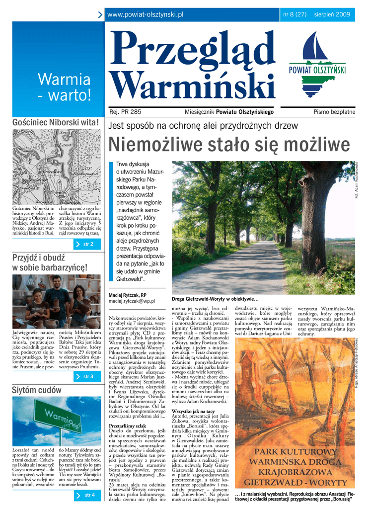 www.powiat-olsztynski.pl Rej. PR 285 nr 8 (27) Miesięcznik Powiatu Olsztyńskiego Gościniec Niborski wita! Jest sposób na ochronę alei przydrożnych drzew sierpień 2009 Pismo bezpłatne Niemożliwe stało się możliwe chce uczynić z tego kawałka historii Warmii atrakcję turystyczną. Z jego inicjatywy 5 września odbędzie się rajd rowerowy tą trasą. str 2 Przyjdź i obudź w sobie barbarzyńcę! Maciej Rytczak, RP [email protected] Jaćwięgowie nauczą Cię wojennego rzemiosła, popracujesz jako czeladnik garncarza, poduczysz się języka pruskiego, by na koniec zostać… może nie Prusem, ale z pew- nością Miłośnikiem Prusów i Przyjacielem Bałtów. Taka jest idea Dnia Prusów, który w sobotę 29 sierpnia w olsztyneckim skansenie organizuje Towarzystwo Pruthenia. str 3 Siytóm cudów Łoszaloł tan noród sprowdy łuż cołkam z tami cudami. Coluchno Polska ale i nosze tyż! Gazyta roztworzyć – tlo ło tam psiszó, w chtórno stróna byś w radyji nie pokranciuł, wszandzie tlo Mazury siódmy cud notury. Tylewizóra zapuszczać razu nie brok, bo tamój tyż tlo ło tam klepsió! Łoszalyć jidzie! Tlo my stare Warnijoki am sia przy zdrowam rozumnie łostali. str 4 Na konwencie powiatów, który odbył się 7 sierpnia, wszyscy starostowie województwa otrzymali płytę CD z prezentacją pt. „Park kulturowy. Warmińska droga krajobrazowa Gietrzwałd-Woryty”. Pilotażowy projekt zainicjowali przed kilkoma laty znani z zaangażowania w tematykę ochrony przydrożnych alei obecny dyrektor olsztyneckiego skansenu Marian Juszczyński, Andrzej Szeniawski, były wicestarosta olsztyński i Iwona Liżewska, dyrektor Regionalnego Ośrodka Badań i Dokumentacji Zabytków w Olsztynie. Od lat szukali oni kompromisowego rozwiązania problemu alei i... Przetarliśmy szlak Doszło do przełomu, jeśli chodzi o możliwość pogodzenia sprzecznych oczekiwań mieszkańców, samorządowców, drogowców i ekologów, a przede wszystkim ten projekt jest zgodny z prawem – przekonywała starostów Beata Samojłowicz, prezes Wspólnoty Kulturowej „Borussia”. 26 marca aleja na odcinku Gietrzwałd-Woryty otrzymała status parku kulturowego, dzięki czemu nie tylko nie Fot. Adam Kochanowski Droga Gietrzwałd-Woryty w obiektywie… można jej wyciąć, lecz odwrotnie – trzeba ją chronić. - Wspólnie z naukowcami i samorządowcami z powiatu i gminy Gietrzwałd przetarliśmy szlak – mówił na konwencie Adam Kochanowski z Woryt, radny Powiatu Olsztyńskiego i jeden z inicjatorów akcji. – Teraz chcemy podzielić się tą wiedzą z innymi. Zdaniem pomysłodawców uczynienie z alei parku kulturowego daje wiele korzyści. - Można wycinać chore drzewa i nasadzać młode, ubiegać się o środki europejskie na remont nawierzchni albo na budowę ścieżki rowerowej – wylicza Adam Kochanowski. Wszystko jak na tacy Autorką prezentacji jest Julia Żukowa, rosyjska wolontariuszka „Borussii”, która spędziła kilka miesięcy w Gminnym Ośrodku Kultury w Gietrzwałdzie. Julia zamieściła na płycie m.in. ustawę umożliwiającą powoływanie parków kulturowych, relacje medialne z realizacji projektu, uchwałę Rady Gminy Gietrzwałd dotyczącą zmian w planie zagospodarowania przestrzennego, a także komentarze specjalistów i materiały prasowe – słowem: całe „know-how”. Na płycie można też znaleźć listę ponad dwudziestu miejsc w województwie, które mogłyby zostać objęte statusem parku kulturowego. Nad realizacją pomysłu merytorycznie czuwał dr Dariusz Łaguna z Uni- wersytetu Warmińsko-Mazurskiego, który opracował zasady tworzenia parku kulturowego, zarządzania nim oraz sporządzania planu jego ochrony. Repr. obrazu Anastazji Fietisowej Gościniec Niborski to historyczny szlak prowadzący z Olsztyna do Nidzicy. Andrzej Małyszko, pasjonat warmińskiej historii z Rusi, Trwa dyskusja o utworzeniu Mazurskiego Parku Narodowego, a tymczasem powstał pierwszy w regionie „niezbędnik samorządowca”, który krok po kroku pokazuje, jak chronić aleje przydrożnych drzew. Przystępna prezentacja odpowiada na pytanie „jak to się udało w gminie Gietrzwałd”. … i z malarskiej wyobraźni. Reprodukcja obrazu Anastazji Fietisowej z okładki prezentacji przygotowanej przez „Borussię” 2 Chodź Pan na stronę nr 8 (27) 2009 Praktyczna szkoła życia Kolejny produkt turystyczny z warmińską duszą Isabel Weber Gościniec Niborski wita! się z nimi i staje się jasne, skąd biorą się zachwyty nad Polską i Polakami moich ziomków, którzy mieli okazję spędzić tu choćby kilka dni. Najbardziej uderza polska serdeczność i gościnność o wymiarze w Niemczech niespotykanym. Proponować koleżance z pracy pranie? Zapłacić za kogoś rachunek w knajpie? Tam czysta abstrakcja, tu oczywistość. Praca. Kolejny przykład olbrzymich różnic. Uczę się typowych postaw ludzi pracy, którzy zdają się działać wedle motto: improwizacja ponad wszystko. Planowanie? Zawracanie głowy. Powaga? Psuje klimat. Ale z pozornego chaosu wyłaniają się konkretne projekty. Poza tym: wywiad dla gazety? Proszę bardzo. Uścisk dłoni Lecha Wałęsy? Żaden problem. Moja niemiecka dusza nie nadąża… Ten styl życia dowodzi, jaką wartość dla Polaków ma wolność. I to jest piękne, bo dookoła dostrzegałam bardzo profesjonalnych i poważnych ludzi, którzy w przeciwieństwie do Niemców i mimo czasem trudniejszych warunków życia – potrafią się nim cieszyć. No i warmińska natura zasługująca na jedno słowo: upojna. Krajobrazy Warmii pozostaną na długo w mej pamięci. Dzięki pobytowi w Polsce dostrzegłam polską twarz. Jest to oblicze tak obce stereotypom, które panują w Niemczech, że aż wstyd się przyznać. Jest to kraj, w którym się zakochałam, kraj zamieszkany przez ludzi, których trzeba poznać! Tak oto moja czterotygodniowa praktyka zamieniła się we wspaniałą sześciotygodniową przygodę i nieocenioną szkołę życia. Isabel Webe