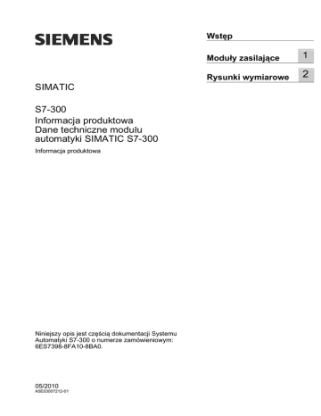 Wstęp SIMATIC S7-300 Informacja produktowa Dane techniczne modułu automatyki SIMATIC S7-300 Informacja produktowa Niniejszy opis jest częścią dokumentacji Systemu Automatyki S7-300 o numerze zamówieniowym: 6ES7398-8FA10-8BA0. 05/2010 A5E03007212-01 Moduły zasilające 1 Rysunki wymiarowe 2 Informacja prawna Ostrzeżenia używane w instrukcji Niniejsza instrukcja zawiera zalecenia których należy przestrzegać aby zapewnić bezpieczeństwo użytkowników i zapobiec szkodom materialnym. Uwagi dotyczące bezpieczeństwa personelu są wyróżnione w tekście przy pomocy symboli ostrzegawczych, uwagi dotyczące tylko szkód materialnych nie są oznaczone symbolem graficznym. Ostrzeżenia przedstawione poniżej są uszeregowane w kolejności odpowiadającej stopniowi zagrożenia. ZAGROŻENIE Sygnalizuje, że niestosowanie zasad bezpieczeństwa doprowadzi do śmierci lub poważnych obrażeń. OSTRZEŻENIE Sygnalizuje, że niestosowanie zasad bezpieczeństwa może doprowadzić do śmierci lub poważnych obrażeń. OSTRZEŻENIE z symbolem ostrzegawczym oznacza że niestosowanie zasad bezpieczeństwa może doprowadzić do niewielkich obrażeń. OSTROŻNIE bez symbolu ostrzegawczego oznacza że niestosowanie zasad bezpieczeństwa może doprowadzić do szkód materialnych. OSTROŻNIE sygnalizuje, że nieuwzględnienie przedstawionej informacji może doprowadzić do niepożądanych skutków lub sytuacji. Jeśli występuje więcej niż jeden rodzaj zagrożenia, wówczas użyte będzie ostrzeżenie informujące o najwyższym stopniu zagrożenia. Ostrzeżenie o możliwości obrażeń u ludzi wraz z symbolem ostrzegawczym może również zawierać ostrzeżenie o szkodach materialnych. Wykwalifikowany personel Urządzenie opisane w niniejszej dokumentacji może być obsługiwane tylko przez wykwalifikowany personel, przeszkolony dla wykonywania działań określonych w dokumentacji, zwłaszcza sygnalizowanych przez ostrzeżenia i zalecenia dotyczące bezpieczeństwa. Wykwalifikowanym personelem są osoby które w oparciu o szkolenia i doświadczenie potrafią rozpoznać ryzyko i uniknąć potencjalnych zagrożeń podczas pracy przy opisanych tu urządzeniach. Prawidłowe użytkowanie urządzeń Siemens Uwaga: OSTRZEŻENIE Urządzenia Siemens mogą być używane tylko do zastosowań opisanych w tej instrukcji oraz w odnośnej dokumentacji. Jeśli stosowane są urządzenia i podzespoły innych producentów, należy uzyskać dla nich zalecenie lub akceptację firmy Siemens. Prawidłowe działanie urządzeń można uzyskać zapewniając odpowiedni transport, przechowywanie, montaż, podłączenie, odbiór techniczny, użytkowanie i konserwację. Należy zapewnić odpowiednie warunki otoczenia i przestrzegać zaleceń podanych w dokumentacji. Znaki towarowe Wszystkie nazwy oznaczone symbolem ® są zarejestrowanymi nazwami towarowymi Siemens AG. Pozostałe nazwy towarowe stosowane w tej publikacji mogą być znakami których użycie przez strony trzecie dla ich własnych celów może naruszać prawa właścicieli Wykluczenie odpowiedzialności Treść niniejszej publikacji została sprawdzona aby zapewnić zgodność podanych informacji o urządzeniach i oprogramowaniu ze stanem faktycznym. Ponieważ nie można całkowicie wykluczyć rozbieżności, nie możemy zagwarantować całkowitej zgodności. Informacje podane w tej dokumentacji są regularnie sprawdzane i wszelkie niezbędne korekty będą wprowadzane w kolejnych wydaniach. Siemens Sp. z o.o. ul. Żupnicza 11 03-821 Warszawa A5E03007212-01 Ⓟ 05/2010 Prawa autorskie © Siemens AG 2010. Dane techniczne mogą ulec zmianie Wstęp Wprowadzenie Niniejsza informacja produktowa zastępuje instrukcję obsługi i dane techniczne modułowego systemu automatyki S7-300, wydanie 08/200 Nowe moduły zasilające Niniejsza informacja produktowa dotyczy następujących modułów zasilających: ● Moduł zasilający PS 307; 2A (6ES7307-1BA01-0AA0) ● Moduł zasilający PS 307; 5A (6ES7307-1EA01-0AA0) ● Moduł zasilający PS 307; 10A (6ES7307-1KA02-0AA0) Moduły zasilające charakteryzują się kompaktową konstrukcją i możliwością automatycznego włączania napięcia. Zastępują moduły o numerach katalogowych (zamówieniowych) 6ES7307-1BA00-0AA0, 6ES7307-1EA00-0AA0 oraz 6ES7307-1KA01-0AA0. Informacje dodatkowe Jeśli mają Państwo jakiekolwiek pytania odnośnie produktów opisanych w niniejszej informacji technicznej i nie znajdują odpowiedzi w tej dokumentacji, prosimy o kontakt z lokalnym przedstawicielem Siemens: www.siemens.com/automation/partner Dokumentacja techniczna urządzeń i systemów SIMATIC jest dostępna na stronach internetowych: www.siemens.com/simatic-tech-doku-portal Katalog internetowy i system zamawiania są dostępne w Internecie na stronie: www.siemens.com/automation/mall Wsparcie techniczne Kontakt z Działem Pomocy Technicznej dla wszystkich urządzeń Automatyki Przemysłowej: http://www.siemens.pl/simatic Dodatkowe informacje na temat Pomocy Technicznej Siemens są dostępne w Internecie: www.siemens.com/automation/service Informacja produktowa, dane techniczne modułów Systemu Automatyki SIMATIC S7-300 Informacja produktowa, 05/2010, A5E03007212-01 Str. 3 Obsługa i wsparcie przez Internet W uzupełnieniu dokumentacji oferujemy wszechstronną bazę wiedzy w Internecie www.siemens.com/automation/service&support Można tam znaleźć: ● Nasz Biuletyn, który stale dostarcza nowych informacji o naszych produktach. ● Wyszukiwanie dokumentacji przy użyciu przeglądarki Obsługi i Wsparcia. ● Elektroniczne forum użytkowników i ekspertów z całego świata, wymieniających wiedzę i doświadczenie. ● Bazę danych kontaktowych do lokalnego biura Automatyki i Napędów. ● Informacje o usługach na miejscu u Klienta, naprawach, częściach zamiennych i wiele innych danych. Spis treści Wstęp .................................................................................................................................