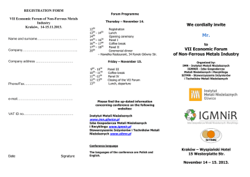 REGISTRATION FORM VII Economic Forum of Non-Ferrous Metals Industry Kraków, 14-15.11.2013. Name and surname………………………………. Company…………………………………………... Forum Programme Thursday – November 14. 1200 Registration 1300 - 1400 Lunch 1400 Opening ceremony 1430 – 1630 Panel I 1630 – 1700 Coffee break 1700 – 1830 Panel II 2000 Ceremonial dinner – Hawełka Restaurant, 34 Rynek Główny Str. Friday – November 15. Company address ....…………………………. Phone/Fax…………………………………….. e-mail…………………………………………… VAT ID no.……………………………………… 900 - 1030 1030 - 1100 1100 -1230 1230 -1300 1330 Panel III Coffee break Panel IV Closing of the VII Forum Lunch, departure We cordially invite Mr. to VII Economic Forum of Non-Ferrous Metals Industry Organized by: IMN - Instytut Metali Nieżelaznych IGMNiR - Izba Gospodarcza Metali Nieżelaznych i Recyklingu SITMN - Stowarzyszenie Inżynierów i Techników Metali Nieżelaznych Please find the up-dated information concerning conference on the following websites: Instytut Metali Nieżelaznych www.imn.gliwice.pl Izba Gospodarcza Metali Nieżelaznych i Recyklingu www.igmnir.pl Stowarzyszenie Inżynierów i Techników Metali Nieżelaznych www.sitmn.pl Conference language Date Signature The languages of the conference are Polish and English. Kraków – Wyspiański Hotel 15 Westerplatte Str. November 14 – 15. 2013. Conference secretariat THE VII FORUM PROGRAMME Panel I Policy and directions in non-ferrous metals industry development 1. KGHM PM policy and development directions – Herbert Wirth 2. Bolesław Zinc Group policy and development directions – Bogusław Ochab 3. Impexmetal Group policy and development directions – Arkadiusz Krężel 4. Policy and development directions in aluminium industry – Grzegorz Stulgis Panel II Non-Ferrous Metals Industry on European and global scale 1. Problems of non-ferrous metals industry development in European Union – Guy Thiran 2. New EU Programmes in the respect to mineral resources – Milan Grohol 3. Activity of ICSG and ILZSG Study Groups – Stewart Curtis 4. Economic problems of non-ferrous metals industry in EU – Marek Drosik Panel III National programmes 1. Activity of Polish Platform of Mineral Resources – Jan Kudełko 2. Accomplishment of key project “New technologies and new constructions of machines and equipment for enrichment and metallurgical processing of mineral resources” – Andrzej Chmielarz 3. Accomplishment of sector project “New materials and technologies of their production” – Mieczysław Woch Panel IV New technologies in non-ferrous metals industry 1. New technologies in the non-ferrous metals processing – Józef Zasadziński, Tadeusz Knych 2. Non-ferrous metals recycling – Markus Reuter 3. Metals of 21st Century – Henryk Karaś Stowarzyszenie Inżynierów i Techników Metali Nieżelaznych Sowinskiego 5, 44-100 GLIWICE phone 32/ 238 04 60 phone/fax 32/ 238 05 60 Maria Grzesik 509 210 251 e-mail: [email protected] Delegates interested in participation in the conference are requested to fill in the Registration Form and send it to Conference Secretariat before 31.10.2013. The conference fee including accommodation, full board, participation in sessions, conference proceedings is: 492 EUR – single room 369 EUR – without accommodation (Above prices include 23% VAT) Payments should be made to: Stowarzyszenie Inżynierów i Techników Metali Nieżelaznych Bank BGŻ Warszawa IBAN: PL87 2030 0045 1110 0000 0246 2630 SWIFT: GOPZPLPW with a note: „VII Forum” by October 31. 2013.