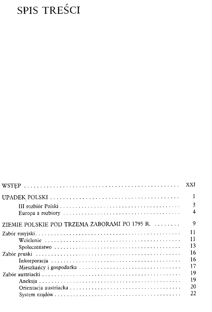 UPADEK POLSKI III rozbiór Polski Europa a rozbiory Z I E M I E P O L S K I E P O D T R Z E M A ZABORAMI PO 1795 R. Zabór rosyjski Wcielenie Społeczeństwo Zabór pruski Inkorporacja Mieszkańcy i gospodarka Zabór austriacki Aneksja Orientacja austriacka System rządów OD ZWĄTPIENIA DO WALKI O NIEPODLEGŁOŚĆ Polacy wobec klęski państwa Konspiracje na ziemiach polskich Centralizacja Lwowska Spisek Gorzkowskiego Rozbicie Centralizacji Towarzystwo Republikanów Polskich Emigracja po 1794 r. - Paryż, Wenecja, Drezno, Turcja . . Deputacja Polska Wyprawa Deniski „Z ziemi włoskiej do Polski" - legiony polskie 1797-1801. Idea i organizacja Kampania 1798-1799 Legia Naddunajska Czy Polacy wybić się mogą na niepodległość? Załamanie się orientacji francuskiej 1800-1802 . . . Koniec epopei Orientacja rosyjska Czartoryskiego 1801-1806 Napoleon a Polska Rozgromienie Prus w 1806 r Napoleon a sprawa polska Kościuszko a Napoleon Powstanie w Wielkopolsce Warszawa w 1806 r Komisja Rządząca Organizacja wojska polskiego Działania wojenne 1807 r Rosja wobec sprawy polskiej 1806-1807 KSIĘSTWO WARSZAWSKIE Odbudowa państwowości polskiej Tylża Konstytucja Księstwa Warszawskiego Dekret grudniowy 1807 r Rok 1809 Armia Księstwa Warszawskiego Polacy w Hiszpanii Wojna austriacko-polska 1809 r Raszyn Ofensywa galicyjska Rosja w 1809 r Pokój w Schónbrunn Życie gospodarcze Rolnictwo Handel Polityka wewnętrzna Edukacja Wojna 1812 r Sprawa polska w stosunkach francusko-rosyjskich 1810-1811 „Druga wojna polska" Litwa w 1812 r Katastrofa W obliczu klęski Napoleona Lipsk K O N G R E S W I E D E Ń S K I 1814-1815 Taktyka Aleksandra I Kongres pokojowy w Wiedniu Sprawa Księstwa Warszawskiego Traktat 1815 r K R Ó L E S T W O P O L S K I E 1815-1830 Organizacja i ustrój Utworzenie Królestwa Konstytucja z 1815 r Polityka Aleksandra I wobec Polaków Kraj i społeczeństwo Administracja Edukacja Stosunki polityczne Sprawa „ziem zabranych" Kaliszanie Obrona swobód konstytucyjnych Walka z opozycją Mikołaj I a Polska Gospodarka Reforma finansów Polityka handlowa Od manufaktury do przemysłu fabrycznego Warszawa Rolnictwo Kwestia włościańska Ruch niepodległościowy Organizacje studenckie w Królestwie Polskim Filomaci i filareci Wolnomularstwo Narodowe i Towarzystwo Patriotyczne Sąd Sejmowy Sprzysiężenie Wysockiego P O W S T A N I E L I S T O P A D O W E 1830-1831 Prolog Rewolucja we Francji i Belgii Przygotowania i decyzja o wybuchu powstania 29 listopada 1830 r Wybuch Władza na bruku Dyktatura Chłopickiego Europa wobec powstania Pierwsze akcje międzynarodowe Prusy Austria Francja Anglia Społeczeństwa Europy wobec powstania Rząd Narodowy 1831 r Ugrupowania polityczne „Nie ma Mikołaja!" Konstytucja Wódz naczelny Utworzenie Rządu Narodowego Wojna polsko-rosyjska Armia polska Gospodarcze zaplecze wojny Siły rosyjskie Ofensywa rosyjska Polska ofensywa wiosenna Wyprawa na Wołyń Ostrołęka Powstanie na „ziemiach zabranych" Litwa i Ruś w planach powstańczych „Ruś" w 1831 r Powstanie na Litwie Wyprawy Chłapowskiego, Giełguda i Dembińskiego na Litwę Polityka zagraniczna Cele polityki międzynarodowej powstania Ofensywa polityczna Kryzys Bilans akcji międzynarodowych Sytuacja wewnętrzna Wolność słowa Finanse i gospodarka Kwestia włościańska Załamanie i klęska powstania Utrata inicjatywy Upadek Rządu Narodowego Szturm Warszawy Sejm i Rząd Narodowy po upadku Warszawy Ostatnie działania wojska polskiego WIELKA EMIGRACJA Exodus Przemarsz do Francji Francja Nastroje Kształtowanie się politycznej organizacji emigracji Walka o przywództwo Ku rewolucji europejskiej Masoneria i karbonaryzm Hufiec Święty Zemsta Ludu Młoda Polska Konfederacja Narodu Polskiego Towarzystwo Demokratyczne Polskie Organizacja i ideologia Centralizacja Wielki Manifest Towarzystwa Demokratycznego Polskiego O przywództwo na emigracji Centralizacja wersalska a kraj Gromady Ludu Polskiego Hotel Lambert - obóz Czartoryskiego Związek Jedności Narodowej Król de facto O sprawę polską - międzynarodowa działalność Czartoryskiego Obrona Królestwa Polskiego Opinia publiczna Sprawa wschodnia Agencja wschodnia Rzym Ku powstaniu Partyzantka i wojna ludowa W O L N E M I A S T O K R A K Ó W 1815-1846 Status Organizacja i ustrój Życie polityczne Walka stronnictw Powstanie 1830-1831 Groźba likwidacji Konspiracja Obrona statusu Wolnego Miasta Gospodarka Handel tranzytowy Rzemiosło i przemysł Rolnictwo Kraków Mieszkańcy Przebudowa Oświata Uniwersytet G A L I C J A 1815-1846 Kraj Terytorium i ludność Administracja Rządy austriackie Polityka władz Wobec powstania 1830-1831 Szkolnictwo Lwów Stosunki gospodarczo-społeczne Przemysł - handel - komunikacja Poddaństwo chłopów i pańszczyzna Ukraiński ruch narodowy „Ruska Trójca" Początki ruchu politycznego Z I E M I E P O L S K I E P O D Z A B O R E M P R U S K I M 1815-1846 Wielkie Księstwo Poznańskie Organizacja Mieszkańcy Sytuacja gospodarcza Rolnictwo Regulacja stosunków włościańskich Przemysł i handel Państwo pruskie wobec Polaków Od „pojednania" do germanizacji Wobec powstania listopadowego Rząd Flottwella Praca organiczna Samomodernizacja Praca organiczna a ruch niepodległościowy Pomorze Gdańskie, Warmia i Mazury Kraj i gospodarka Stosunki ludnościowe i kwestia języka polskiego . Ruch polski Śląsk Rozwój gospodarczy Ludność polska POD RZĄDAMI M I K O Ł A J A I 1831-1855 Era paskiewiczowska w Królestwie Polskim Statut Organiczny z 1832 r System rządów Zemsta Mikołaja I Oświata Przemysł Rolnictwo „Uwolnić kmiotka od pańszczyzny" Społeczeństwo „Ziemie zabrane" 1832-1855 Polityka władz rosyjskich Likwidacja szkolnictwa polskiego Kościół katolicki Ograniczenie praw szlachty Wieś i dwór Polacy - Litwini - Białorusini Lojalizm i ugoda Polacy w Petersburgu RUCH KONSPIRACYJNY Konspiracje galicyjskie „Świętokrzyżcy" Litwa i Ukraina Złota książeczka księdza Ściegiennego Kra