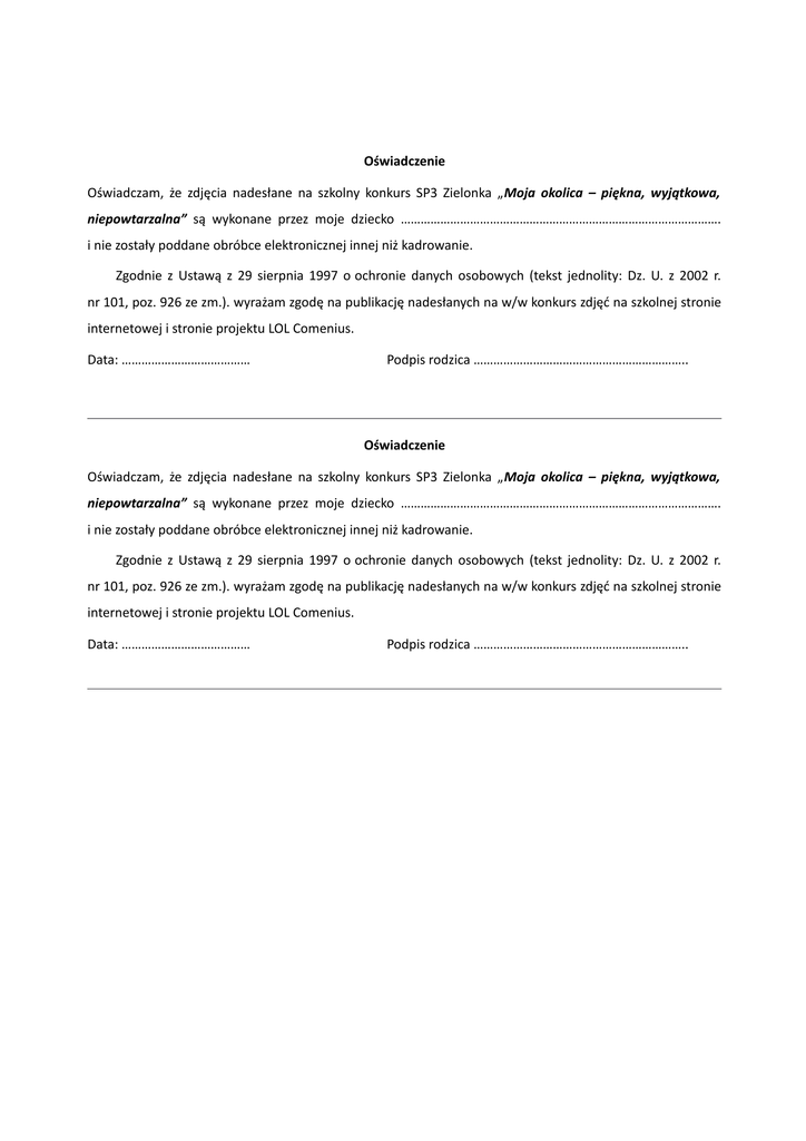 Oświadczenie Oświadczam, że zdjęcia nadesłane na szkolny konkurs SP3 Zielonka „Moja okolica – piękna, wyjątkowa, niepowtarzalna” są wykonane przez moje dziecko ……………………………………………………………………………………. i nie zostały poddane obróbce elektronicznej innej niż kadrowanie. Zgodnie z Ustawą z 29 sierpnia 1997 o ochronie danych osobowych (tekst jednolity: Dz. U. z 2002 r. nr 101, poz. 926 ze zm.). wyrażam zgodę na publikację nadesłanych na w/w konkurs zdjęć na szkolnej stronie internetowej i stronie projektu LOL Comenius. Data: ………………………………… Podpis rodzica ……………………………………………………….. Oświadczenie Oświadczam, że zdjęcia nadesłane na szkolny konkurs SP3 Zielonka „Moja okolica – piękna, wyjątkowa, niepowtarzalna” są wykonane przez moje dziecko ……………………………………………………………………………………. i nie zostały poddane obróbce elektronicznej innej niż kadrowanie. Zgodnie z Ustawą z 29 sierpnia 1997 o ochronie danych osobowych (tekst jednolity: Dz. U. z 2002 r. nr 101, poz. 926 ze zm.). wyrażam zgodę na publikację nadesłanych na w/w konkurs zdjęć na szkolnej stronie internetowej i stronie projektu LOL Comenius. Data: ………………………………… Podpis rodzica ………………………………………………………..