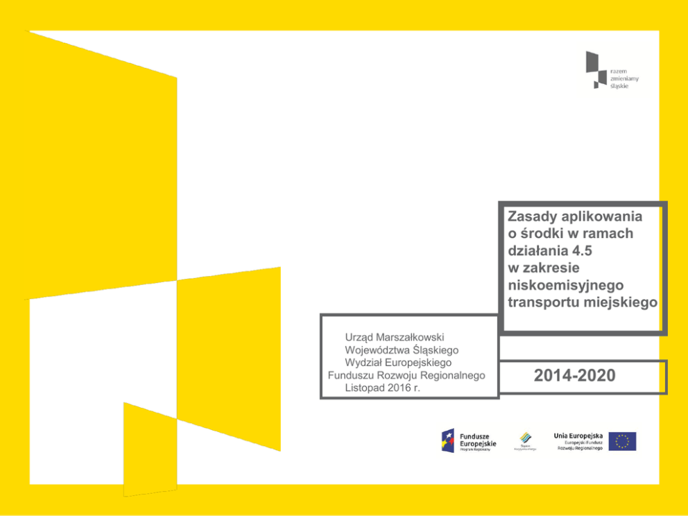 Zasady aplikowania o środki w ramach działania 4.5 w zakresie niskoemisyjnego transportu miejskiego Urząd Marszałkowski Województwa Śląskiego Wydział Europejskiego Funduszu Rozwoju Regionalnego Listopad 2016 r. 2014-2020 Alokacja na Działanie 4.5. Niskoemisyjny Transport miejski oraz efektywne oświetlenie Alokacja RPO WSL 2014-2020 - 3 476 937 134 EUR Działanie 4.5 – 448 607 765 Euro Poddziałanie 4.5.1 (ZIT) - 348 244 103 Euro Podziałanie 4.5.2 (RIT) - 62 363 662 Euro Podziałanie 4.5.3 (konkurs) - 38 000 000 Euro Nabory dla Działania 4.5 (Typ 1-3) w 2016 r. Publikacja ogłoszeń: 31 sierpnia br. Termin trwania naborów: 3 miesiące /30 września – 29 grudnia (do godziny 12.00) br. Planowane rozstrzygnięcie: kwiecień 2017 Alokacja EFRR przeznaczona na nabór w 2016 r.: ZIT (4.5.1) – 282 112 687,59 PLN (64 651 363 €) RIT Południowy (4.5.2) – 11 361 702,03 PLN (2 603 745,08 EUR) RIT Północny (4.5.2) – 44 267 172,92 PLN (10 144 645 EUR) RIT Zachodni (4.5.2) – 16 738 564,51 PLN (3 835 953 EUR) Poziom dofinansowania dla Działania 4.5 (Typ 1-3) w 2016 r. 95%, w tym 10% z budżetu państwa w przypadku projektów spełniających łącznie kryteria: 1) są projektami rewitalizacyjnymi, 2) nie są objęte pomocą publiczną, w tym rekompensatą 3) nie są objęte pomocą de minimis 4) nie są projektami generującymi dochód w rozumieniu art. 61 rozporządzenia nr 1303/2013 W pozostałych przypadkach 85%, bądź poziom wynikający z luki w finansowaniu, rekompensaty, pomocy de minimis lub zgodnie z zasadami udzielania pomocy publicznej. Poziom dofinansowania dla Działania 4.5 (Typ 1-3) w 2016 r. Beneficjenci 1. Jednostki samorządu terytorialnego oraz ich związki, których statutowym zadaniem jest wykonywanie ustawowych zadań jst w zakresie transportu publicznego. 2. Podmioty działające na zlecenie jednostek samorządu terytorialnego i ich związków, realizujące zadania z zakresu transportu publicznego, wybrane zgodnie z prawem zamówień publicznych. 3. Podmioty, w których większość udziałów posiada jednostka samorządu terytorialnego lub związek JST, realizujące na podstawie statutu zadania publiczne z zakresu transp. publ. Wskazane typy beneficjentów mogą realizować przedsięwzięcia w ramach projektów partnerskich w rozumieniu art. 33 ustawy z dnia 11 lipca 2014 r. o zasadach realizacji programów w zakresie polityki spójności finansowanych w perspektywie finansowej 2014–2020, jak również w ramach projektów hybrydowych w rozumieniu art. 34 ww. ustawy Działanie 4.5 Niskoemisyjny transport miejski oraz efektywne oświetlenie (Typ 1-3) Typy projektów Budowa, przebudowa liniowej i punktowej infrastruktury transportu zbiorowego (np. zintegrowane węzły przesiadkowe, drogi rowerowe, parkingi Park&Ride i Bike&Ride, buspasy, budowa systemów miejskich wypożyczalni rowerów wraz z zakupem rowerów). Wdrażanie inteligentnych systemów transportowych (ITS). Zakup taboru autobusowego na potrzeby transportu publicznego. Ograniczenia i limity w realizacji projektów oraz dodatkowe informacje: Aplikować o dofinansowanie mogą wnioskodawcy, których projekty będą realizowane odpowiednio na terenie Subregionu Centralnego, Subregionu Północnego, Subregionu Południowego, Subregionu Zachodniego. Maksymalny poziom wydatków na infrastrukturę drogową, włączającą budowane/przebudowywane centrum przesiadkowe (w zakresie niezwiązanym z bezpośrednią obsługą centrum przesiadkowego) do istniejącego układu ulicznego, nie może przekroczyć 20% całkowitych wydatków kwalifikowalnych projektu. Warunki ubiegania się o dofinansowanie W przypadku budowy buspasów, będących elementem kwalifikowalnym projektu 20 % ograniczenie procentowe nie obowiązuje. Przebudowa istniejącego układu ulicznego wynikającego z budowy buspasów jest kwalifikowalna do wsparcia w pełnym zakresie wyłącznie w przypadku ograniczenia ruchu samochodowego w centrum. Natomiast przebudowa/ budowa zewnętrznego pasa ruchu ze względu na wprowadzenie buspasa (nie wpływającego na ograniczenie ruchu samochodowego w centrum miasta) kwalifikuje się do wsparcia jedynie w zakresie niezbędnym do właściwej przebudowy drogi (np. krawężniki, studzienki, itd.) – nie jest natomiast możliwa przebudowa na całej szerokości drogi, gdyż nie jest to wymagane z uwagi na zasady sztuki budowlanej. Warunki ubiegania się o dofinansowanie W ramach działania będzie udzielane wsparcie wyłącznie na Inteligentne Systemy Sterowania ruchem zapewniające interoperacyjność stosowanych aplikacji zarządzania, wskazujące na systemowe usprawnienie komunikacji w regionie/mieście w tym SDIP. Projekt nie może polegać wyłącznie na wdrożeniu/zakupie systemu dynamicznej informacji pasażerskiej. W ramach 1. typu będą kwalifikować się wyłącznie przedsięwzięcia związane z kompleksową budową i przebudową zintegrowanych centrów przesiadkowych w tym dworców autobusowych i kolejowych, wraz z infrastrukturą towarzyszącą związaną z transportem zbiorowym (nie jest możliwa realizacja przedsięwzięć związanych z budową/przebudową pojedynczego obiektu infrastrukturalnego). Determinantem kwalifikowania inwestycji związanej z niskoemisyjnym transportem miejskim jest jego ścisłe powiązanie z węzłem przesiadkowym, w ramach którego będą prowadzone roboty związane z jego przebudową lub budową. Warunki ubiegania się o dofinansowanie Droga rowerowa będąca elementem szerszego projektu kwalifikowalna jest w przypadku pełnienia funkcji komunikacyjnej. Długość drogi rowerowej kwalifikującej się do wsparcia w promieniu 7 km (oddzielnie dla każdego odcinka) od generatora ruchu, tj. centrum przesiadkowego. Dopuszcza się możliwość wydłużenia promienia drogi rowerowej powyżej 7 km w miejscowościach, których dojazdy do najbliższego węzła przesiadkowego stwarzają duże zagrożenie dla bezpieczeństwa uczestników ruchu (budowa drogi rowerowej wzdłuż
