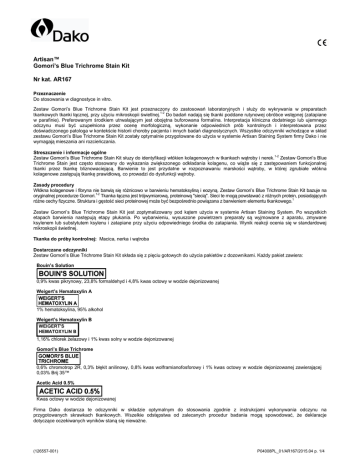 Artisan™ Gomori’s Blue Trichrome Stain Kit Nr kat. AR167 Przeznaczenie Do stosowania w diagnostyce in vitro. Zestaw Gomori’s Blue Trichrome Stain Kit jest przeznaczony do zastosowań laboratoryjnych i słuŜy do wykrywania w preparatach tkankowych tkanki łącznej, przy uŜyciu mikroskopii świetlnej.1-2 Do badań nadają się tkanki poddane rutynowej obróbce wstępnej (zatapiane w parafinie). Preferowanym środkiem utrwalającym jest obojętna buforowana formalina. Interpretacja kliniczna dodatniego lub ujemnego odczynu musi być uzupełniona przez ocenę morfologiczną, wykonanie odpowiednich prób kontrolnych i interpretowana przez doświadczonego patologa w kontekście historii choroby pacjenta i innych badań diagnostycznych. Wszystkie odczynniki wchodzące w skład zestawu Gomori’s Blue Trichrome Stain Kit zostały optymalnie przygotowane do uŜycia w systemie Artisan Staining System firmy Dako i nie wymagają mieszania ani rozcieńczania. Streszczenie i informacje ogólne Zestaw Gomori’s Blue Trichrome Stain Kit słuzy do identyfikacji włókien kolagenowych w tkankach wątroby i nerek.1-2 Zestaw Gomori’s Blue Trichrome Stain jest często stosowany do wykazania zwiększonego odkładania kolagenu, co wiąŜe się z zastępowaniem funkcjonalnej tkanki przez tkankę bliznowaciejącą. Barwienie to jest przydatne w rozpoznawaniu marskości wątroby, w której zgrubiałe włókna kolagenowe zastępują tkankę prawidłową, co prowadzi do dysfunkcji wątroby. Zasady procedury Włókna kolagenowe i fibryna nie barwią się róŜnicowo w barwieniu hematoksyliną i eozyną. Zestaw Gomori’s Blue Trichrome Stain Kit bazuje na oryginalnej procedurze Gomori.1-2 Tkanka łączna jest trójwymiarową, proteinową "siecią". Sieci te mogą powstawać z róŜnych protein, posiadających róŜne cechy fizyczne. Struktura i gęstość sieci proteinowej moŜe być bezpośrednio powiązana z barwieniem elementu tkankowego.1 Zestaw Gomori’s Blue Trichrome Stain Kit jest zoptymalizowany pod kątem uŜycia w systemie Artisan Staining System. Po wszystkich etapach barwienia następują etapy płukania. Po wybarwieniu, wysuszone powietrzem preparaty są wyjmowane z aparatu, zmywane ksylenem lub substytutem ksylenu i zatapiane przy uŜyciu odpowiedniego środka do zatapiania. Wynik reakcji ocenia się w standardowej mikroskopii świetlnej. Tkanka do próby kontrolnej: Macica, nerka i wątroba Dostarczane odczynniki Zestaw Gomori’s Blue Trichrome Stain Kit składa się z pięciu gotowych do uŜycia pakietów z dozownikami. KaŜdy pakiet zawiera: Bouin’s Solution 0,9% kwas pikrynowy, 23,8% formaldehyd i 4,8% kwas octowy w wodzie dejonizowanej Weigert’s Hematoxylin A 1% hematoksylina, 95% alkohol Weigert’s Hematoxylin B 1,16% chlorek Ŝelazowy i 1% kwas solny w wodzie dejonizowanej Gomori’s Blue Trichrome 0,6% chromotrop 2R, 0,3% błękit anilinowy, 0,8% kwas wolframianofosforowy i 1% kwas octowy w wodzie dejonizowanej zawierającej 0,03% Brij 35™ Acetic Acid 0.5% Kwas octowy w wodzie dejonizowanej Firma Dako dostarcza te odczynniki w składzie optymalnym do stosowania zgodnie z instrukcjami wykonywania odczynu na przygotowanych skrawkach tkankowych. Wszelkie odstępstwa od zalecanych procedur badania mogą spowodować, Ŝe deklaracje dotyczące oczekiwanych wyników staną się niewaŜne. (126557-001) P04008PL_01/AR167/2015.04 p. 1/4 Materiały wymagane, ale niedostarczane 1. Szkiełka mikroskopowe 2. Artisan Staining System 3. Wash Solution (nr kat. AR102) Środki ostroŜności 1. Do stosowania przez wyszkolony personel. 2. JeŜeli roztwór Bouina wyschnie, wówczas w przypadku uderzenia lub wzrostu temperatury moŜe dojść do rozkładu z reakcją wybuchową. 3. Unikać zanieczyszczeń mikrobiologicznych odczynnika. W przeciwnym razie moŜe dojść do nasilenia nieswoistego barwienia. 4. Po wykonaniu przewidzianej liczby testów opakowania mogą zawierać resztki odczynników. 5. Stosowanie innych od opisanych parametrów czasu inkubacji, temperatury lub metod, moŜe powodować błędne wyniki badania. UŜytkownik musi zweryfikować wszelkie odstępstwa w procedurze przewidzianej przez producenta. 6. Pakiety z odczynnikami, które nie są uŜywane w aparacie, naleŜy przechowywać w pozycji pionowej. 7. Pakiety z odczynnikami naleŜy przechowywać w miejscu nienaraŜonym na bezpośrednie działanie promieni słonecznych i z dala od źródeł ciepła. 8. Za ogólną regułę naleŜy przyjąć, Ŝe osoby poniŜej 18 lat nie mogą pracować z tym produktem. UŜytkowników naleŜy starannie poinstruować co do właściwych procedur pracy, niebezpiecznych własności produktu i środków ostroŜności. (Zgodnie z European Union Directive 94/33/EC). Dodatkowe informacje znajdują się w Karcie Charakterystyki Bezpieczeństwa Materiału (MSDS). 9. W celu uniknięcia kontaktu z oczami i skórą, naleŜy nosić odpowiednie osobiste wyposaŜenie ochronne. 10. Niewykorzystany odczynnik naleŜy usuwać zgodnie ze stosownymi przepisami lokalnymi i krajowymi. 11. Karta Charakterystyki Substancji Niebezpiecznej jest dostępna na Ŝądanie. Niebezpieczeństwo Bouin’s Solution: 10-30% formaldehyde, 1-5% kwas octowy, 0.1-1% 2,4,6-Trinitrophenol H302 + H312 + Działa szkodliwie po połknięciu, w kontakcie ze skórą lub w następstwie wdychania. H332 H314 Powoduje powaŜne oparzenia skóry oraz uszkodzenia oczu. H317 MoŜe powodować reakcję alergiczną skóry. H350 MoŜe powodować raka. H341 Podejrzewa się, Ŝe powoduje wady genetyczne. H335 MoŜe powodować podraŜnienie dróg oddechowych. P201 Przed uŜyciem zapoznać się ze specjalnymi środkami ostroŜności. P202 Nie uŜywać przed zapoznaniem się i zrozumieniem wszystkich środków bezpieczeństwa. P281 Stosować wymagane środki ochrony indywidualnej. P280 Stosować rękawice ochronne. Stosować ochronę oczu lub twarzy. P271 Stosować wyłącznie na zewnątrz lub w dobrze wentylowanym pomieszczeniu. P261 Unikać wdychania par. P27