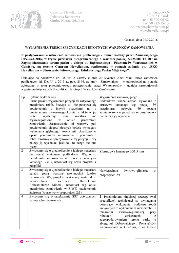 Gdańsk, dnia 01.09.2016 WYJAŚNIENIA TREŚCI SPECYFIKACJI ISTOTNYCH WARUNKÓW ZAMÓWIENIA w postępowaniu o udzielenie zamówienia publicznego - numer nadany przez Zamawiającego DPZ.26.6.2016, w trybie przetargu nieograniczonego o wartości poniżej 5.225.000 EURO na Zagospodarowanie terenu parku u zbiegu ul. Dąbrowskiego i Powstańców Warszawskich w Gdańsku, na terenie Centrum Hewelianum, realizowane w ramach zadania pn. „EKO Hewelianum – Utworzenie Pofortecznego, Edukacyjnego Parku Miejskiego”. Działając na podstawie art. 38 ust 2 ustawy z dnia 29 stycznia 2004 roku Prawo zamówień publicznych (tj. Dz. U. z 2015 r., poz. 2164, ze zm.) - Zamawiający - w odpowiedzi na pytania zgłoszone w toku przedmiotowego postępowania przez Wykonawców - udziela następujących wyjaśnień dotyczących Specyfikacji Istotnych Warunków Zamówienia Lp. 1 2 3 4 Pytanie wykonawcy Firma prosi o wyjaśnienie pozycji 40 załączonego przedmiaru robót. Pozycja ta nie pokrywa się powierzchnią z innymi pozycjami, np. z powierzchnią wykonanego koryta, a także w jej treści występuje inna warstwa nie wyszczególniona w opisie przedmiotu zamówienia. Zastosowanie tej warstwy pod powierzchnią ciągów pieszych będzie wymagało wykonania głębszego koryta niż określono w opisie przedmiotu zamówienia i przedmiarze robót. Prosimy o sprecyzowanie tej pozycji – czy należy ją wyceniać, jeśli tak to czego się ona tyczy Zwracamy się o ujednolicenie z jakiego materiału ma zostać wykonana podbudowa. Wg opisu przedmiotu zamówienia w SIWZ z kruszywa łamanego 0/31,5, natomiast wg opisu projektu z pospółki Zwracamy się o ujednolicenie z jakiego materiału należy górną warstwę nawierzchni ścieżek parkowych. Wg projektu wskazany materiał to nawierzchnia żwirowa HanseGrand Robust+Hanse Mineral, natomiast wg opisu przedmiotu zamówienia w SIWZ nawierzchnia żwirowa (kruszywo w proporcjach 2:1) Zwracamy się o przekazanie SST dotyczących nawierzchni żwirowych Wyjaśnienia zamawiającego Podbudowa winna zostać wykonana z kruszywa łamanego wg. pozycji 39 przedmiaru, pozycja 40 została zamieszczona w przedmiarze omyłkowo nie należy jej wyceniać Z kruszywa łamanego 0/31,5 mm Nawierzchnia proporcjach 2:1 żwirowo-gliniasta w 1. Przedmiotem niniejszej szczegółowej specyfikacji technicznej są wymagania dotyczące wykonania i odbioru robót związanych z wykonaniem nawierzchni z mieszanki żwirowo-gliniastej przy robotach związanych z zagospodarowaniem terenu parku u zbiegu ul. Dąbrowskiego i Powstańców warszawskich w Gdańsku, o na terenie Centrum Hewelianum. 2. Ustalenia dotyczą zasad prowadzenia robót związanych z wykonaniem nawierzchni gruntowej ulepszonej mechanicznie jako nawierzchnia z mieszanki żwiru (0/20mm) i gliny, przeznaczonej dla ruchu pieszych i pojazdów utrzymania, wykonanej jako warstwa grubości 5 cm ułożona na podbudowie z kruszywa łamanego stabilizowanego mechanicznie i wykończonej warstwą żwiru (2/8mm) o średniej grubości ok. 0,5 cm. 3. Do wykonania mieszanki żwirowo-gliniastej zaleca się stosowanie niżej wymienionych materiałów w proporcji 2:1: 3.1. Kruszywa naturalne o uziarnieniu do 20 mm (żwiry, piaski), odpady kruszywa łamanego o fakcjach 0-4 mm. 3.2. Grunty gliniaste w postaci naturalnej lub sproszkowanej. 4. Wilgotność optymalna mieszanki winna wynosić 6,6%. 5. Mieszanie składników należy wykonywać mechanicznie do czasu uzyskania jednolitej barwy i struktury nawierzchni. Nie dopuszczalne jest mieszanie składników bezpośrednio w miejscu robót. 6. Gotowa mieszanka żwirowogliniasta winna być rozkładana na wyprofilowanej podbudowie, w warstwie o jednakowej grubości, przy użyciu równiarki. Grubość rozłożonej warstwy winna być wystarczająca do zapewnienia po zagęszczeniu grubości projektowanej. Przed rozpoczęciem zagęszczania należy sprawdzić wilgotność mieszanki – w przypadku gdy jest ona wyższa o więcej niż 2% od wilgotności optymalnej, mieszankę należy osuszyć, w przypadku gdy jest niższa o więcej niż 2% - należy dodać wody. Ze względu na wrażliwość mieszanki żwirowo-gliniastej na opady atmosferyczne w czasie jej wbudowywania, w czasie opadów roboty należy przerwać. Niezagęszczona mieszanka nie może być narażona na działanie gwałtownego deszczu bądź na przemrożenie – w takich sytuacjach należy uformować ją w pryzmę i przykryć folią. Zagęszczanie nawierzchni o przekroju daszkowym należy rozpocząć od krawędzi i stopniowo przesuwać pasami podłużnymi częściowo nakładającymi się, w kierunku osi ścieżki. Zagęszczenie nawierzchni o spadku jednostronnym, należy rozpocząć od dolnej krawędzi i stopniowo przesuwać pasami podłużnymi częściowo nakładającymi się w kierunku krawędzi górnej. Zagęszczenie należy kontynuować do osiągniecia wskaźnika zagęszczenia co najmniej 0,98. Dla ochrony obrzeży z koski granitowej przed zanieczyszczeniem mieszanką, zaleca się okładanie obrzeży deskami ustawionymi rębem lub folią. Nawierzchnia gruntowa z mieszanki optymalnej, okresie 4-6 tygodni od wykonania, winna być chroniona przez ograniczenie prędkości pojazdów do 15 km/h oraz równomiernie dogęszczana. W pierwszych dniach po wykonaniu nawierzchni należy dbać, aby była ona stale wilgotna, zraszając ją w razie potrzeby wodą. Nawierzchnia żwirowo-gliniasta, po oddaniu jej do eksploatacji, powinna być pielęgnowana. Pojawiające się wklęśnięcia należy wyrównywać kruszywem, po uprzednim wzruszeniu nawierzchni za pomocą oskardów. W przypadku tworzenia się wybojów – uszkodzone miejsca należy wyciąć pionowo i usunąć, dosypać świeżej mieszanki optymalnej a następnie ją wyprofilować i zagęścić wibratorem płytowym lub ręcznym ubijakiem. 7. Nierówności podłużne nawierzchni należy mierzyć 4-metrową łatą, co 20 m – nie powinny one przekraczać 12 mm, natomiast nierówności poprzeczne należy mierzyć 2-met