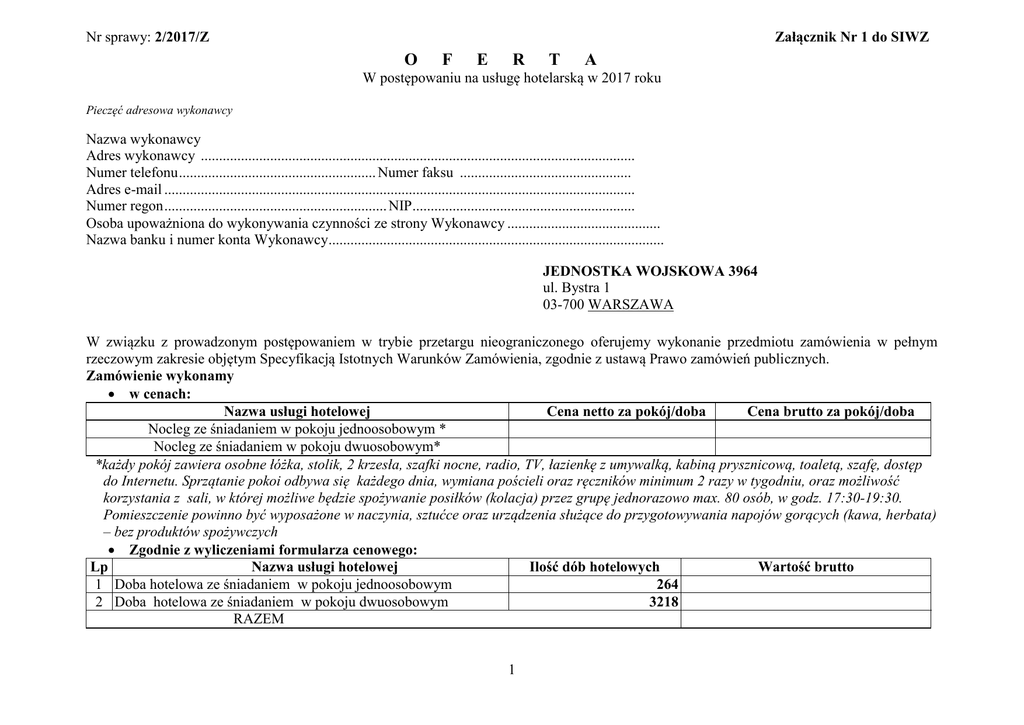 Załącznik Nr 1 do SIWZ Nr sprawy: 2/2017/Z O F E R T A W postępowaniu na usługę hotelarską w 2017 roku Pieczęć adresowa wykonawcy Nazwa wykonawcy Adres wykonawcy ....................................................................................................................... Numer telefonu ...................................................... Numer faksu ............................................... Adres e-mail ................................................................................................................................. Numer regon ............................................................. NIP ............................................................. Osoba upoważniona do wykonywania czynności ze strony Wykonawcy .......................................... Nazwa banku i numer konta Wykonawcy............................................................................................ JEDNOSTKA WOJSKOWA 3964 ul. Bystra 1 03-700 WARSZAWA W związku z prowadzonym postępowaniem w trybie przetargu nieograniczonego oferujemy wykonanie przedmiotu zamówienia w pełnym rzeczowym zakresie objętym Specyfikacją Istotnych Warunków Zamówienia, zgodnie z ustawą Prawo zamówień publicznych. Zamówienie wykonamy w cenach: Nazwa usługi hotelowej Cena netto za pokój/doba Cena brutto za pokój/doba Nocleg ze śniadaniem w pokoju jednoosobowym * Nocleg ze śniadaniem w pokoju dwuosobowym* *każdy pokój zawiera osobne łóżka, stolik, 2 krzesła, szafki nocne, radio, TV, łazienkę z umywalką, kabiną prysznicową, toaletą, szafę, dostęp do Internetu. Sprzątanie pokoi odbywa się każdego dnia, wymiana pościeli oraz ręczników minimum 2 razy w tygodniu, oraz możliwość korzystania z sali, w której możliwe będzie spożywanie posiłków (kolacja) przez grupę jednorazowo max. 80 osób, w godz. 17:30-19:30. Pomieszczenie powinno być wyposażone w naczynia, sztućce oraz urządzenia służące do przygotowywania napojów gorących (kawa, herbata) – bez produktów spożywczych Zgodnie z wyliczeniami formularza cenowego: Lp Nazwa usługi hotelowej Ilość dób hotelowych Wartość brutto 1 Doba hotelowa ze śniadaniem w pokoju jednoosobowym 264 2 Doba hotelowa ze śniadaniem w pokoju dwuosobowym 3218 RAZEM 1 Załącznik Nr 1 do SIWZ Nr sprawy: 2/2017/Z O F E R T A W postępowaniu na usługę hotelarską w 2017 roku WARTOŚĆ OFERTY: brutto (z VAT) ....................... zł, słownie: .................................................................................................. w tym wysokość podatku VAT: ……% w terminie: do dnia 22 grudnia 2017 roku w miejscu: (nazwa i adres hotelu) ………………………………………………………………………………………………………………………………………………… Sumaryczny czas dojazdu linią autobusową (A), tramwajową (T) lub metrem (M) /zgodnie z rozkładem jazdy ZTM/ z hotelu do przystanku Szwoleżerów 01, 02 lub 04 (skrzyżowanie z ul. 29-Listopada) wynosi …..…. minut, w tym są ……… przesiadki na tym samym przystanku. Sumaryczny czas dojazdu linią autobusową (A), tramwajową (T) lub metrem (M) /zgodnie z rozkładem jazdy ZTM/ z przystanku Szwoleżerów 01, 02 lub 04 (skrzyżowanie z ul. 29-Listopada) do hotelu wynosi …..…. minut, w tym są ……… przesiadki na tym samym przystanku. Oświadczamy, że: 1. Oferowany przez nas przedmiot zamówienia spełnia wymagania określone przez Zamawiającego w Specyfikacji Istotnych Warunków Zamówienia. 2. Załączone do oferty dokumenty opisują stan prawny i faktyczny, aktualny na dzień otwarcia ofert (odpowiedzialność karna na podstawie art. 233 kk). 3. Zapoznaliśmy się ze Specyfikacją Istotnych Warunków Zamówienia i nie wnosimy do niej żadnych zastrzeżeń oraz zdobyliśmy konieczne informacje potrzebne do sporządzenia oferty i właściwego wykonania zamówienia. 4. Wyżej wskazany numer faksu i adres e-mail są odpowiednie do przekazywania nam informacji dotyczących postępowania. 5. W cenie oferty zostały uwzględnione wszystkie koszty wykonania zamówienia i realizacji przyszłego świadczenia umownego. 6. Wszystkie ceny zostały ustalone na okres obowiązywania umowy i nie będą podlegały podwyższeniu; 7. Akceptujemy dołączony do Specyfikacji Istotnych Warunków Zamówienia projekt umowy i zobowiązujemy się w przypadku wyboru naszej oferty do zawarcia umowy na warunkach w niej określonych, a także w miejscu i terminie wyznaczonym przez Zamawiającego. 8. Uważamy się za związanych niniejszą ofertą na okres wskazany w Specyfikacji Istotnych Warunków Zamówienia. 9. Akceptujemy termin i formę zapłaty. 10. * Nie zamierzamy/zamierzamy* powierzyć podwykonawcom żadnej części zamówienia, (jeżeli wykonawca zamierza powierzyć wykonanie części zamówienia podwykonawcom, należy w odrębnym dokumencie wskazać część lub części, których wykonanie będzie powierzone podwykonawcom). 2 Załącznik Nr 1 do SIWZ Nr sprawy: 2/2017/Z O F E R T A W postępowaniu na usługę hotelarską w 2017 roku 13. *Oświadczamy, na podstawie art. 8 ust. 3 ustawy Pzp, że żadne z informacji zawartych w ofercie nie stanowią tajemnicy przedsiębiorstwa w rozumieniu przepisów o zwalczaniu nieuczciwej konkurencji* / Oświadczamy, na podstawie art. 8 ust. 3 ustawy, że wskazane poniżej informacje zawarte w ofercie stanowią tajemnicę przedsiębiorstwa w rozumieniu przepisów o zwalczaniu, nieuczciwej konkurencji i w związku z niniejszym nie mogą być one udostępniane, w szczególności innym uczestnikom postępowania L p 1 2 3 Oznaczenie rodzaju informacji od Strony w ofercie (wyrażone cyfrą) do 14. Oświadczamy, że nasza firma należy/nie należy* do grupy kapitałowej w rozumieniu ustawy z dnia 16 lutego 2007r. o ochronie konkurencji i konsumentów (Dz. U. Nr 50, poz. 331, z późn. zm.3). (oświadczenie wynikające z art. 24 ust 1 pkt 23 ustawy Prawo zamówień pu