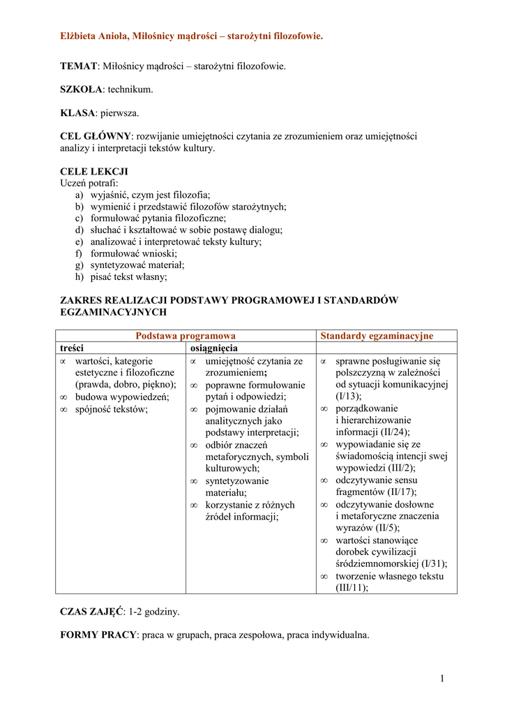 Elżbieta Anioła, Miłośnicy mądrości – starożytni filozofowie. TEMAT: Miłośnicy mądrości – starożytni filozofowie. SZKOŁA: technikum. KLASA: pierwsza. CEL GŁÓWNY: rozwijanie umiejętności czytania ze zrozumieniem oraz umiejętności analizy i interpretacji tekstów kultury. CELE LEKCJI Uczeń potrafi: a) wyjaśnić, czym jest filozofia; b) wymienić i przedstawić filozofów starożytnych; c) formułować pytania filozoficzne; d) słuchać i kształtować w sobie postawę dialogu; e) analizować i interpretować teksty kultury; f) formułować wnioski; g) syntetyzować materiał; h) pisać tekst własny; ZAKRES REALIZACJI PODSTAWY PROGRAMOWEJ I STANDARDÓW EGZAMINACYJNYCH Podstawa programowa treści osiągnięcia • wartości, kategorie • umiejętność czytania ze estetyczne i filozoficzne zrozumieniem; (prawda, dobro, piękno); • poprawne formułowanie pytań i odpowiedzi; • budowa wypowiedzeń; • spójność tekstów; • pojmowanie działań analitycznych jako podstawy interpretacji; • odbiór znaczeń metaforycznych, symboli kulturowych; • syntetyzowanie materiału; • korzystanie z różnych źródeł informacji; Standardy egzaminacyjne • • • • • • • sprawne posługiwanie się polszczyzną w zależności od sytuacji komunikacyjnej (I/13); porządkowanie i hierarchizowanie informacji (II/24); wypowiadanie się ze świadomością intencji swej wypowiedzi (III/2); odczytywanie sensu fragmentów (II/17); odczytywanie dosłowne i metaforyczne znaczenia wyrazów (II/5); wartości stanowiące dorobek cywilizacji śródziemnomorskiej (I/31); tworzenie własnego tekstu (III/11); CZAS ZAJĘĆ: 1-2 godziny. FORMY PRACY: praca w grupach, praca zespołowa, praca indywidualna. 1 Elżbieta Anioła, Miłośnicy mądrości – starożytni filozofowie. METODY PRACY: metoda tekstu przewodniego, „burza mózgów”, analiza problemowa, mapa myślowa. ŚRODKI DYDAKTYCZNE: Platon „Ludzie w jaskini”, Seneka „O życiu szczęśliwym”, Arystoteles „Etyka nikomachejska”, „Słownik języka polskiego”, „Słownik terminów literackich”, „Słownik filozoficzny”, papier, projektor, komputer, ekran. PRZEBIEG ZAJĘĆ: 1. Nauczyciel określa cele zajęć, zapoznaje z planem lekcji, podaje temat. 2. Czym jest filozofia? – uczniowie poprzez „burzę mózgów” odpowiadają na pytanie. Określają znaczenie filozofii w życiu człowieka. Nauczyciel zwraca uwagę na genezę pojęcia: gr. philosophia (umiłowanie mądrości) – philo (lubię) i sophia (mądrość). 3. Dziedziny filozofii: logika, epistemologia, etyka, estetyka, metafizyka. Uczniowie wyjaśniają pojęcia i zapisują wnioski w tabeli: Dziedziny filozofii EPISTEMOLOGIA LOGIKA ETYKA ESTETYKA METAFIZYKA metody, granice reguły opis i problemy poszukuje poznania; poprawnego analiza piękna i odpowiedzi na sztuki; pytanie o istotę wnioskowania; norm leżących u bytu; podstaw ludzkich zachowań; 4. Starożytni myśliciele (Sokrates, Platon, Arystoteles, Seneka, Epikur) – prezentacja pracy domowej uczniów. 5. Rafael Santi „Szkoła ateńska” – czytanie obrazu będące nawiązaniem do przedstawionych filozofów. 2 Elżbieta Anioła, Miłośnicy mądrości – starożytni filozofowie. 6. Szkolne dialogi z filozofami starożytnymi - świat wartości. Uczniowie pracują w grupach. Otrzymują fragmenty tekstów filozoficznych Platona, Seneki i Arystotelesa oraz kartki z poleceniami do analizy utworów: PLATON „Ludzie w jaskini” a) Opisz w kilku zdaniach przedstawioną w tekście sytuację? b) Co symbolizuje jaskinia? SENEKA „O życiu szczęśliwym” a) Jakie warunki, według Seneki, muszą być spełnione, by życie człowieka było szczęśliwe? b) W formie zaleceń przekaż życiowe przesłanie Seneki. ARYSTOTELES „Etyka nikomachejska” a) Na podstawie tekstu Arystotelesa zdefiniuj pojęcia: dobro, szczęście. b) Określ, do jakiego celu, zdaniem Arystotelesa, dąży w swoim życiu człowiek. 7. Prezentacja pracy uczniów. 8. Podsumowanie – jakie wartości są ważne w życiu człowieka zdaniem miłośników mądrości starożytnej? Uczniowie tworzą mapę myślową: 3 Elżbieta Anioła, Miłośnicy mądrości – starożytni filozofowie. dobro szczęście prawda rozum natura piękno Wartości ważne w życiu człowieka… harmonia wewnętrzna pokój radość moralność stoicki spokój 9. Zadanie domowe: a) Jeden z aforyzmów (strona 149) uczyń mottem dialogu z wybranym filozofem starożytnym. b) Rozwiń myśl Platona: „Myśleć to co prawdziwe, czuć to co piękne i kochać co dobre – w tym cel rozumnego życia.” 4