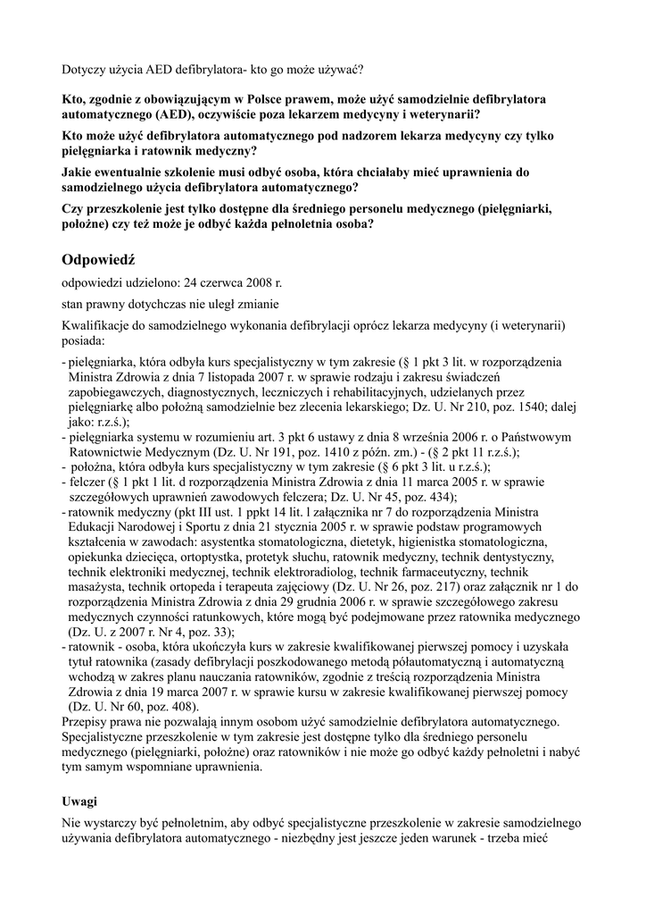 Dotyczy użycia AED defibrylatora- kto go może używać? Kto, zgodnie z obowiązującym w Polsce prawem, może użyć samodzielnie defibrylatora automatycznego (AED), oczywiście poza lekarzem medycyny i weterynarii? Kto może użyć defibrylatora automatycznego pod nadzorem lekarza medycyny czy tylko pielęgniarka i ratownik medyczny? Jakie ewentualnie szkolenie musi odbyć osoba, która chciałaby mieć uprawnienia do samodzielnego użycia defibrylatora automatycznego? Czy przeszkolenie jest tylko dostępne dla średniego personelu medycznego (pielęgniarki, położne) czy też może je odbyć każda pełnoletnia osoba? Odpowiedź odpowiedzi udzielono: 24 czerwca 2008 r. stan prawny dotychczas nie uległ zmianie Kwalifikacje do samodzielnego wykonania defibrylacji oprócz lekarza medycyny (i weterynarii) posiada: - pielęgniarka, która odbyła kurs specjalistyczny w tym zakresie (§ 1 pkt 3 lit. w rozporządzenia Ministra Zdrowia z dnia 7 listopada 2007 r. w sprawie rodzaju i zakresu świadczeń zapobiegawczych, diagnostycznych, leczniczych i rehabilitacyjnych, udzielanych przez pielęgniarkę albo położną samodzielnie bez zlecenia lekarskiego; Dz. U. Nr 210, poz. 1540; dalej jako: r.z.ś.); - pielęgniarka systemu w rozumieniu art. 3 pkt 6 ustawy z dnia 8 września 2006 r. o Państwowym Ratownictwie Medycznym (Dz. U. Nr 191, poz. 1410 z późn. zm.) - (§ 2 pkt 11 r.z.ś.); - położna, która odbyła kurs specjalistyczny w tym zakresie (§ 6 pkt 3 lit. u r.z.ś.); - felczer (§ 1 pkt 1 lit. d rozporządzenia Ministra Zdrowia z dnia 11 marca 2005 r. w sprawie szczegółowych uprawnień zawodowych felczera; Dz. U. Nr 45, poz. 434); - ratownik medyczny (pkt III ust. 1 ppkt 14 lit. l załącznika nr 7 do rozporządzenia Ministra Edukacji Narodowej i Sportu z dnia 21 stycznia 2005 r. w sprawie podstaw programowych kształcenia w zawodach: asystentka stomatologiczna, dietetyk, higienistka stomatologiczna, opiekunka dziecięca, ortoptystka, protetyk słuchu, ratownik medyczny, technik dentystyczny, technik elektroniki medycznej, technik elektroradiolog, technik farmaceutyczny, technik masażysta, technik ortopeda i terapeuta zajęciowy (Dz. U. Nr 26, poz. 217) oraz załącznik nr 1 do rozporządzenia Ministra Zdrowia z dnia 29 grudnia 2006 r. w sprawie szczegółowego zakresu medycznych czynności ratunkowych, które mogą być podejmowane przez ratownika medycznego (Dz. U. z 2007 r. Nr 4, poz. 33); - ratownik - osoba, która ukończyła kurs w zakresie kwalifikowanej pierwszej pomocy i uzyskała tytuł ratownika (zasady defibrylacji poszkodowanego metodą półautomatyczną i automatyczną wchodzą w zakres planu nauczania ratowników, zgodnie z treścią rozporządzenia Ministra Zdrowia z dnia 19 marca 2007 r. w sprawie kursu w zakresie kwalifikowanej pierwszej pomocy (Dz. U. Nr 60, poz. 408). Przepisy prawa nie pozwalają innym osobom użyć samodzielnie defibrylatora automatycznego. Specjalistyczne przeszkolenie w tym zakresie jest dostępne tylko dla średniego personelu medycznego (pielęgniarki, położne) oraz ratowników i nie może go odbyć każdy pełnoletni i nabyć tym samym wspomniane uprawnienia. Uwagi Nie wystarczy być pełnoletnim, aby odbyć specjalistyczne przeszkolenie w zakresie samodzielnego używania defibrylatora automatycznego - niezbędny jest jeszcze jeden warunek - trzeba mieć odpowiednie wykształcenie medyczne lub być ratownikiem zatrudnionym lub pełniącym służbę w jednostkach współpracujących z systemem państwowego ratownictwa medycznego lub będącym członkiem tych jednostek. Na podstawie opinii prawnej Wojciech Suseł Z-ca dyr. d/s lecznictwa