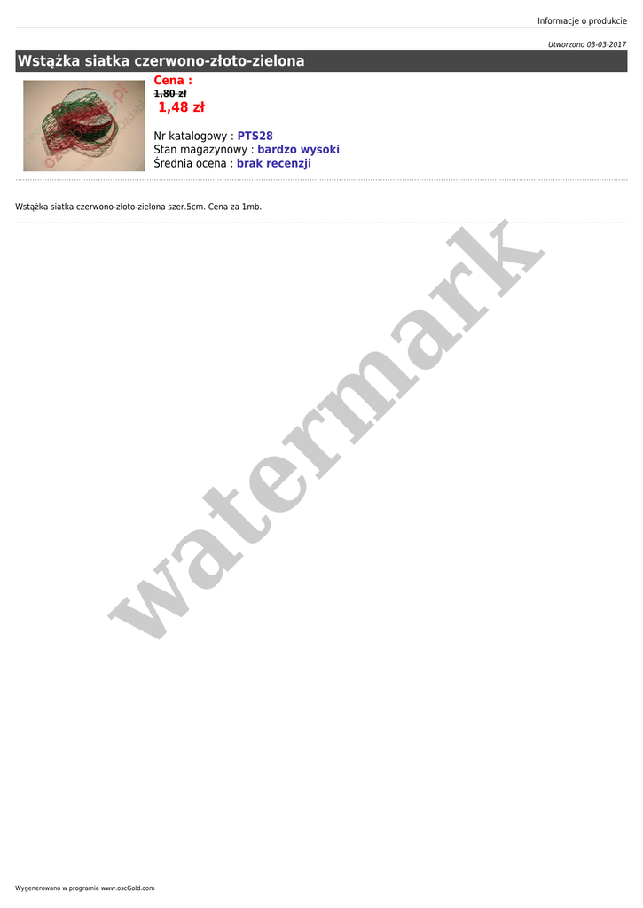 Informacje o produkcie Utworzono 03-03-2017 Wstążka siatka czerwono-złoto-zielona Cena : 1,80 zł 1,48 zł Nr katalogowy : PTS28 Stan magazynowy : bardzo wysoki Średnia ocena : brak recenzji w at er m ar k Wstążka siatka czerwono-złoto-zielona szer.5cm. Cena za 1mb. Wygenerowano w programie www.oscGold.com