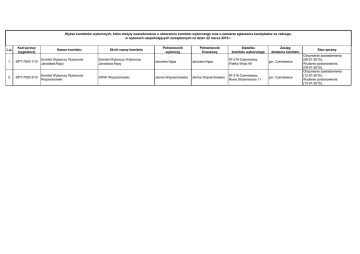 Wykaz komitetów wyborczych, które złożyły zawiadomienia o utworzeniu komitetu wyborczego oraz o zamiarze zgłaszania kandydatów na radnego, w wyborach uzupełniających zarządzonych na dzien 22 marca 2015 r. Pełnomocnik wyborczy Pełnomocnik finansowy Kod sprawy (sygnatura) 1. DPT-7503-1/15 Komitet Wyborczy Wyborców Jarosława Kępy Komitet Wyborczy Wyborców Jarosława Kępy Jarosław Kępa Jarosław Kępa 97-216 Czerniewice, Wielka Wola 49 gm. Czerniewice 2. DPT-7503-3/15 Komitet Wyborczy Wyborców Wojciechowski KWW Wojciechowski Janina Wojciechowska Janina Wojciechowska 97-216 Czerniewice, Nowa Strzemeszna 11 gm. Czerniewice Nazwa komitetu Skrót nazwy komitetu Siedziba komitetu wyborczego Zasięg działania komitetu L.p. Stan sprawy Otrzymanie zawiadomienia (08-01-2015), Wydanie postanowienia (09-01-2015). Otrzymanie zawiadomienia (12-01-2015), Wydanie postanowienia (13-01-2015).
